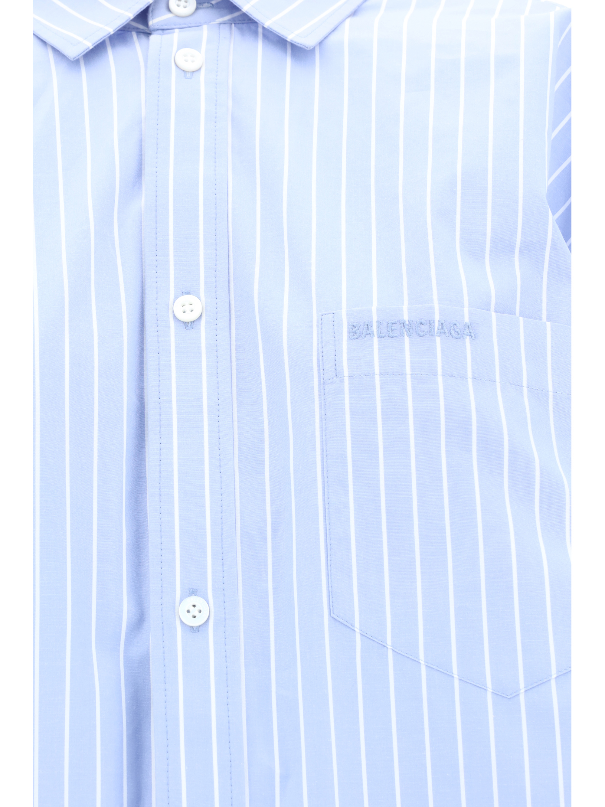 Cotton Asymmetric Shirt by Balenciaga featuring a classic collar, a front button closure, a front patch pocket, an asymmetrical flared back hem, a striped pattern, and an oversized fit.