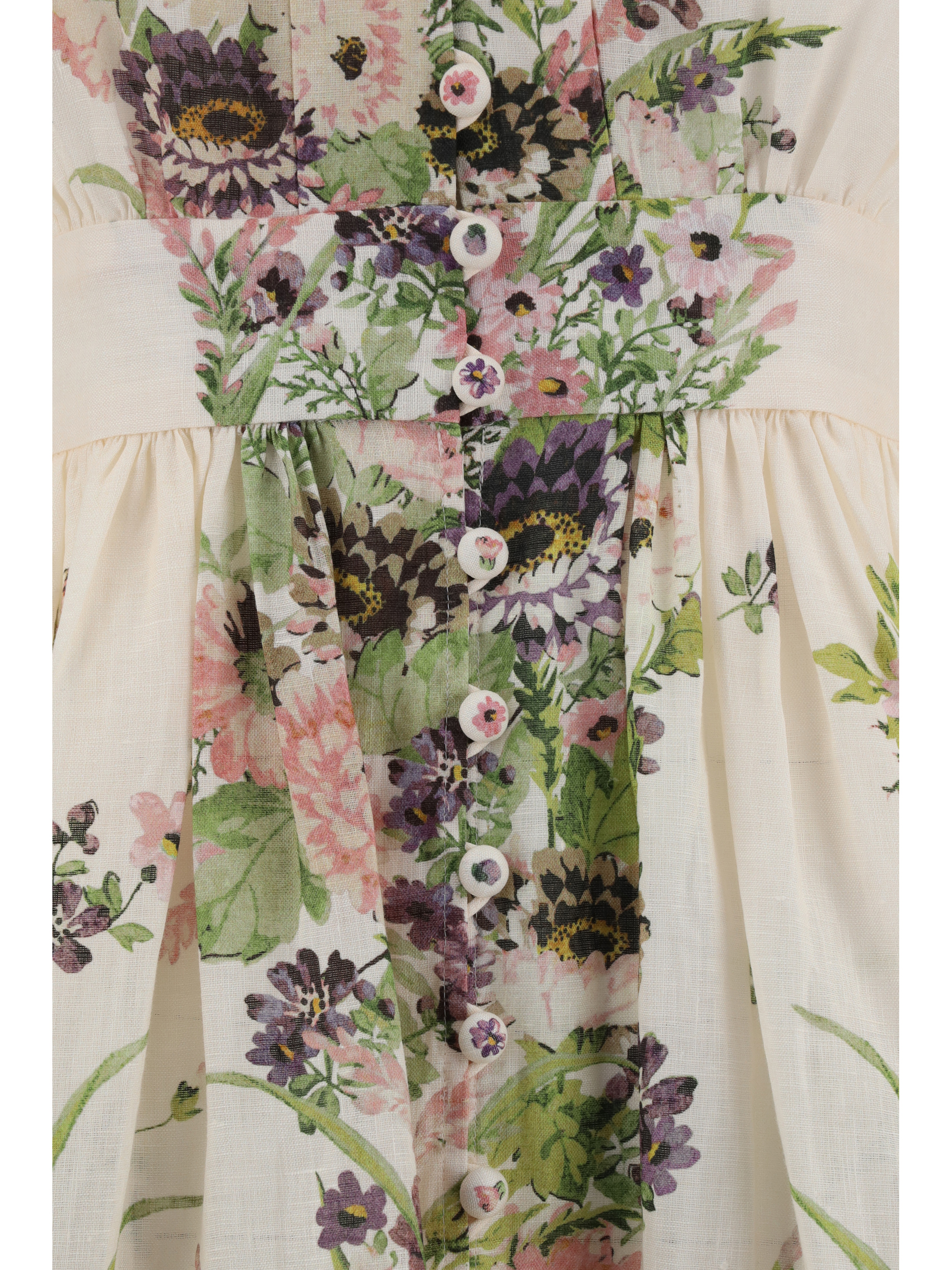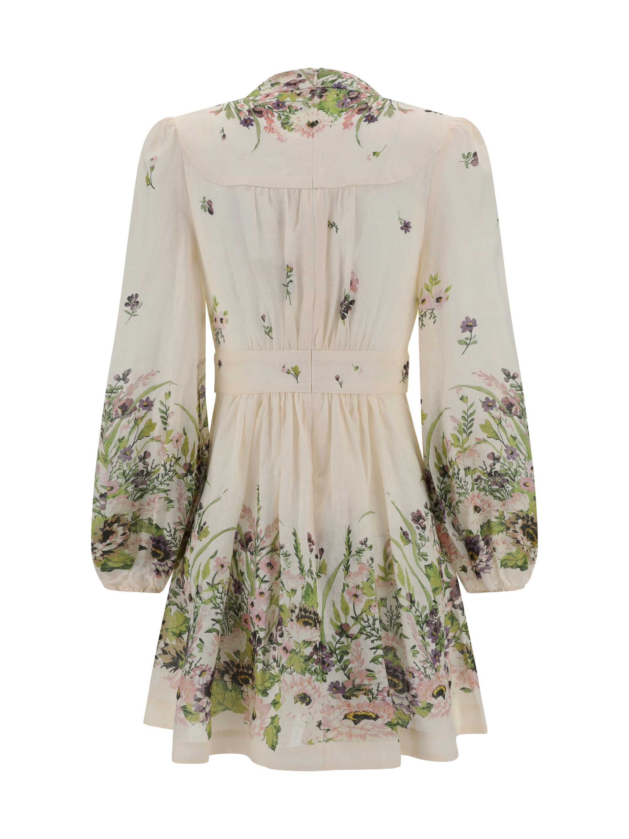 Linen Halliday Plunge Mini Dress by Zimmermann, featuring a concealed back zipper closure, a v-neck front, a long-sleeved design, a front closure with matching and embroidered buttons, elasticated cuffs, an all-over repeated floral pattern, and a regular fit.