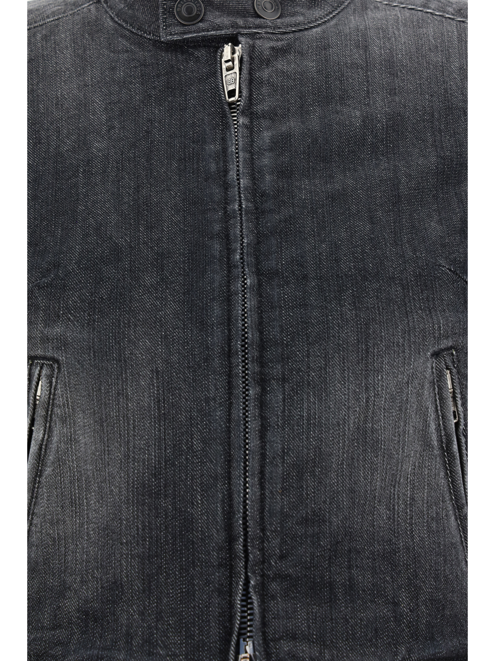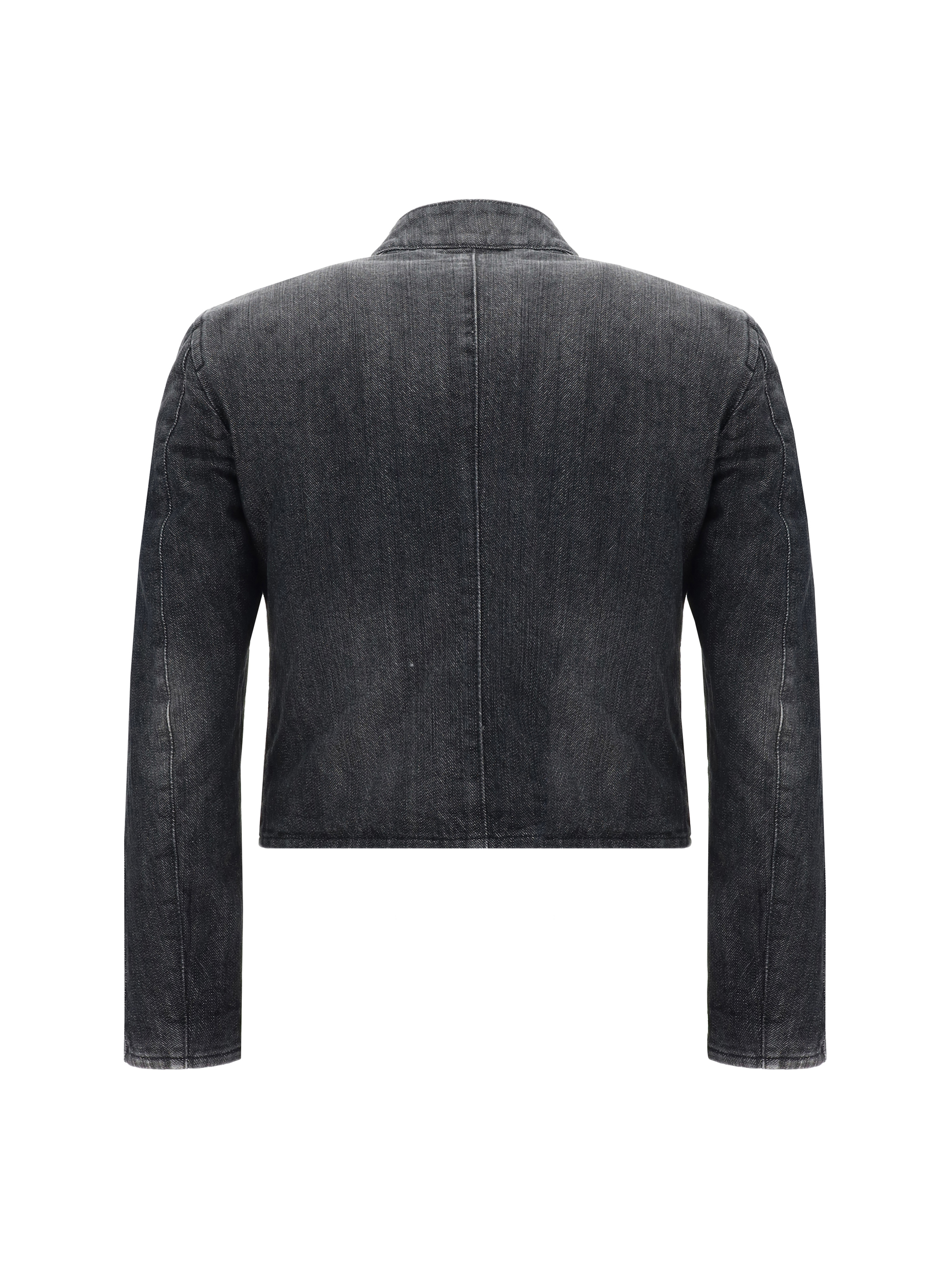 Cotton Shrunk Racer Jacket by Balenciaga, cropped style, quilted denim design, high collar with snap buttons, two-slider front zipper closure, two side zipper welt pockets, regular fit.