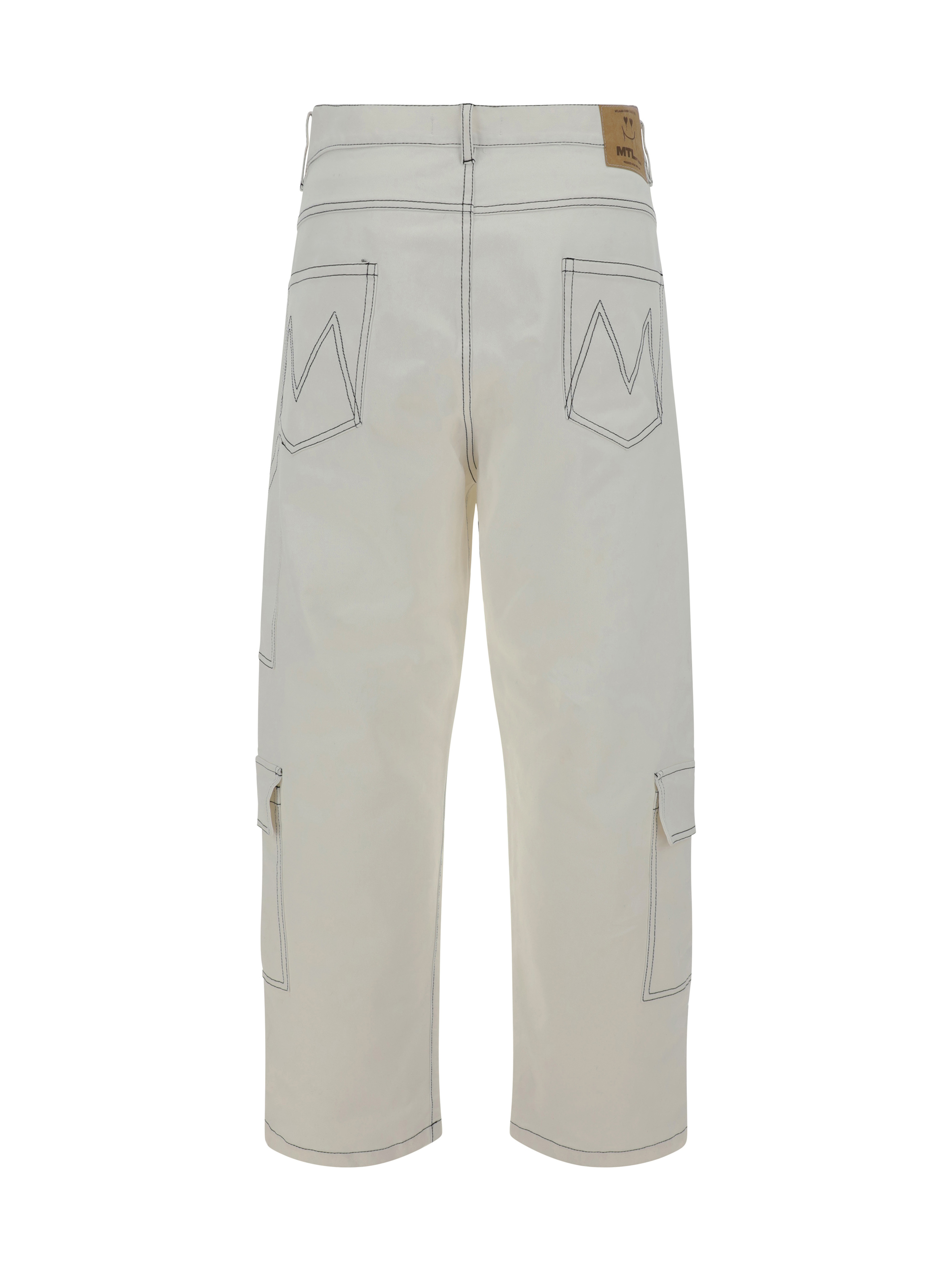 Cotton Work Pants by MTL, five-pocket cargo style, cargo pockets on side panels, front button and zipper closure, waistband loops, iconic branded signature leather patch with press-stamped applique on back, all-over contrast stitching, oversize fit.