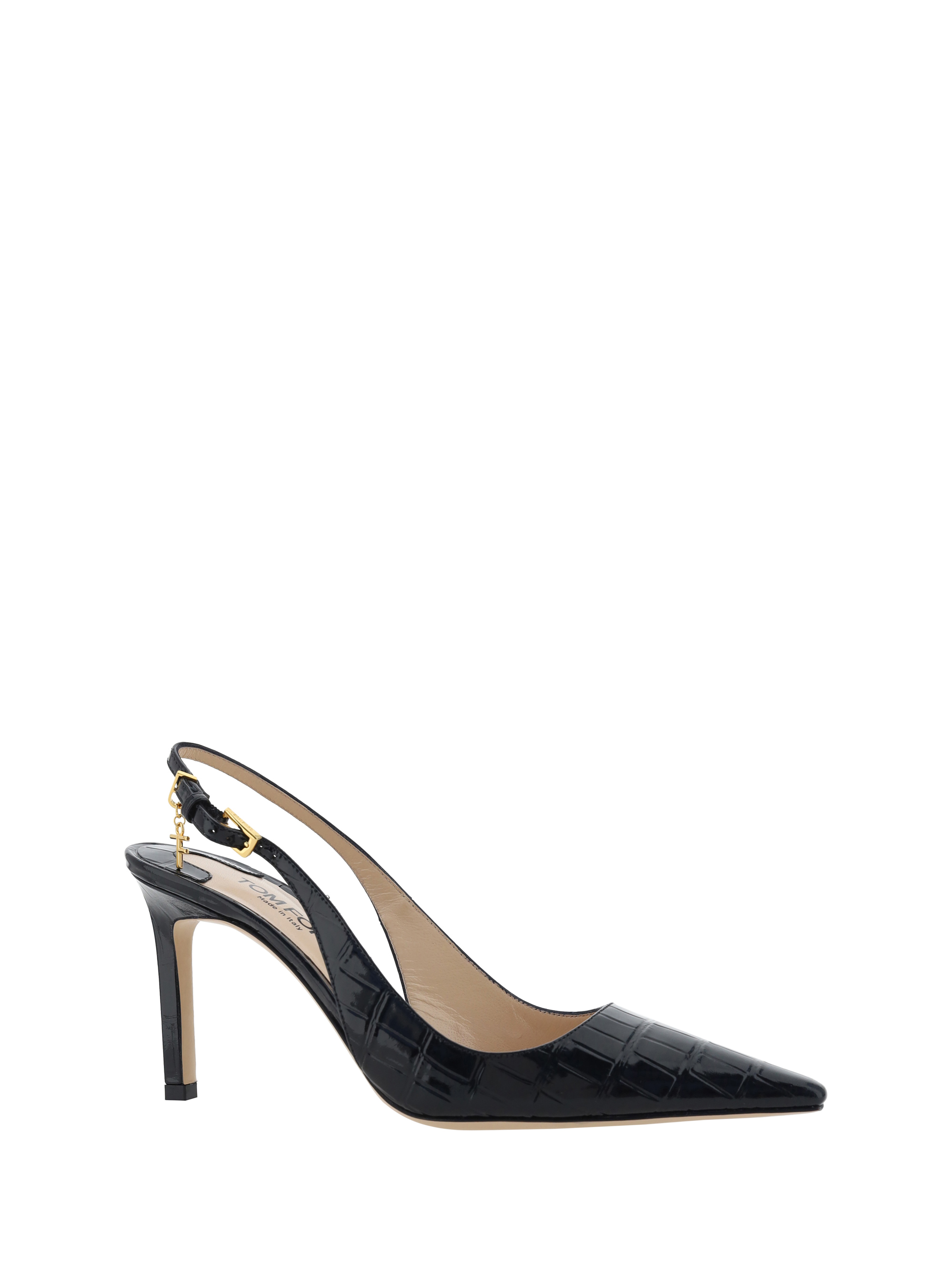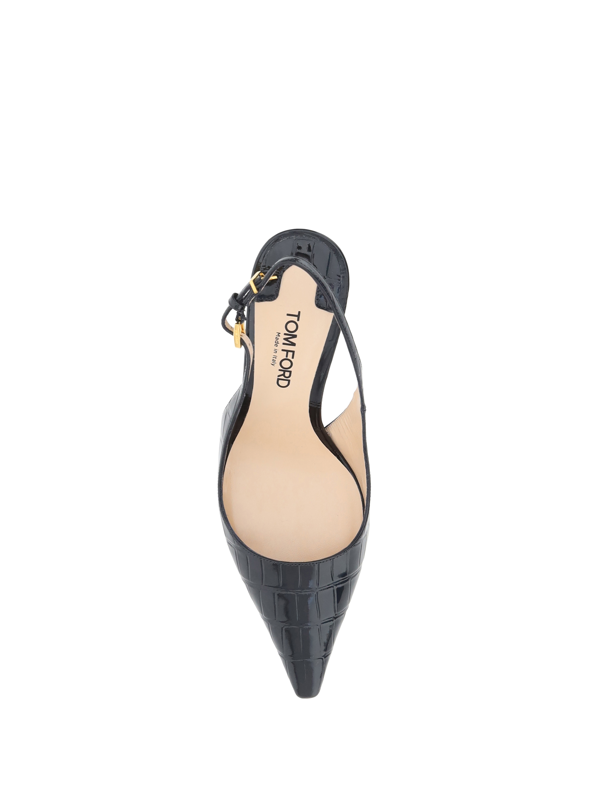 Calfskin Pumps by Tom Ford, leather stiletto heel, slingback closure with strap for closure, extended toe, contrasting logo insole.