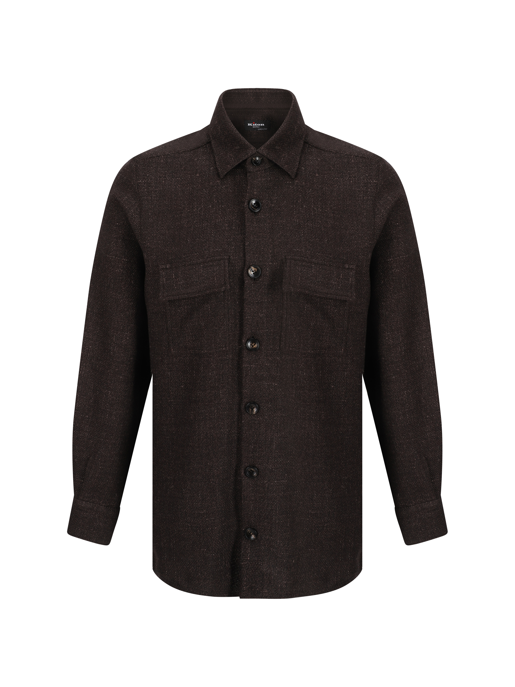 Virgin Wool Shirt by Kiton, classic collar, front button closure, two front patch pockets with flap for closure, adjustable button cuffs, monochrome pattern, regular fit.
