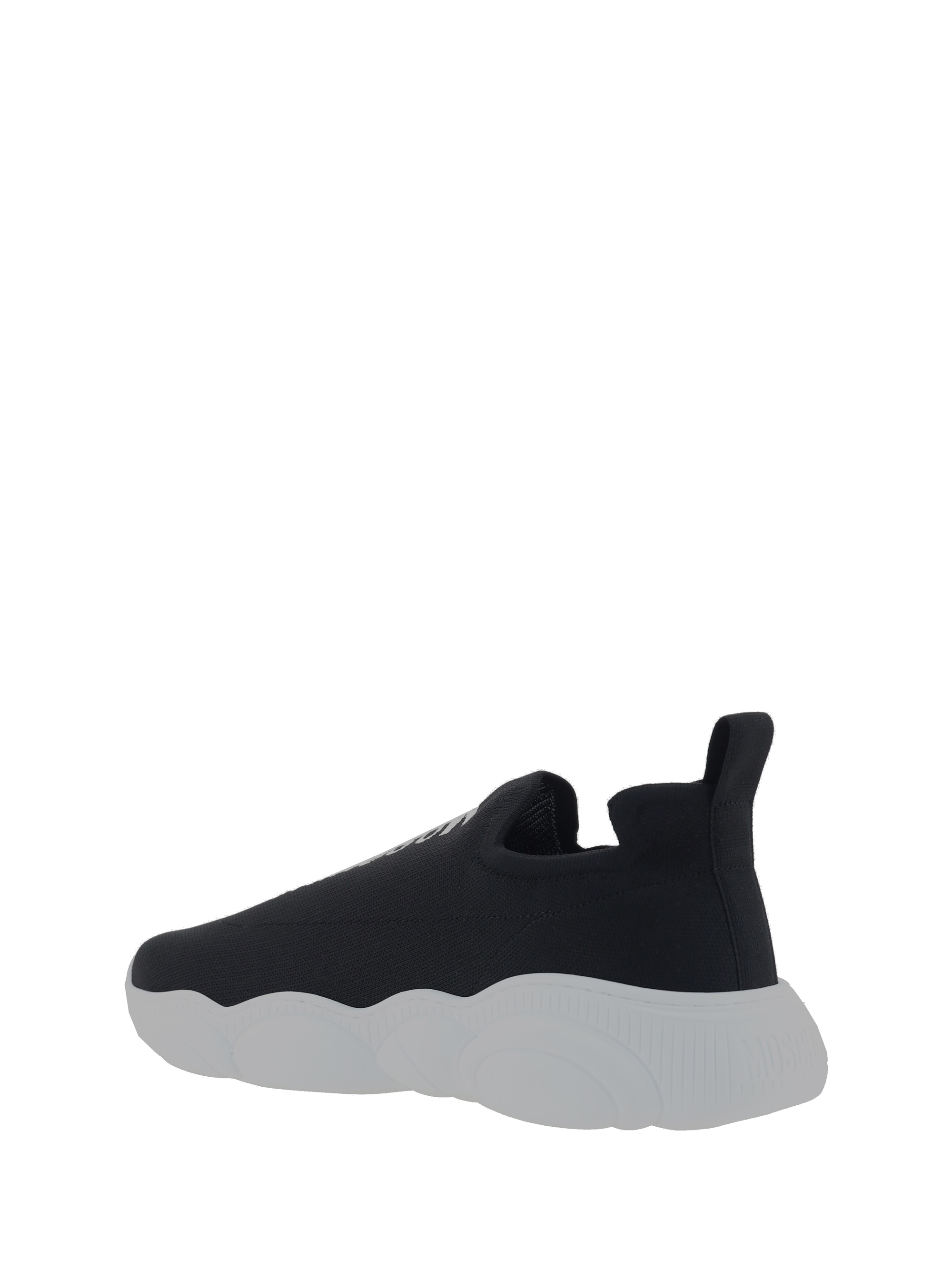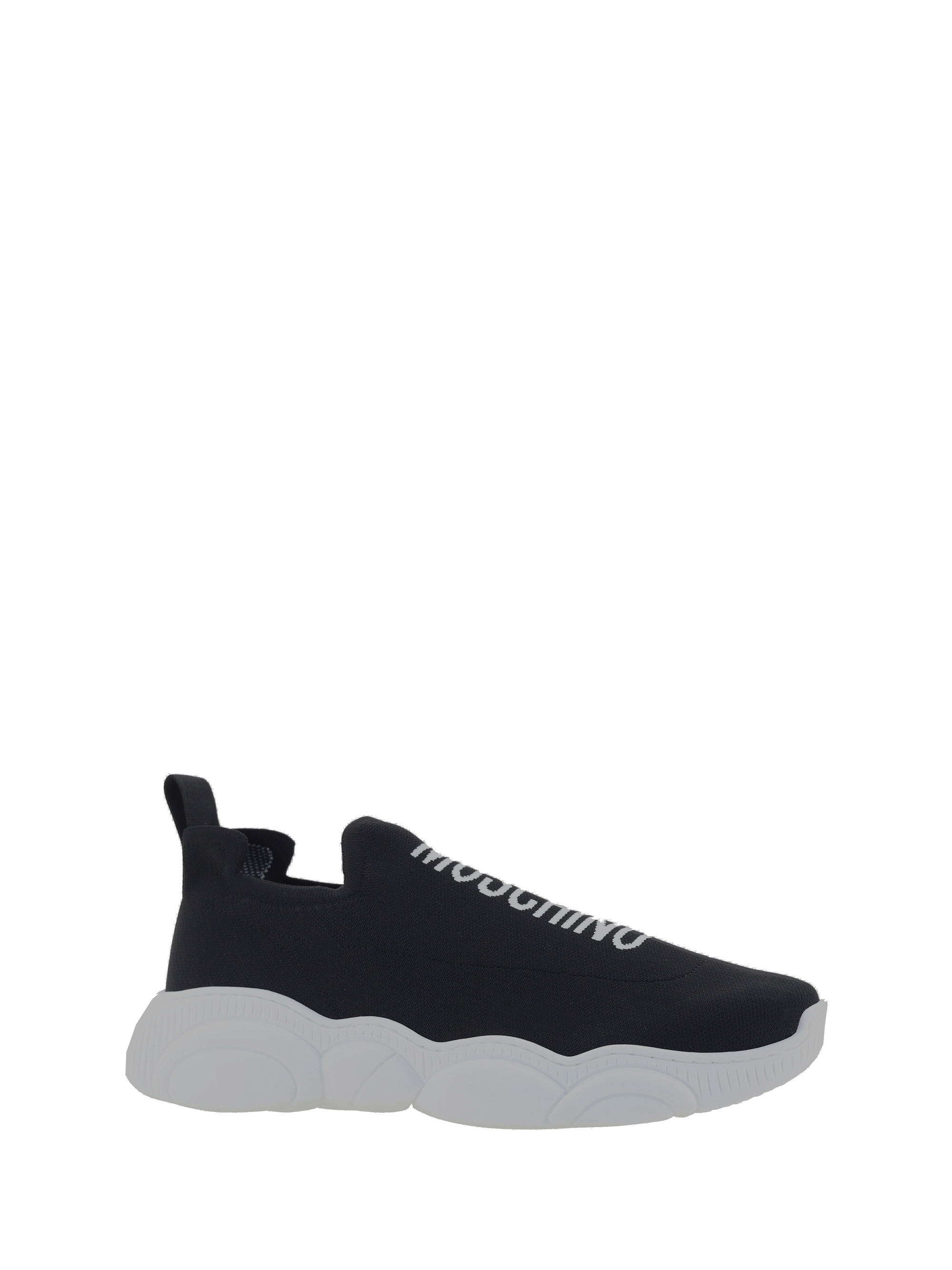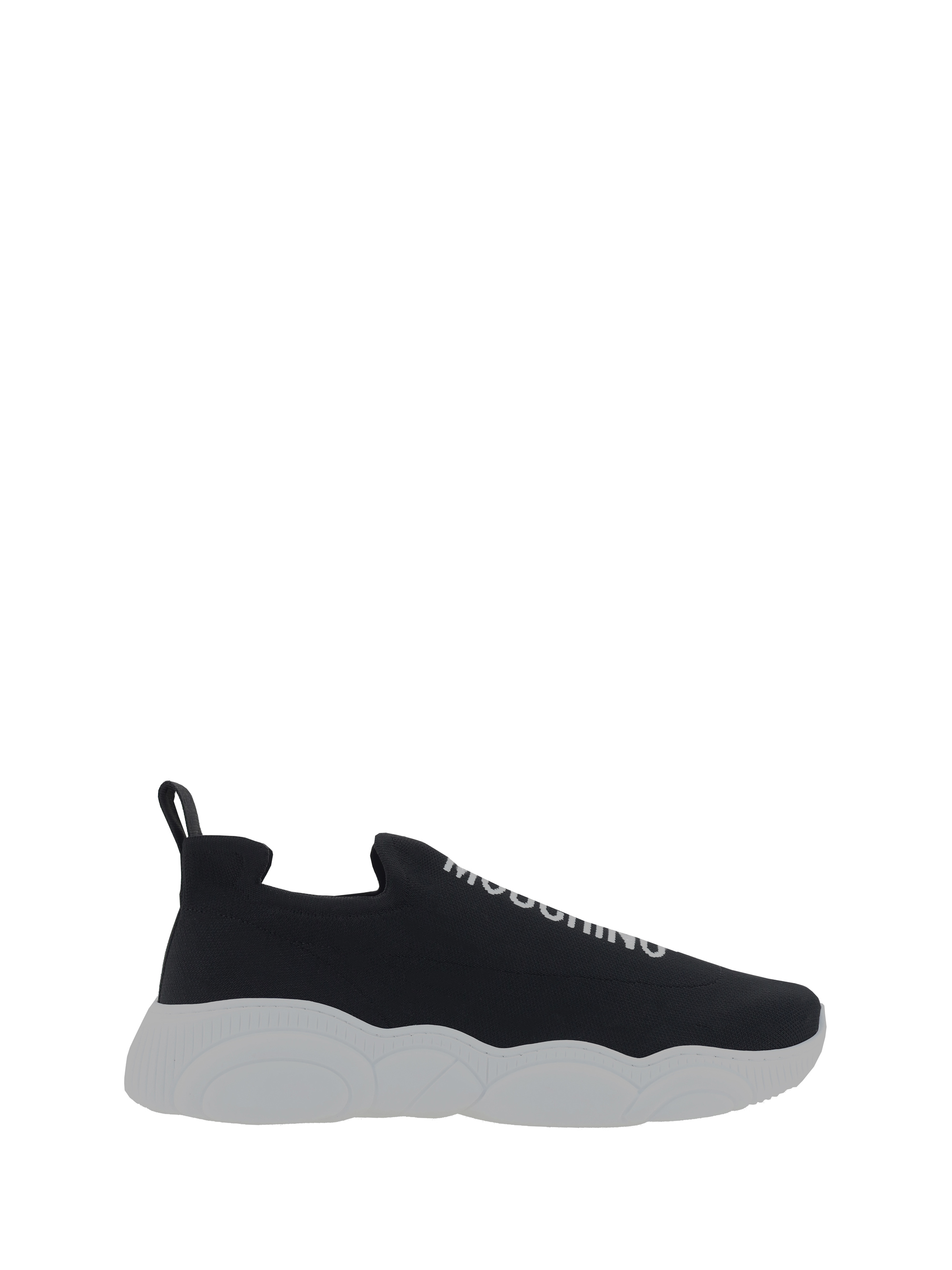 Sneakers by Moschino, slip-on style, contrasting sole, heel puller for easy fit, contrasting signature maxi logo on back of foot.