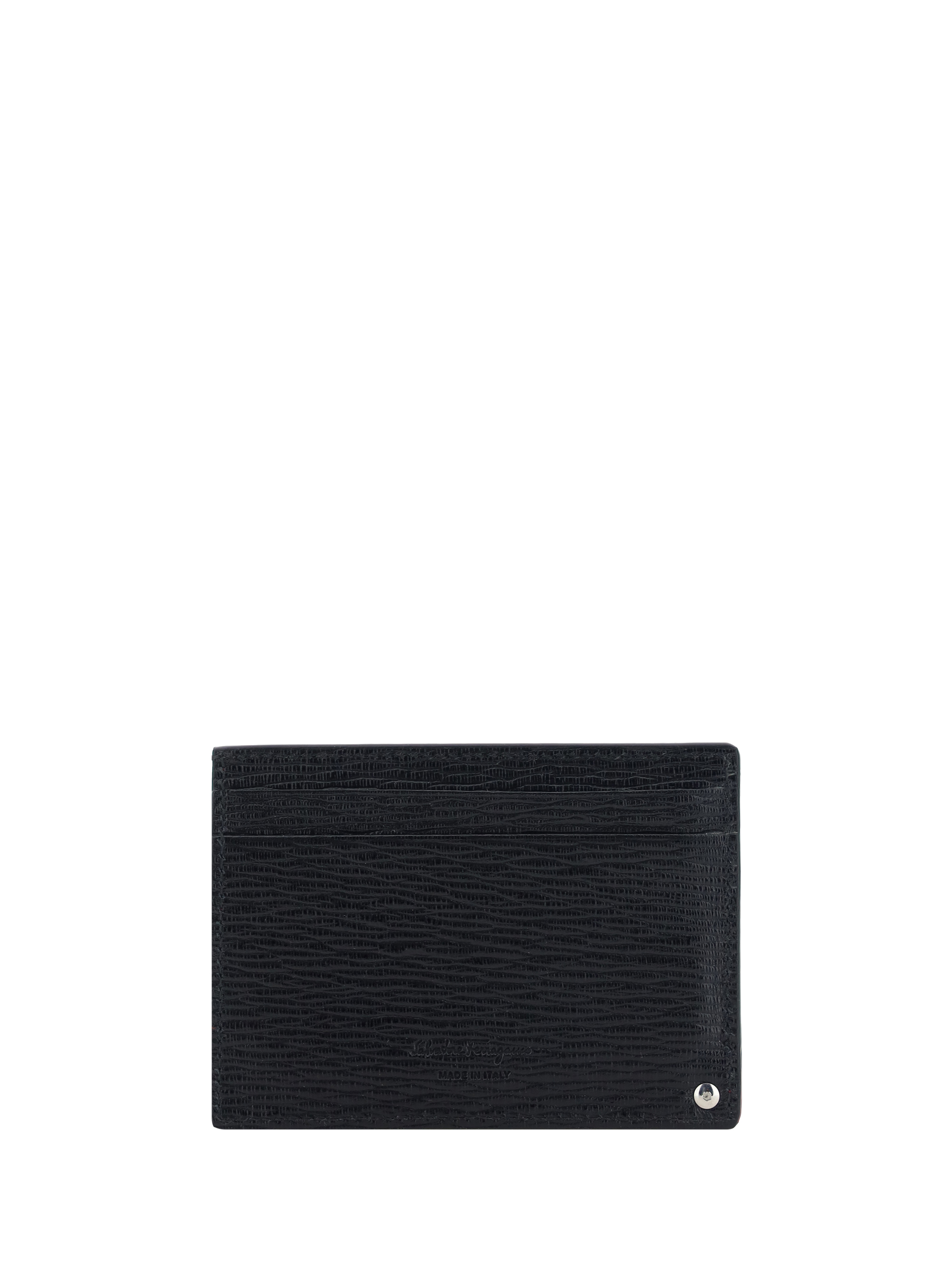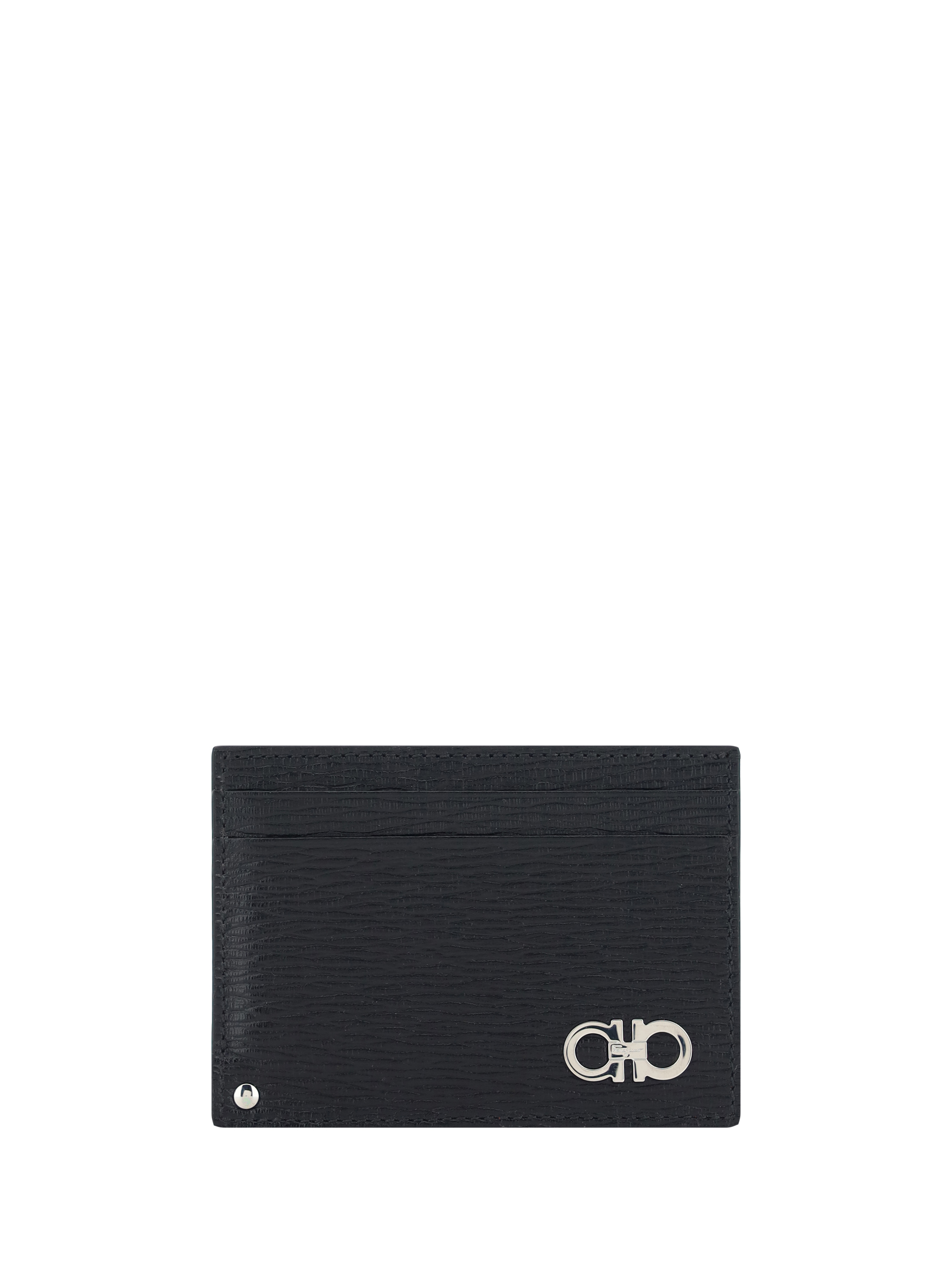 Calfskin Revival Card Holder by Ferragamo, card slots, metal logo patch on front, convenient removable document pocket, engraved logo on back.