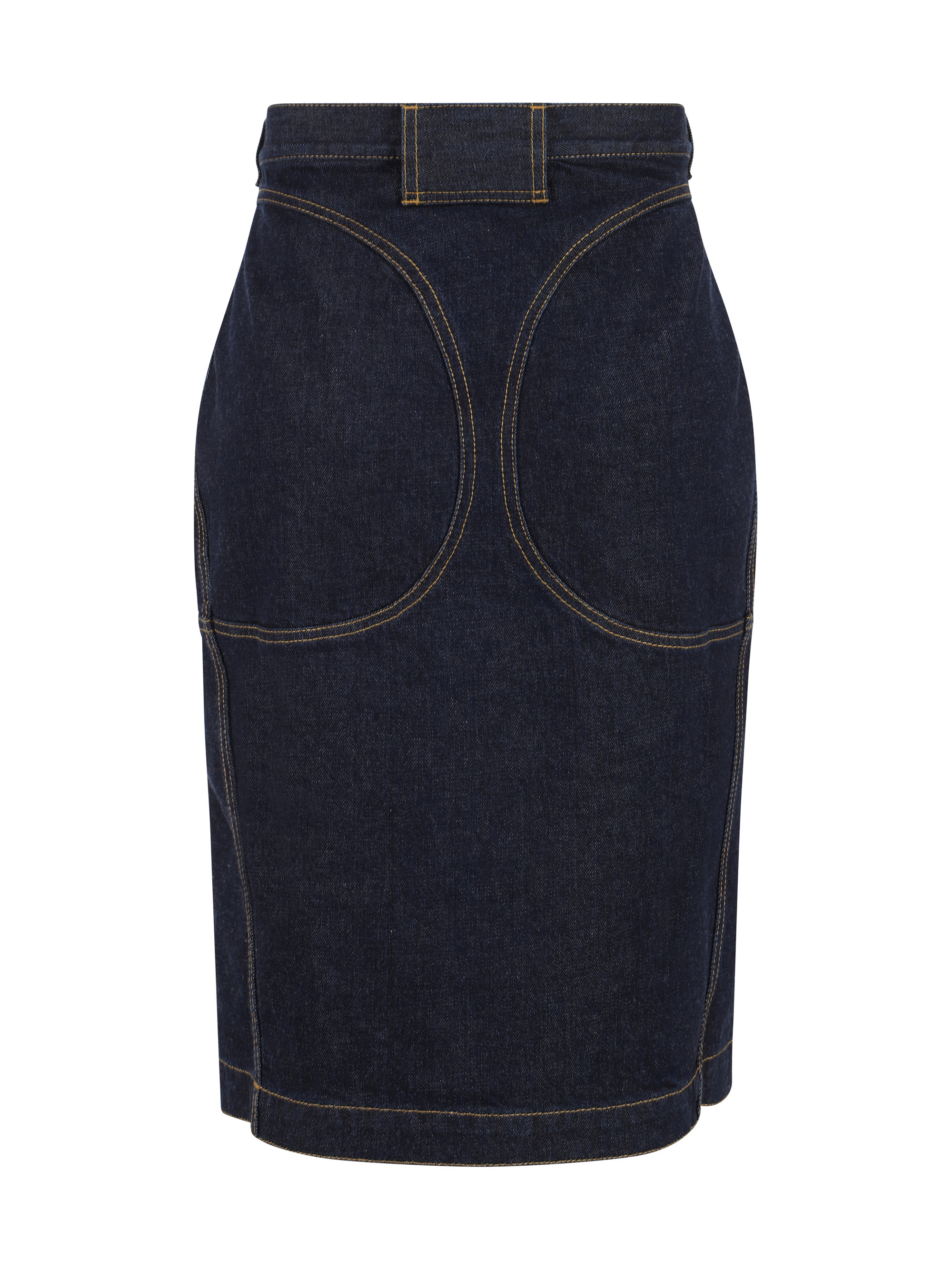 Cotton Pencil Skirt by Alaia, featuring denim design, front zipper and button closure, waistband loops, monochrome pattern, regular fit.