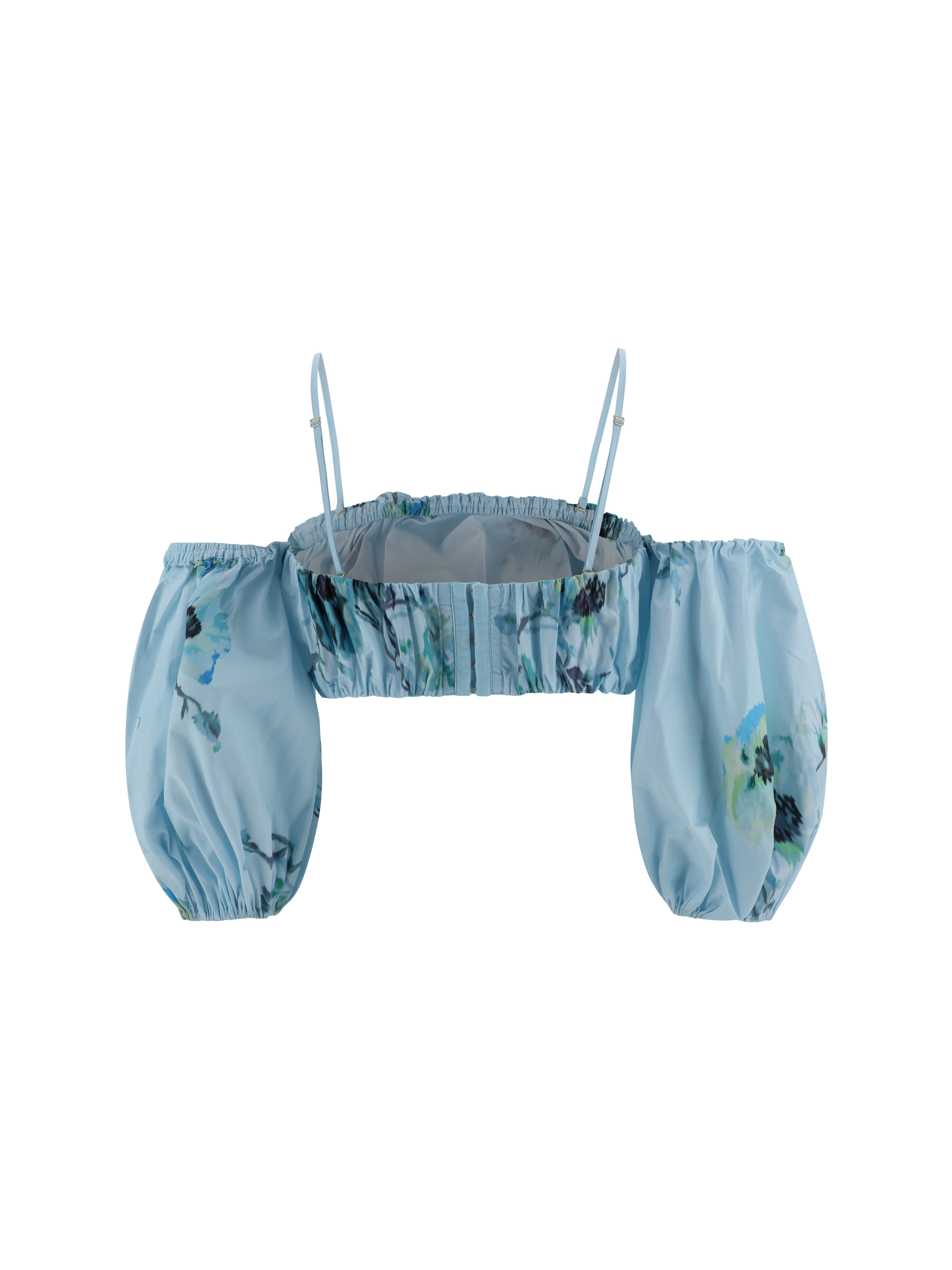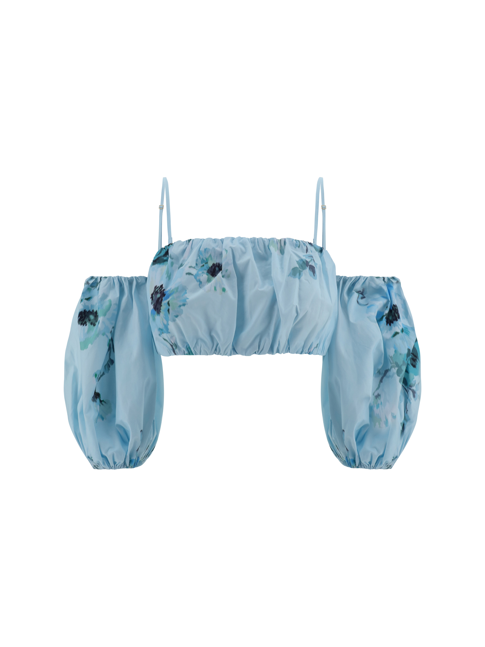 Cotton Lightburst Top by Zimmermann features ruffled bodice, short puff sleeves, center back closure, removable adjustable straps, elasticated bust.