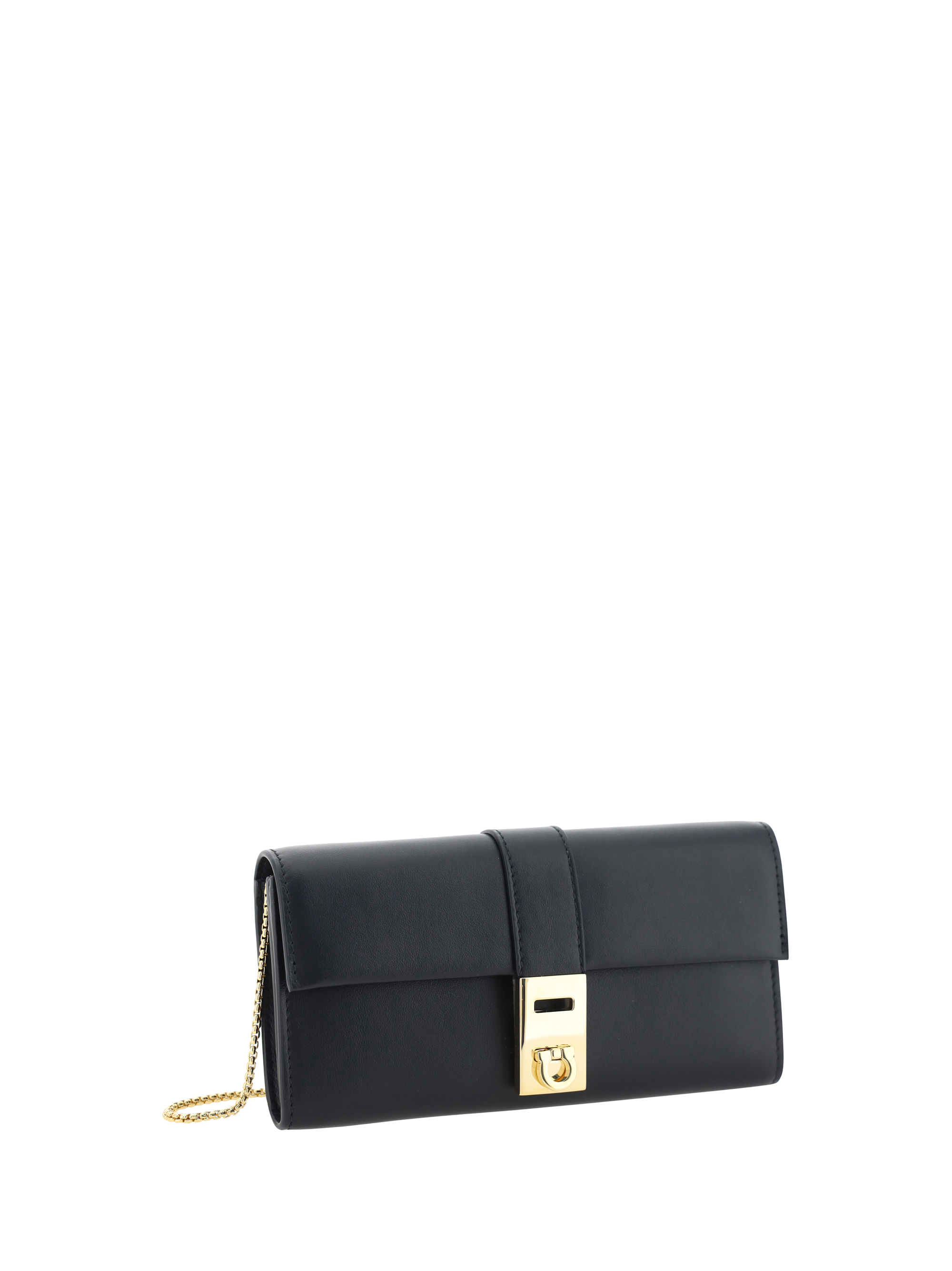 Calfskin Shoulder Wallet by Ferragamo, sliding chain shoulder strap, front closure via magnetic flap, iconic hardware applique on closure, interior multiple compartment, coin compartment with zipper for closure.