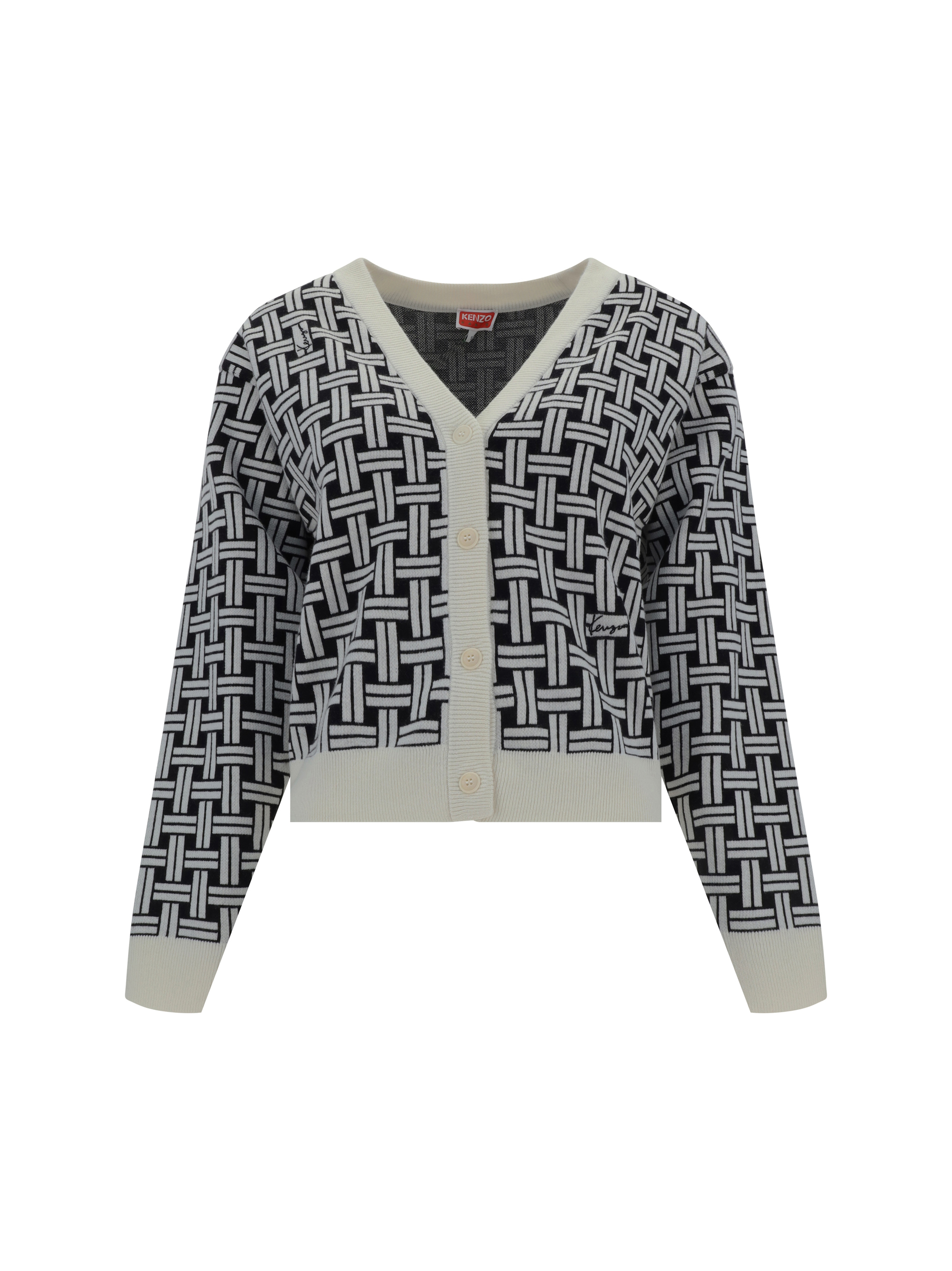 Cotton Wool Blend Weave Cardigan by Kenzo, geometric optical pattern, solid color ribbed hems, front closure by matching buttons, raglan shoulders, contrasting embroidered logo on front, V-neck, regular fit.