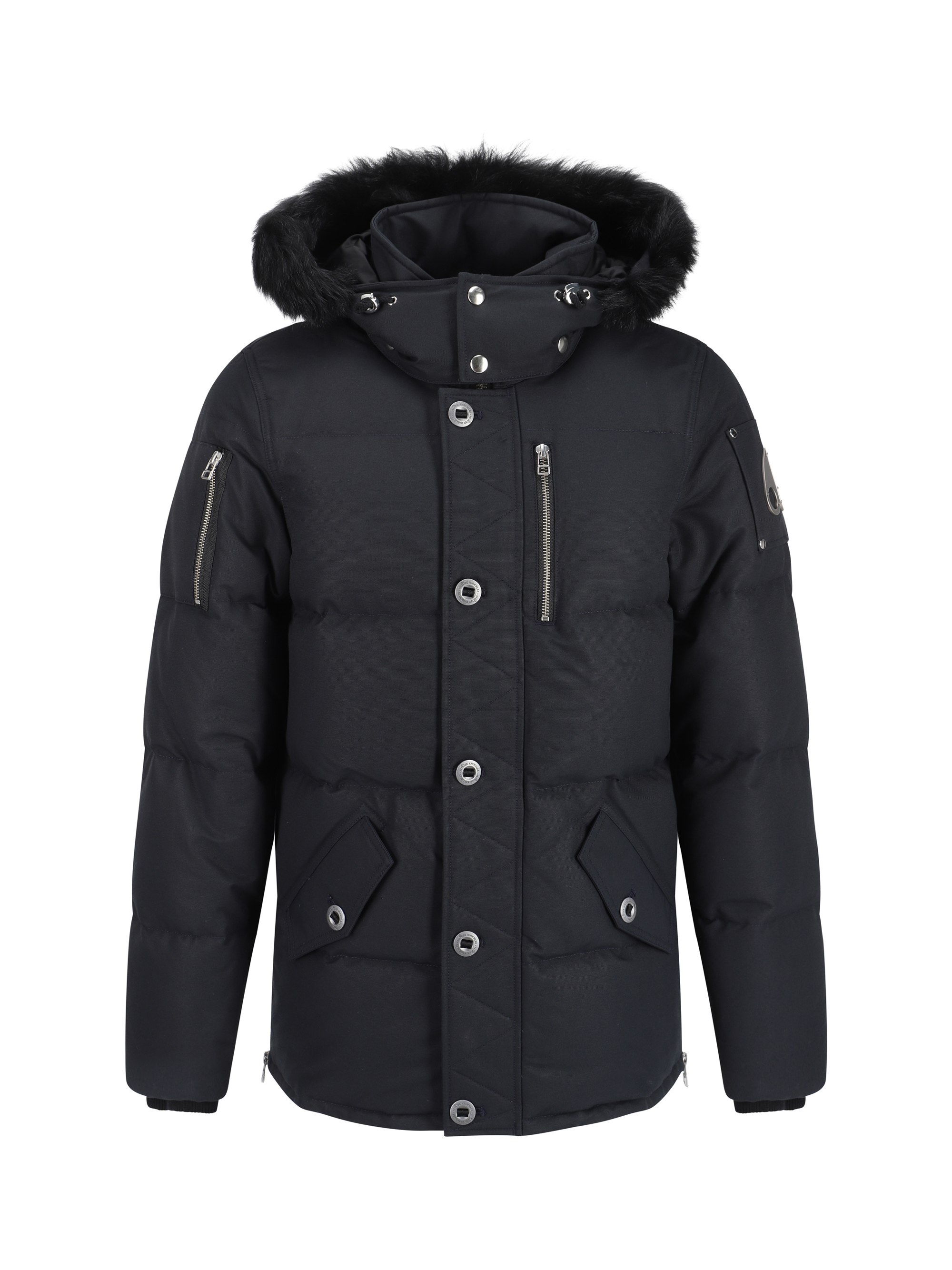 Cotton Neoshear Down Jacket by Moose Knuckles, design with removable buttoned hood and faux fur detail on perimeter, high collar, front zipper and buttoned flap closure, two side welt pockets with applied flap, vertical slit pocket with zipper on front, zippered patch pocket on right sleeve, all-over quilted and padded design, elastic ribbed cuffs, adjustable zippered side slits, iconic brand logo metal plaque applied on left arm, regular fit.