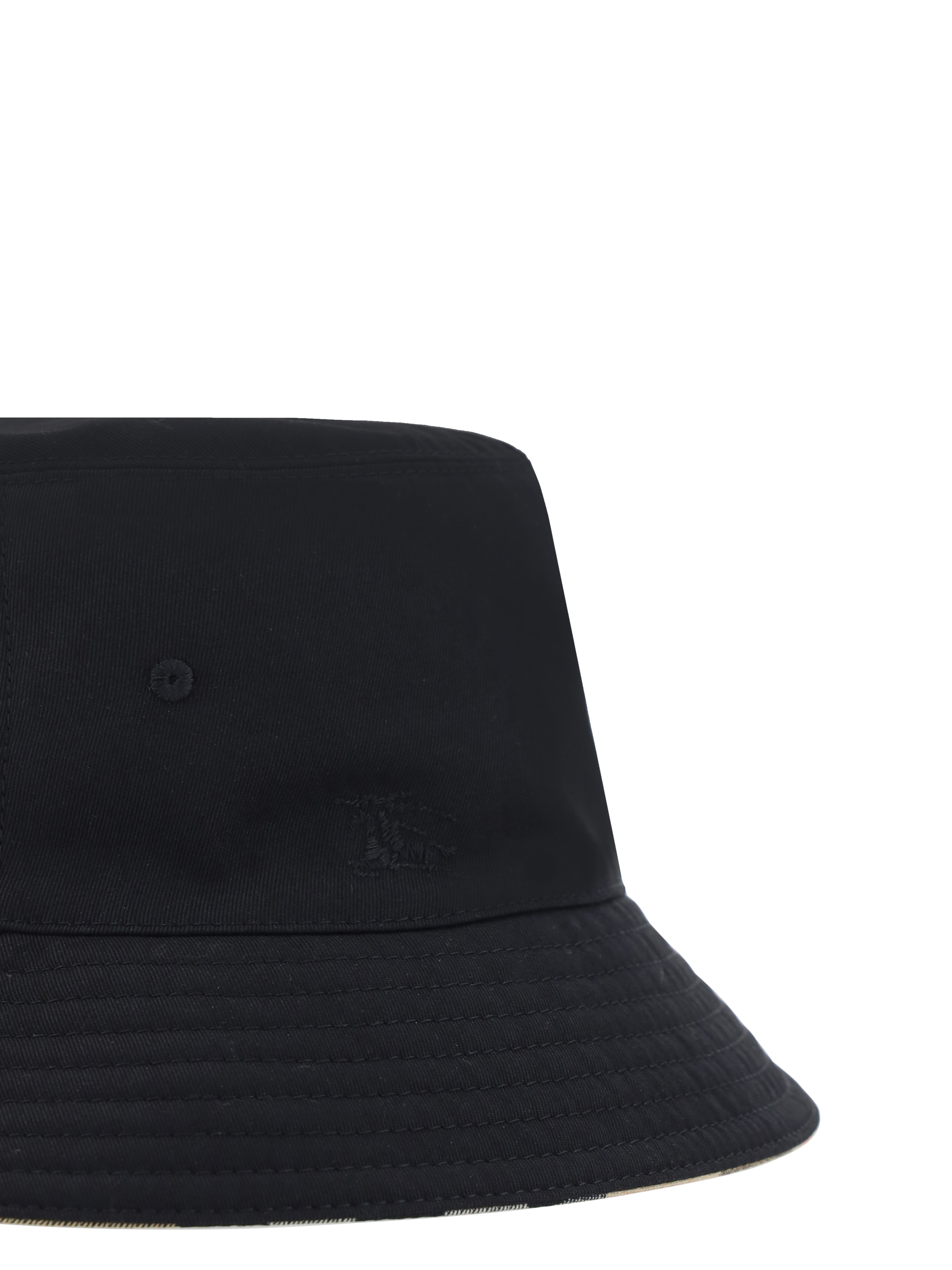 Reversible Bucket Hat by Burberry, iconic all-over Archivio Check print on one side, single-color pattern on the opposite side.