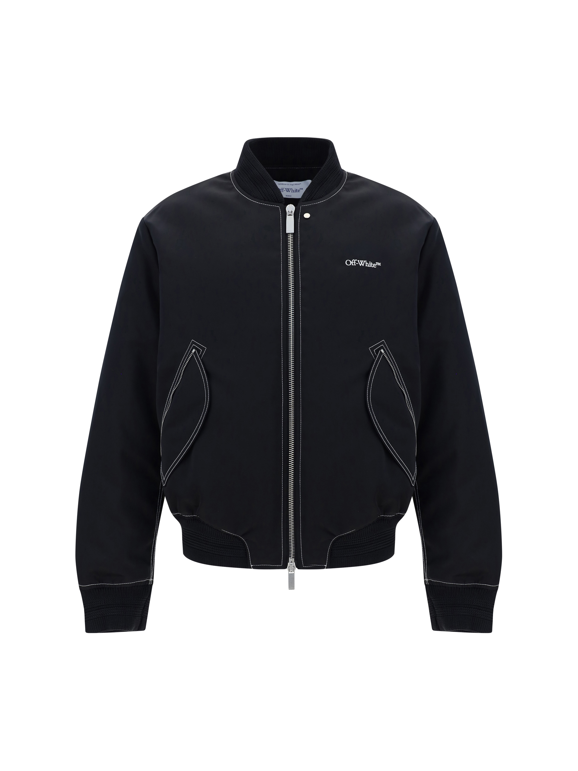 Contrast Stitch Bomber Jacket by Off-White, double-slider front zipper closure, high crew neck, elasticized cuffs, elasticized hem, two side welt pockets, regular fit, iconic brand signature contrast front.