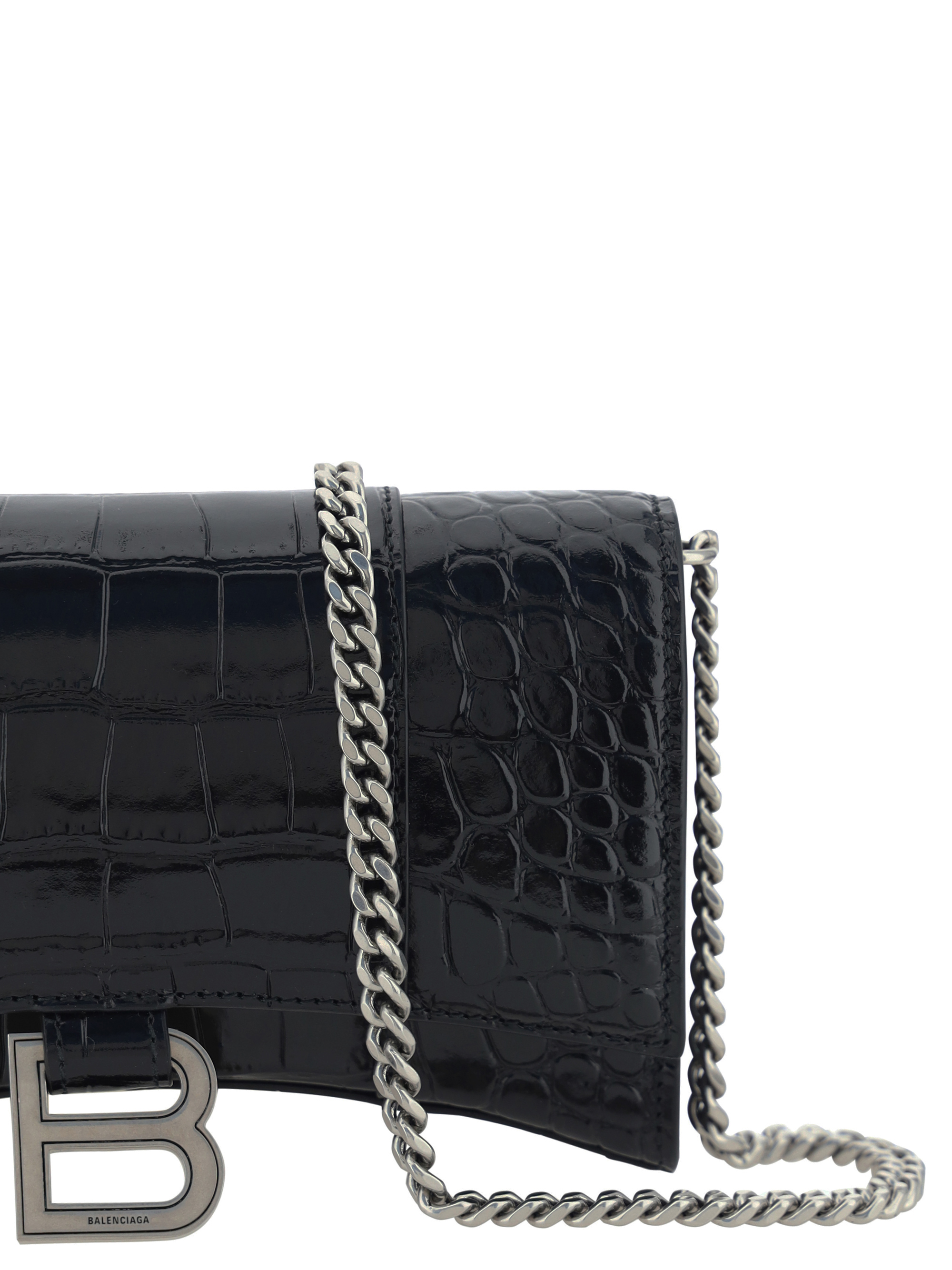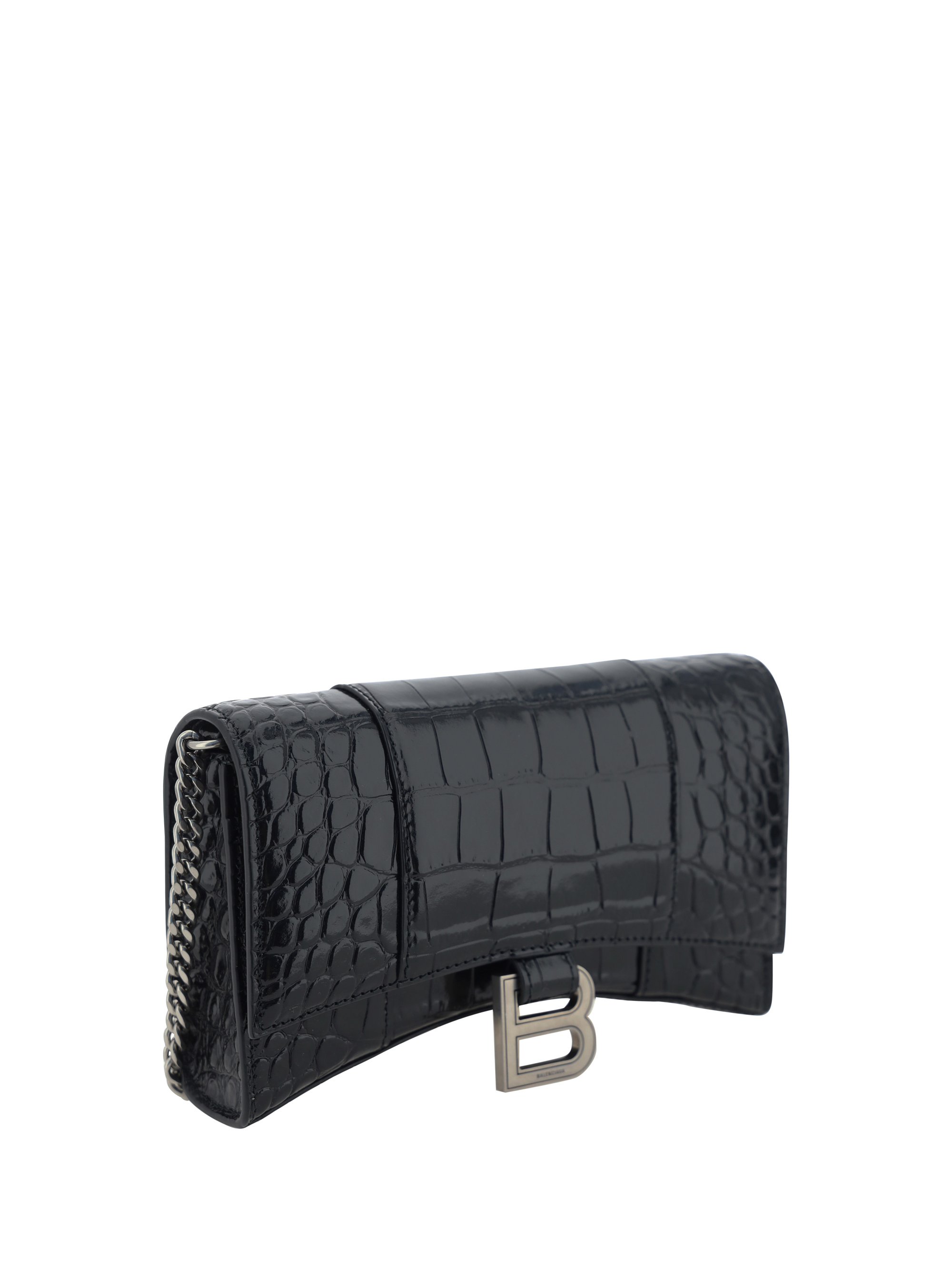 Calfskin Hour Wallet by Balenciaga, front magnetic button closure, iconic antiqued brass brand monogram on front for closure, chain shoulder strap, interior card slot, bill compartments, interior coin pocket with zipper closure.