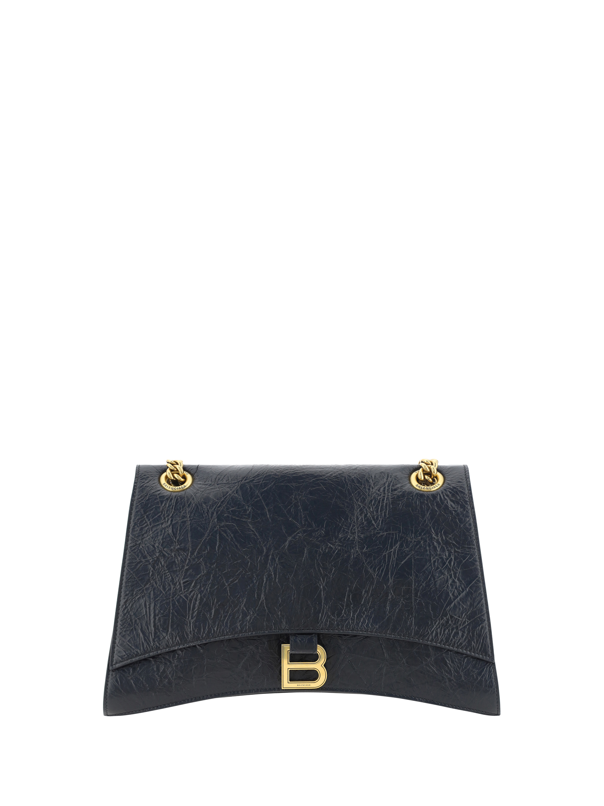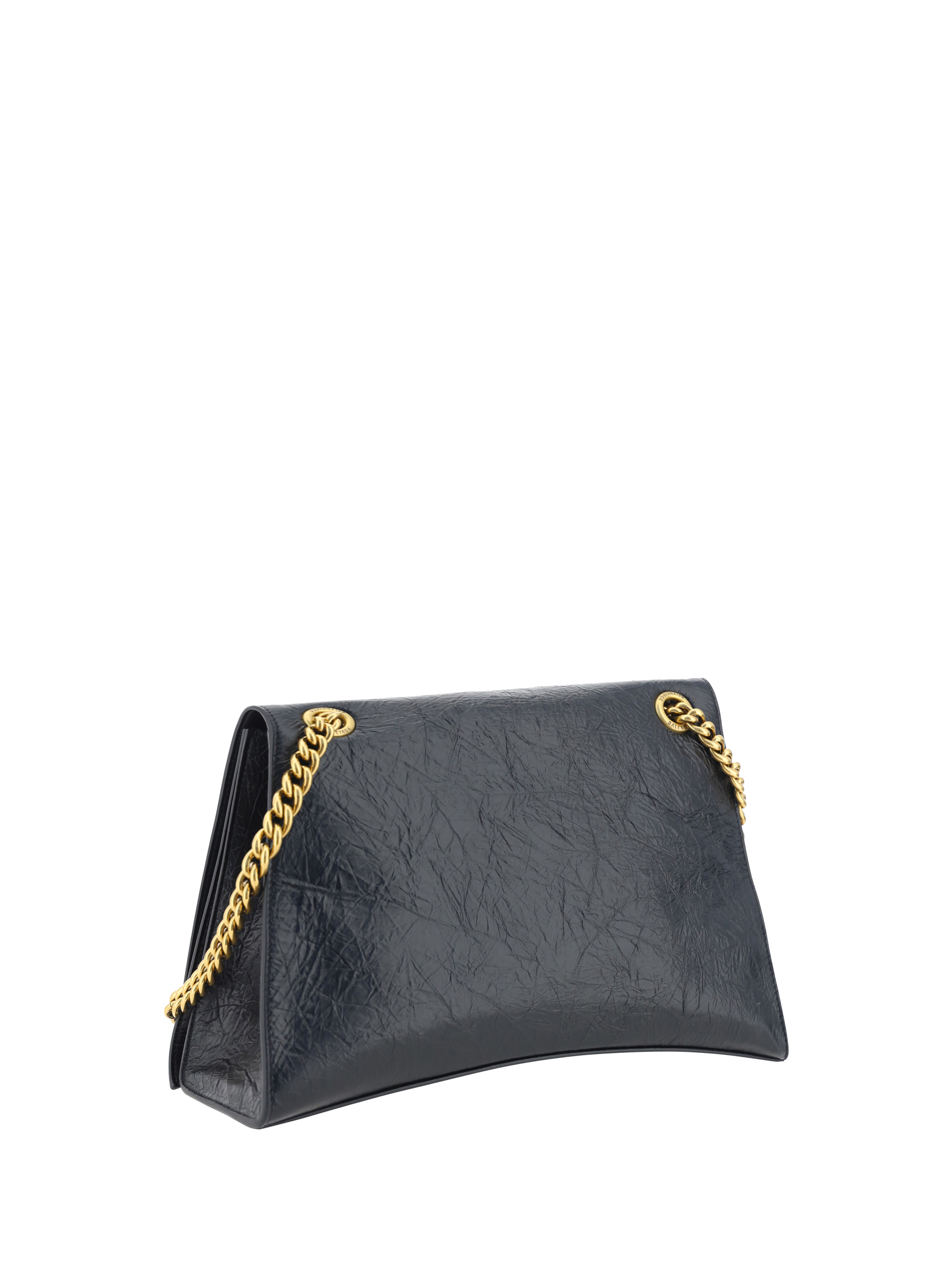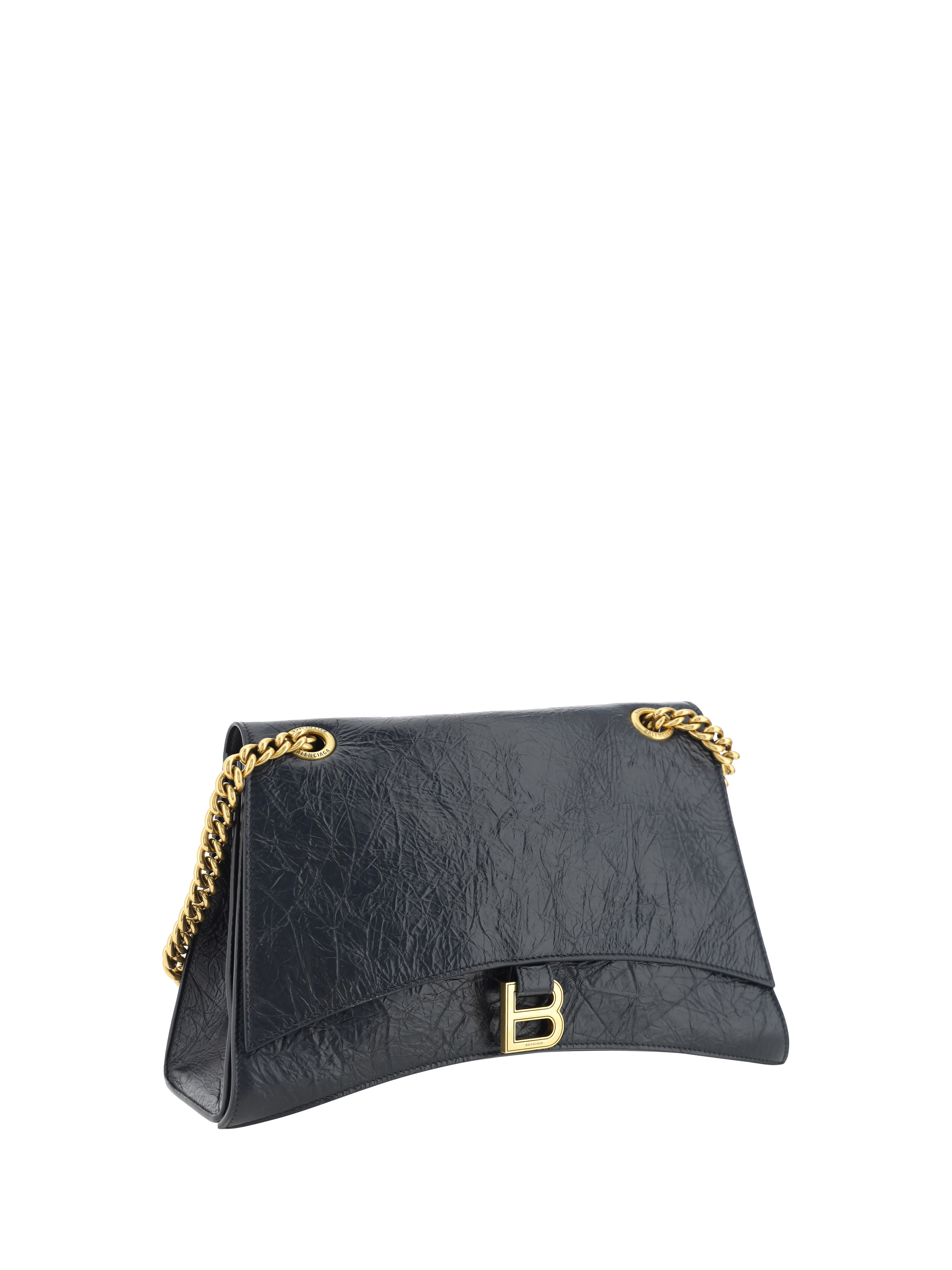 Calfskin Medium Crush Shoulder Bag by Balenciaga, gold-plated sliding chain, magnetic flap closure at front, gold-plated iconic brand monogram plaque embossed on front, crinkled leather effect design.