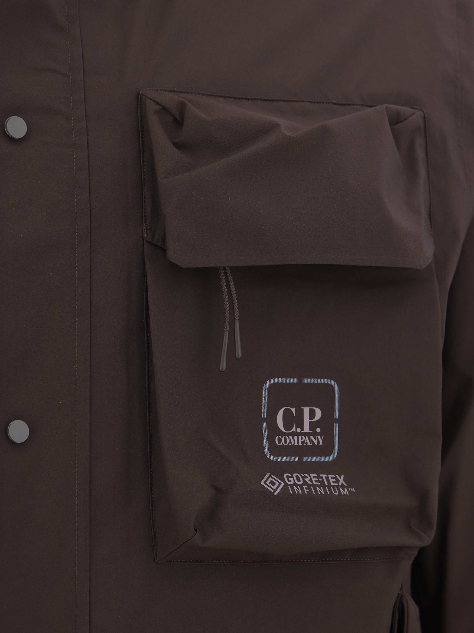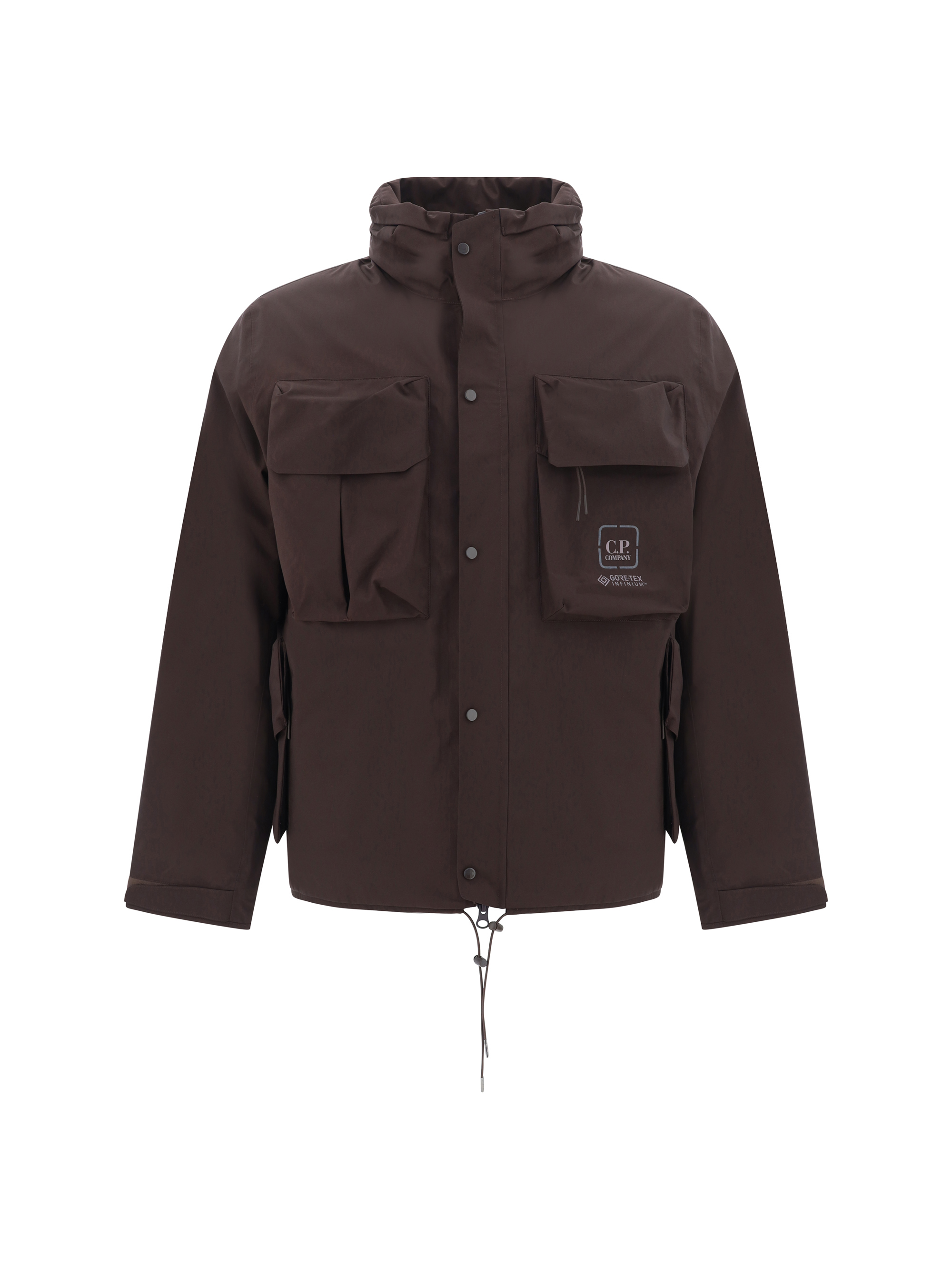 Metropolis Jacket by C.P.Company, hood with adjustable drawstring to store in a patch pocket on the neckline, two large patch pockets on the front with Velcro patch for closure, adjustable cuffs, contrasting iconic brand logo on the front, all-over padding, front closure by snap buttons, regular fit.