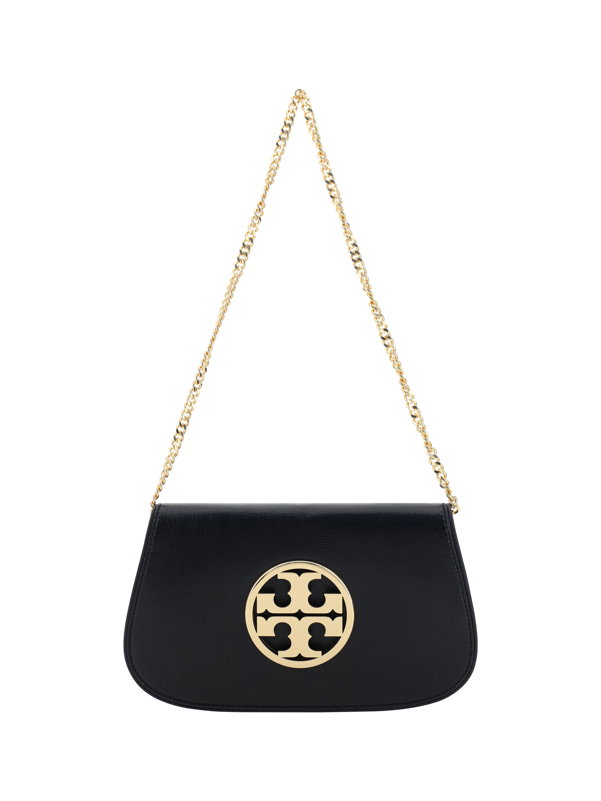 Lambskin Reva Shoulder Bag by Tory Burch, iconic brand logo on front in contrasting color, gold chain as shoulder strap, magnetic opening on front, single interior compartment, iconic brand logo plaque applied on front, monochrome design.