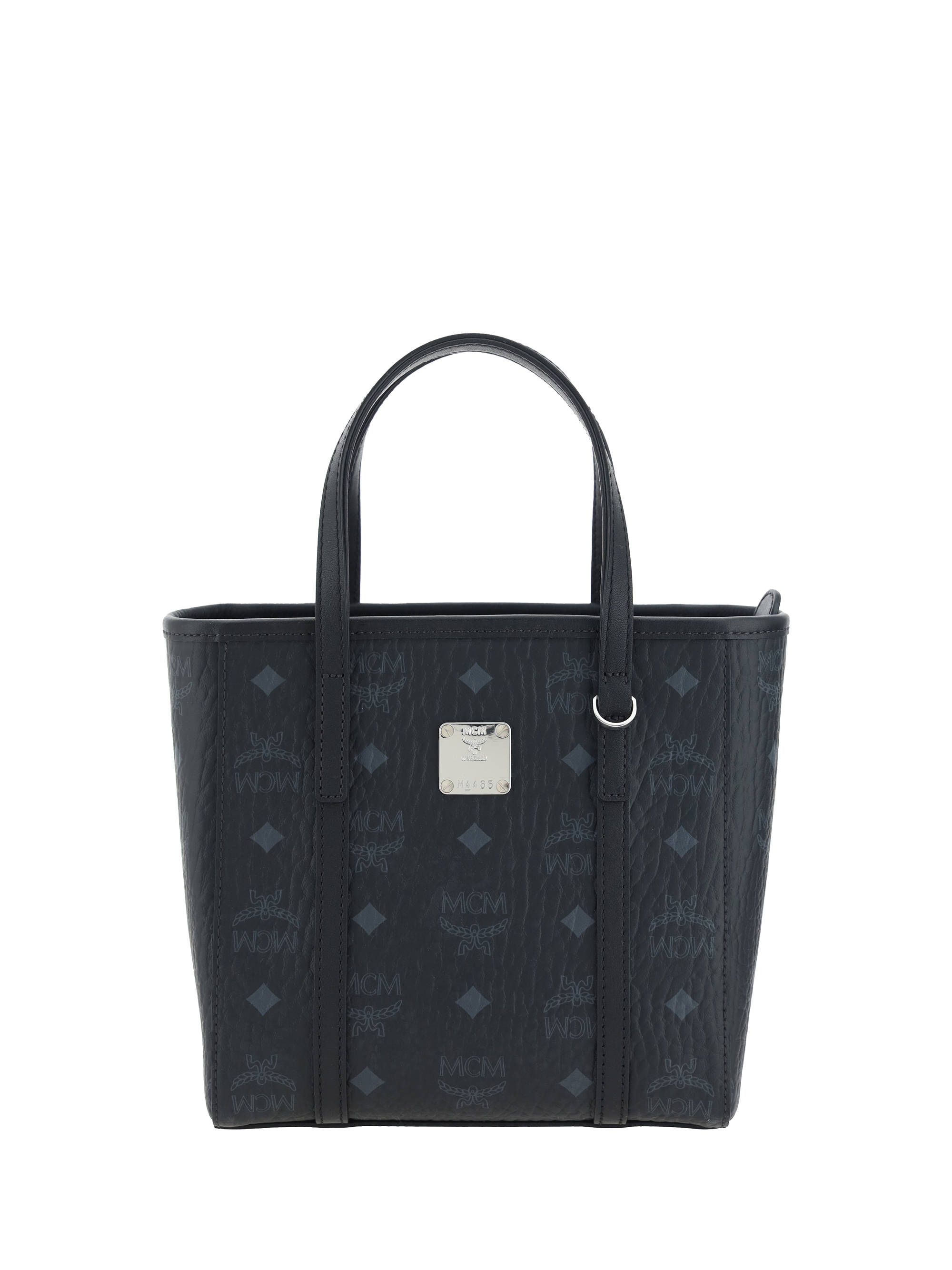 Cognac Shopper Bag Mini by MCM, top handle, removable shoulder strap, contrast logo repeated all over, logo gold-tone plaque, zip closure, internal zip pocket.