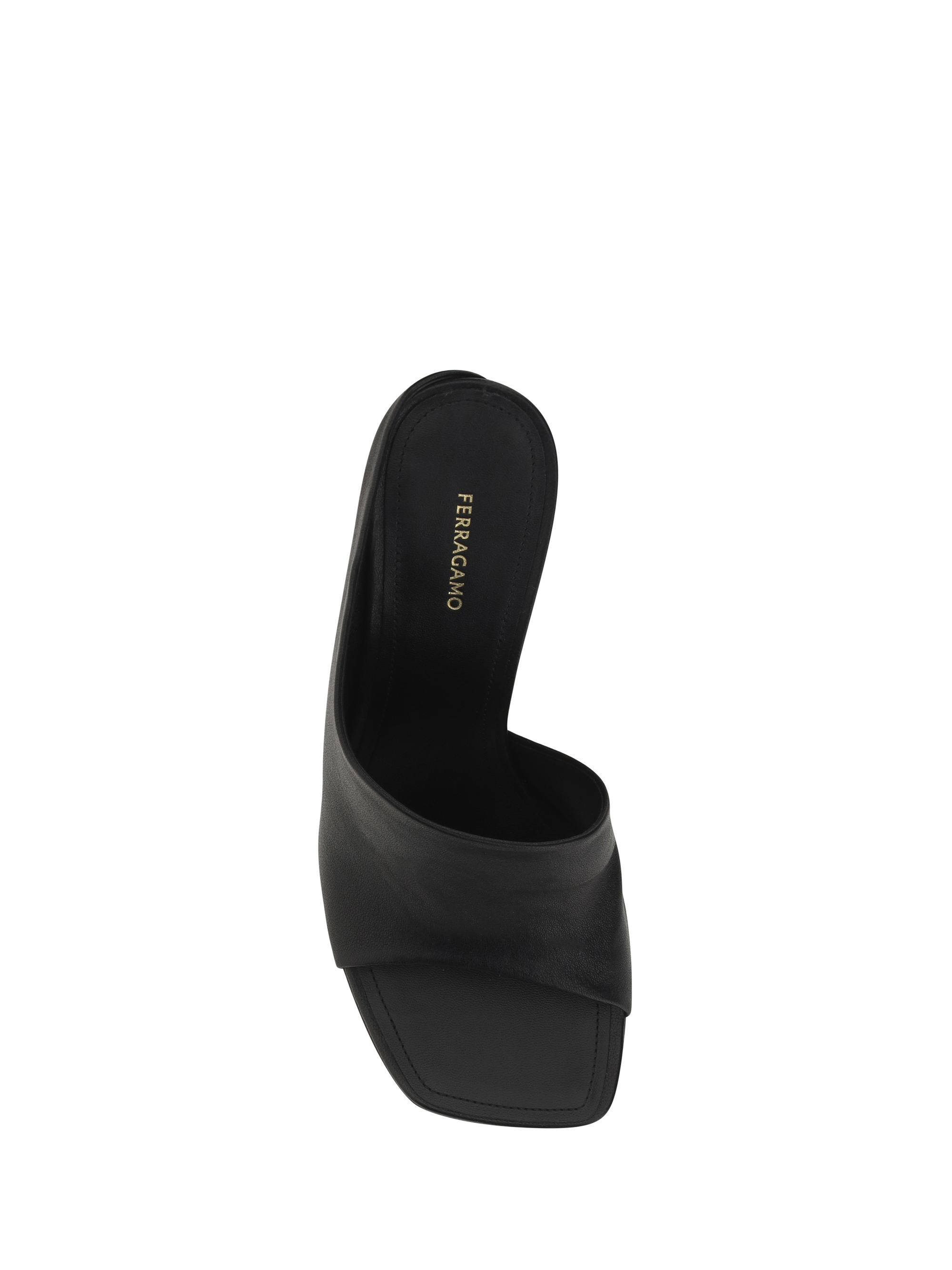 Calfskin Sandals by Ferragamo, wide open front strap, square toe, sculptural heel, contrasting logo insole.