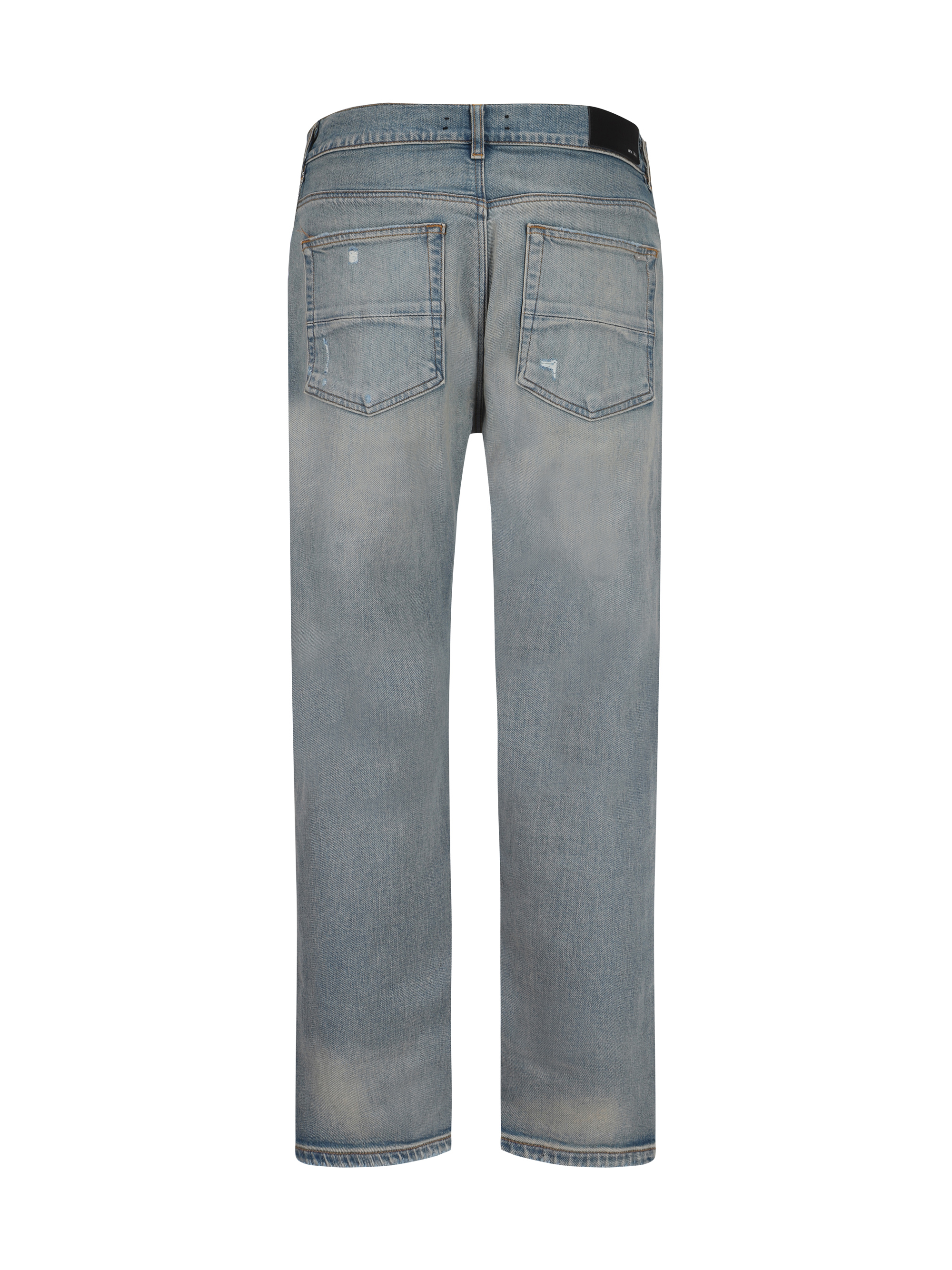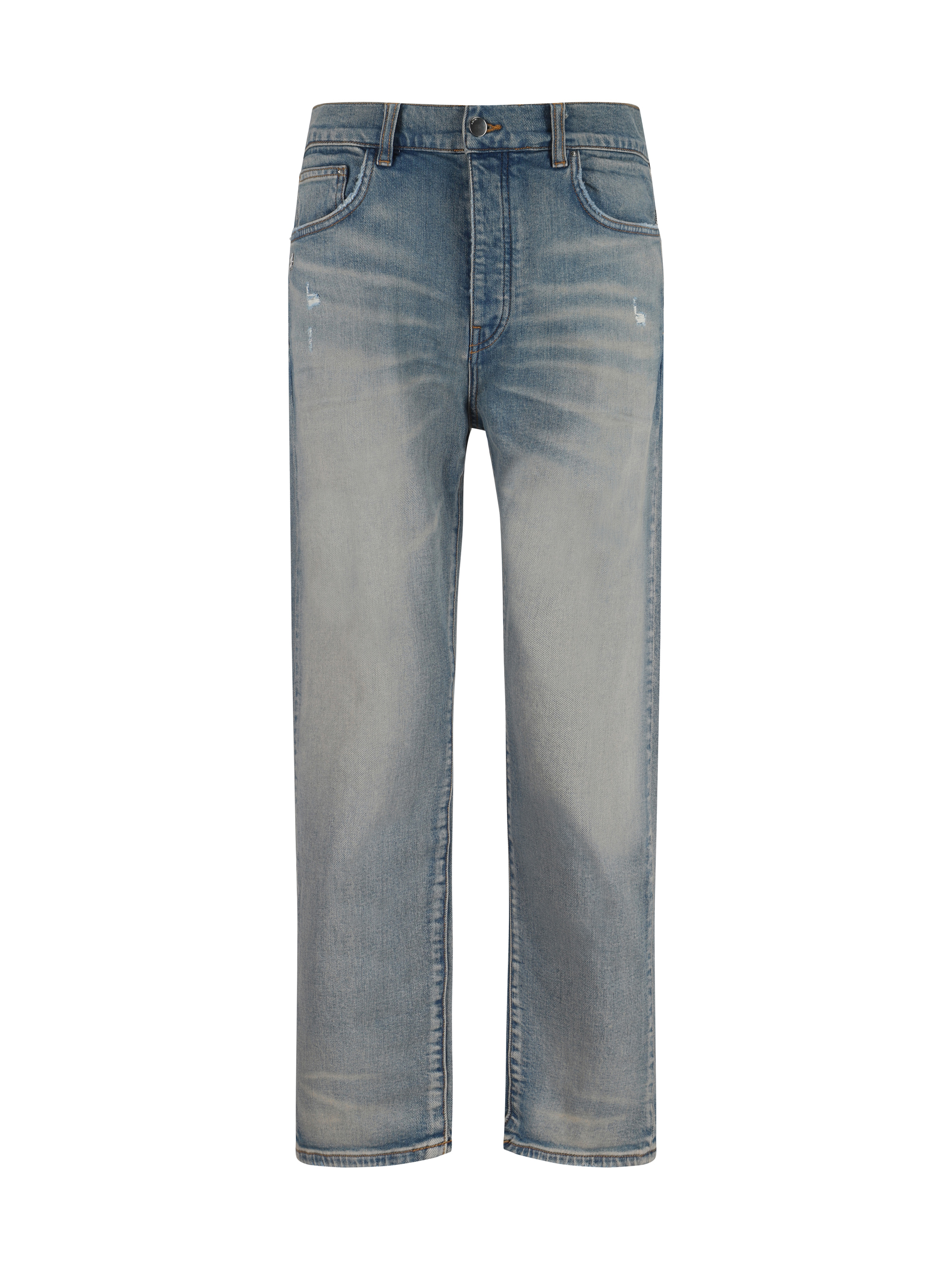 Cotton Slim Jeans by Amiri, five-pocket straight style, front button closure, front button closure, waist belt loops, iconic leather brand signature pressure-printed patch applied at back, vintage worn-effect design, iconic metal brand logo plaque applied at front.