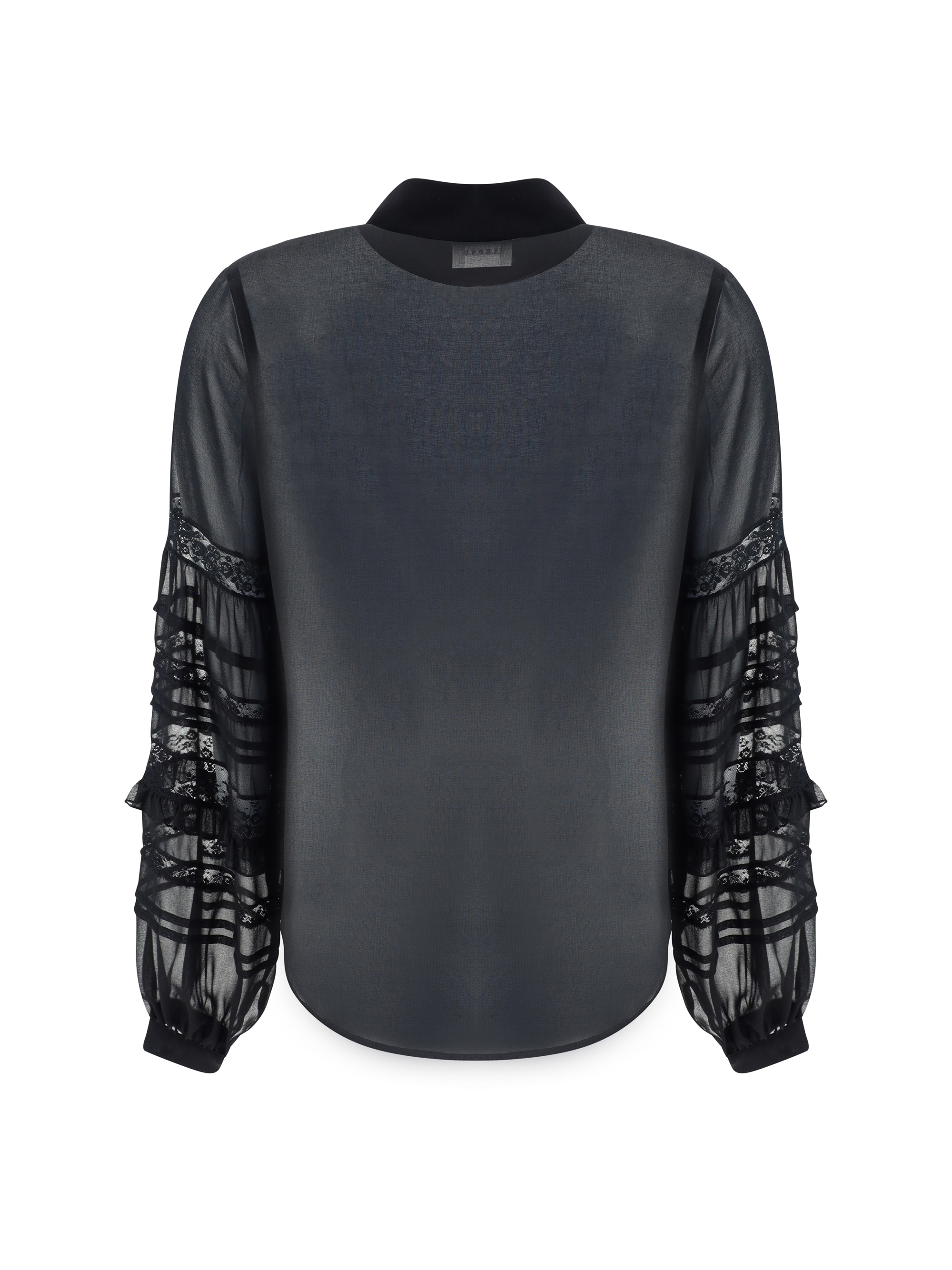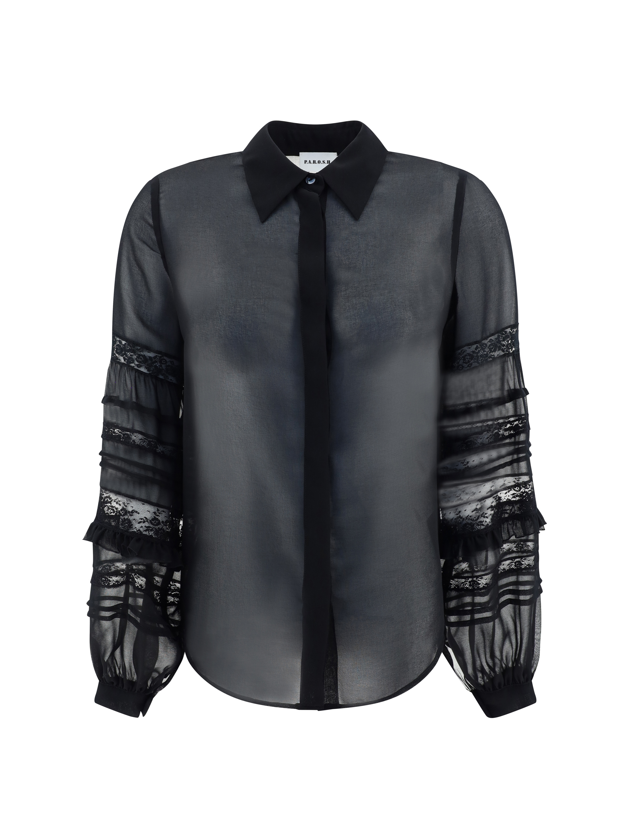 Polidori24w Shirt by P.A.R.O.S.H., semi-sheer design, classic collar, concealed front button closure, adjustable button cuffs, ruffle and lace applique details on sleeves, monochrome pattern, regular fit.