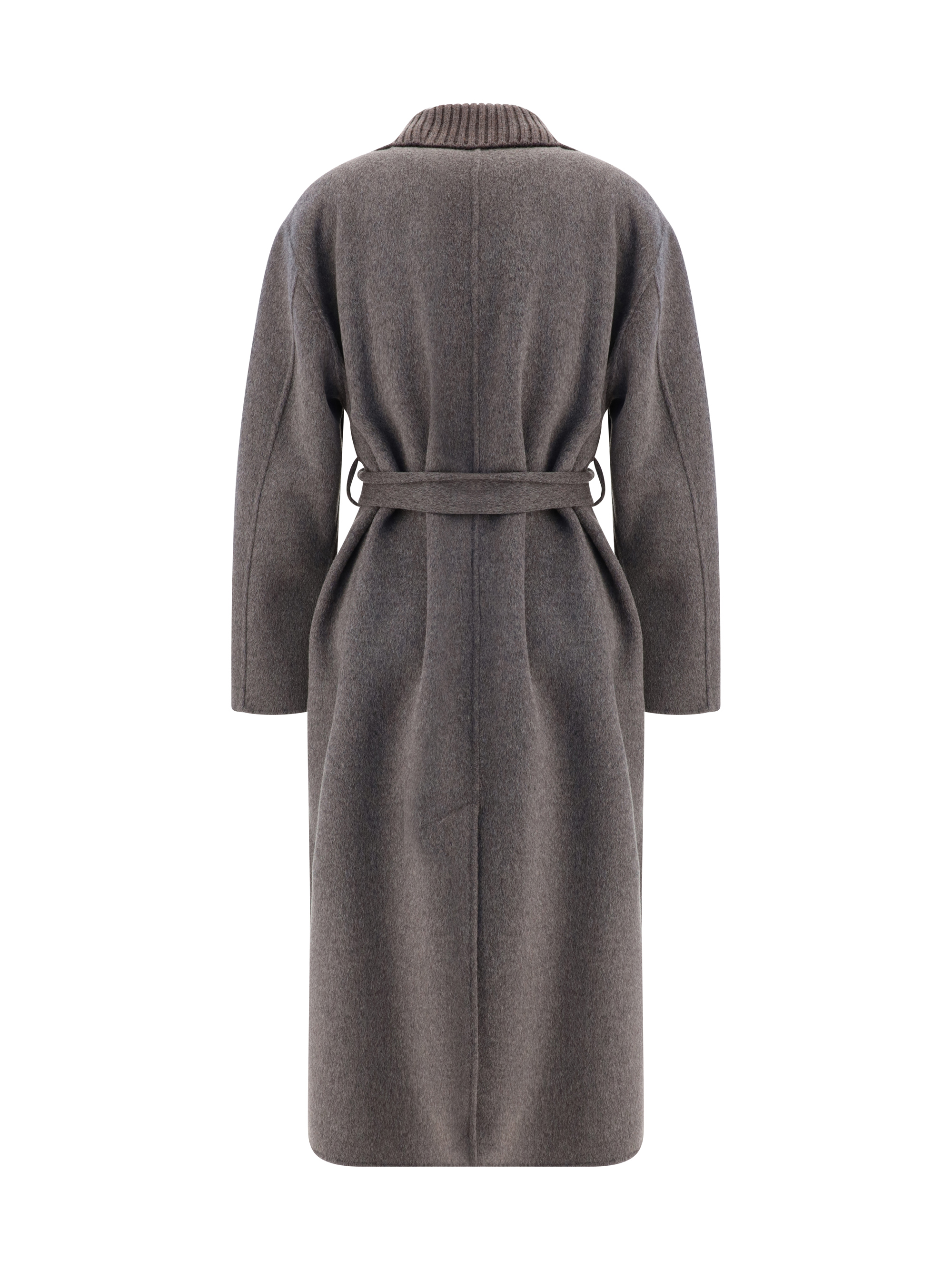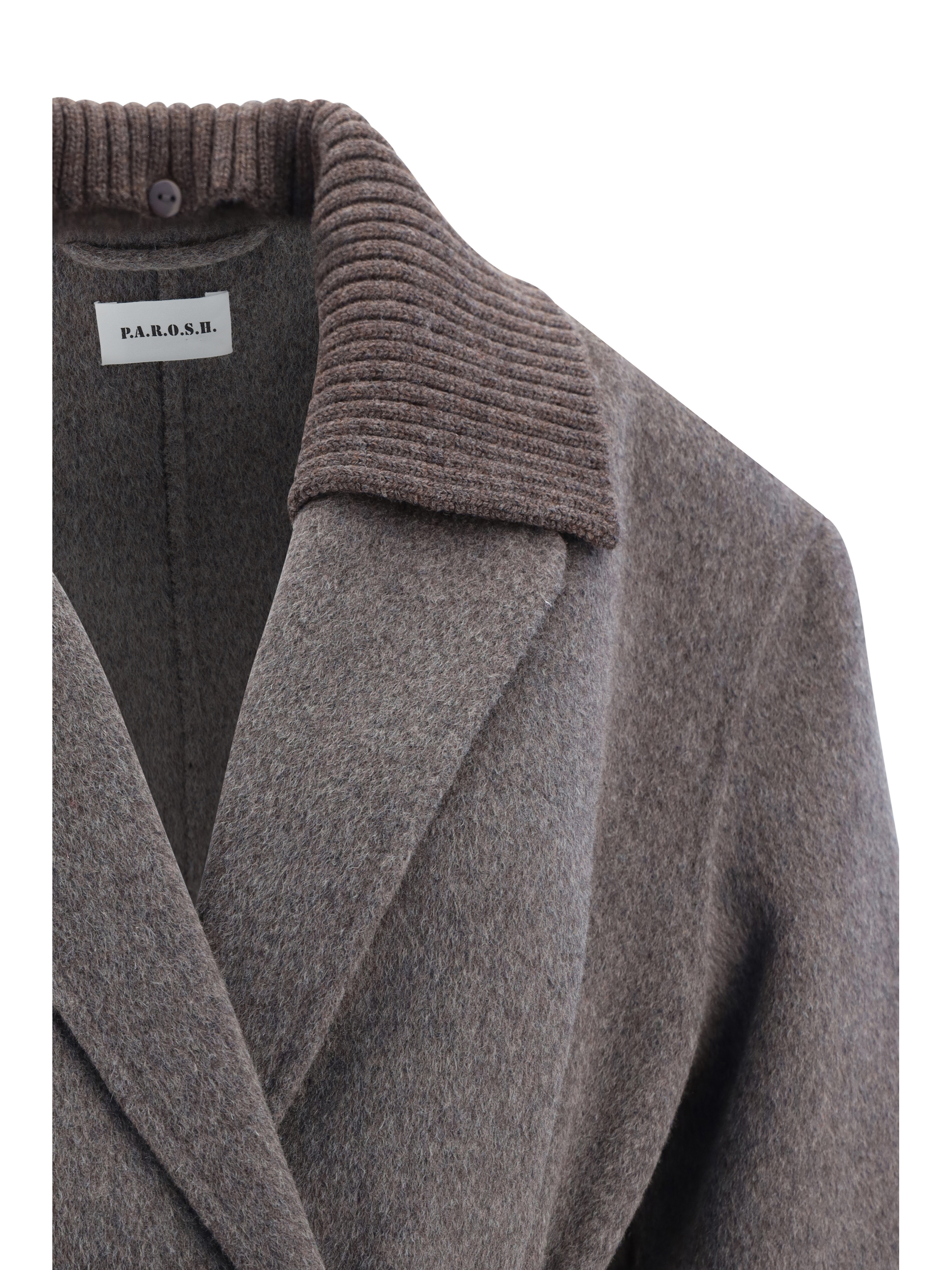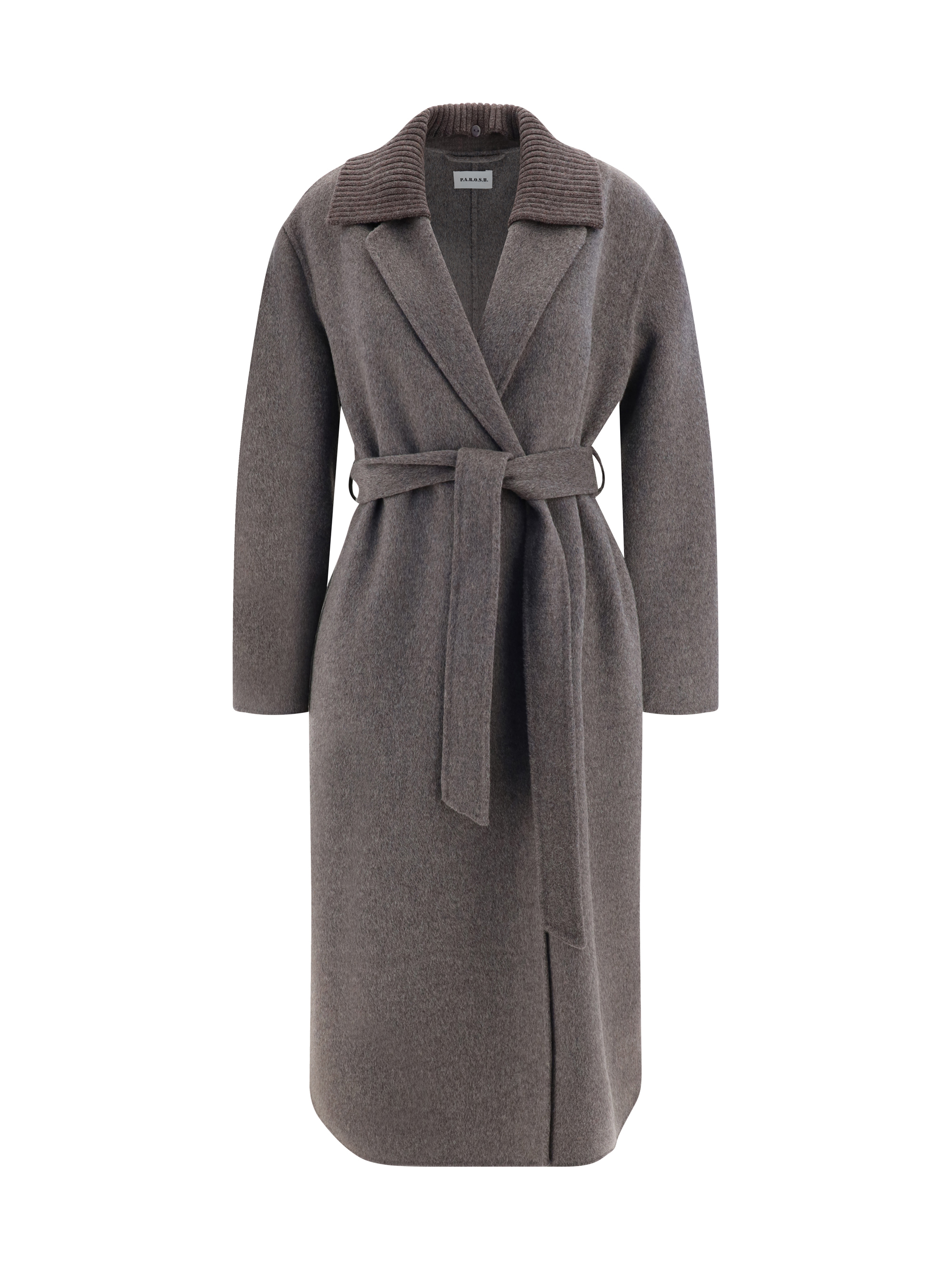 Leak24 Wool Coat by P.A.R.O.S.H., classic ribbed collar, two alternate welt pockets, matching removable knotted sash waistband, melange pattern, regular fit.