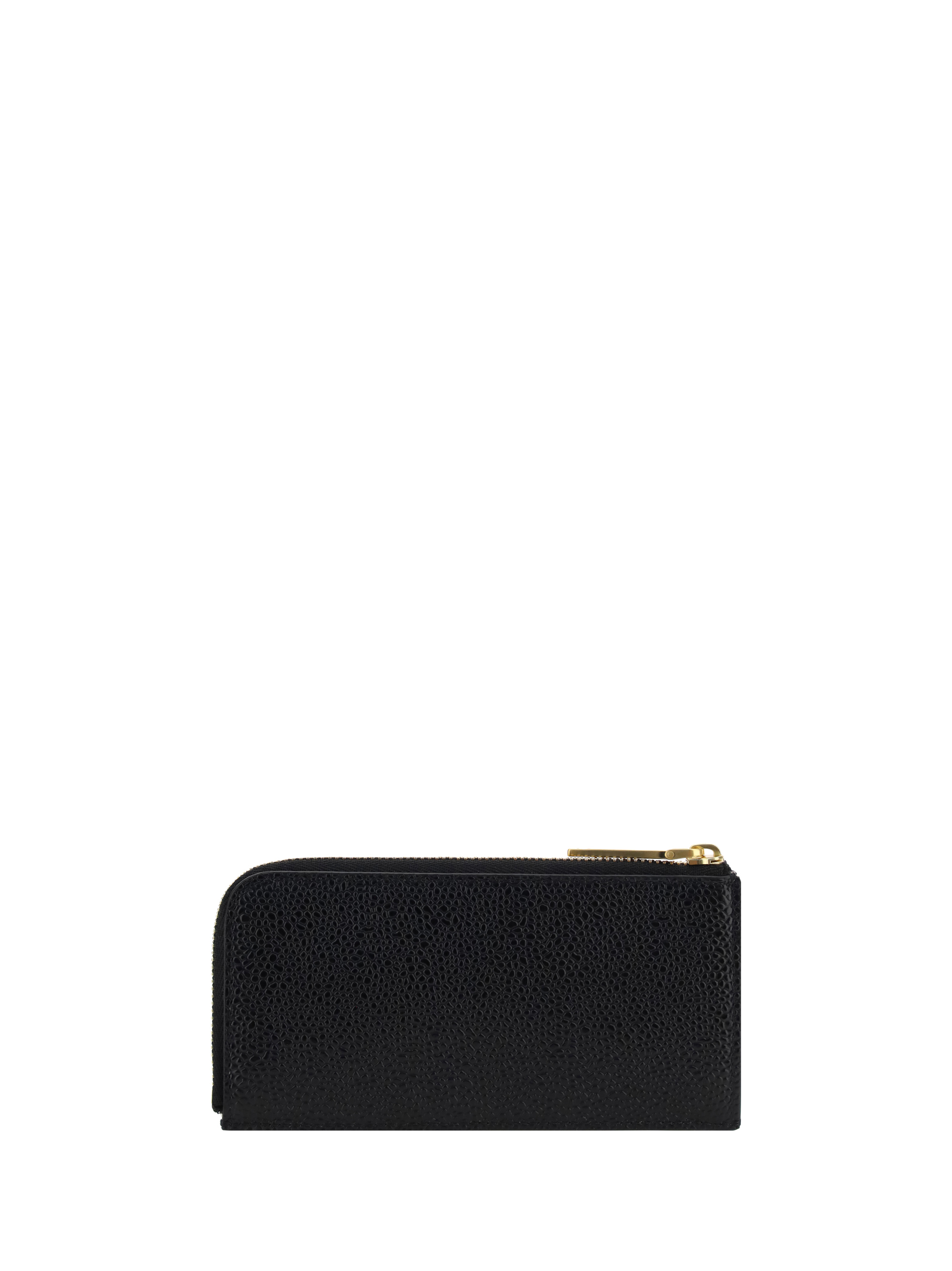 Calfskin Wallet by Thom Browne, card slot on the front, contrasting logo and label on the front, zippered coin purse, inner lining with iconic tricolor brand bands.