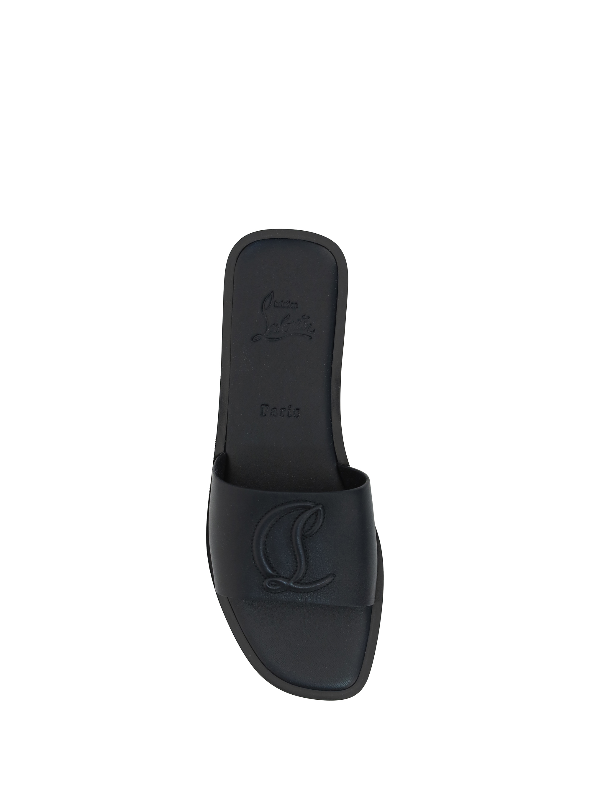 Calfskin CL Sandals by Christian Louboutin, flat leather sole, branded insole, front band with iconic brand monogram embossed on front, open toe on front.