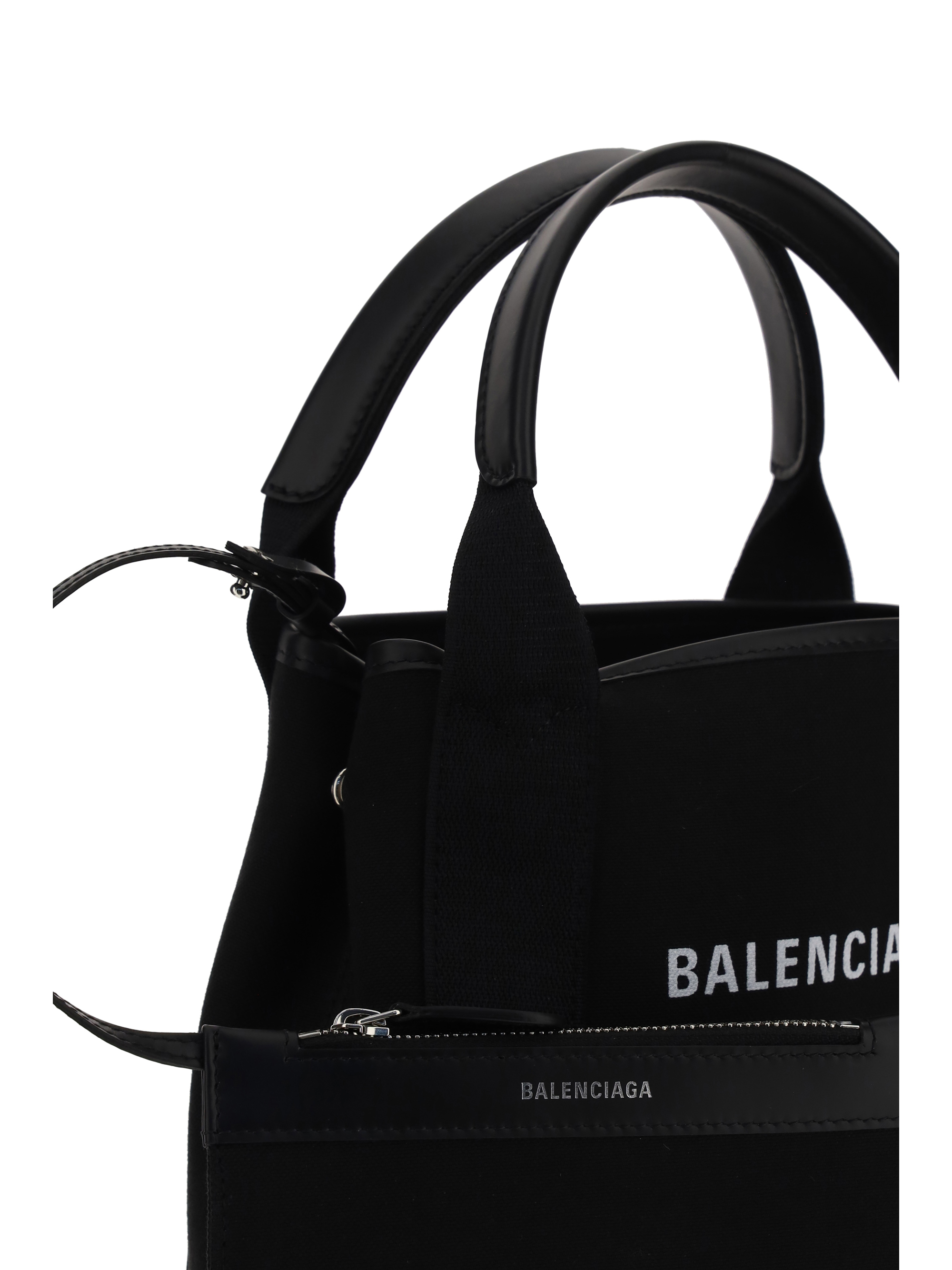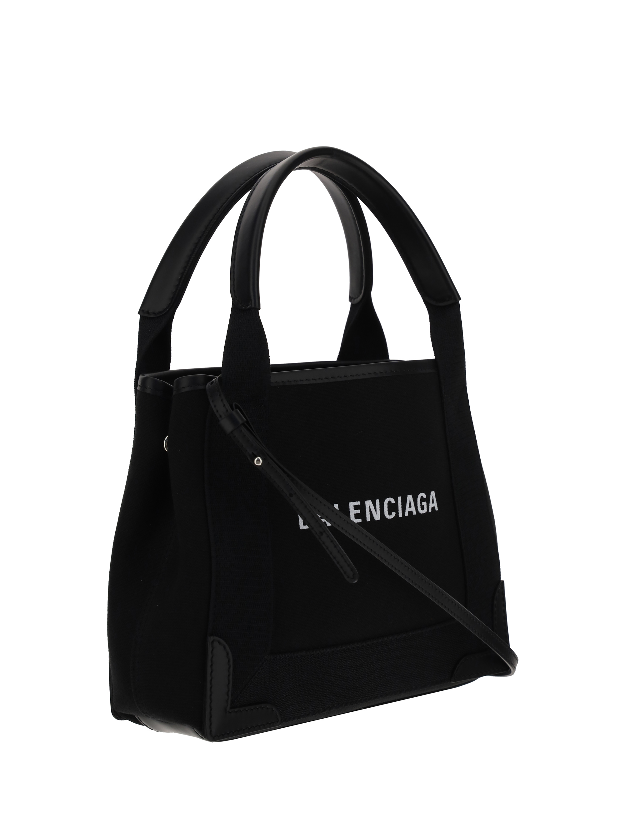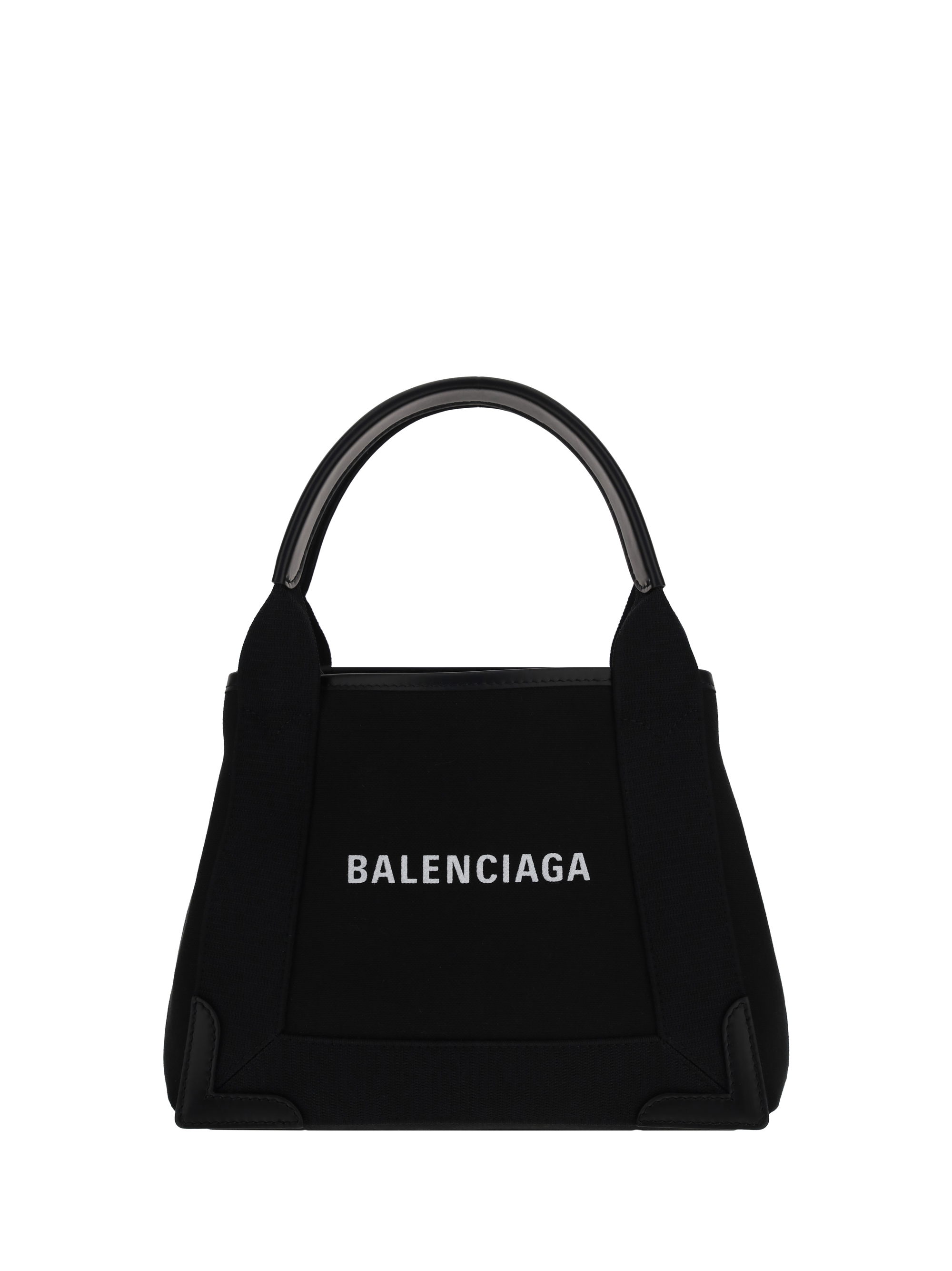 Cotton Cabas Handbag by Balenciaga, two rigid leather handles, iconic contrasting brand monogram on front, thin leather shoulder strap, snap buttons on sides, interior pouch with zipper closure.