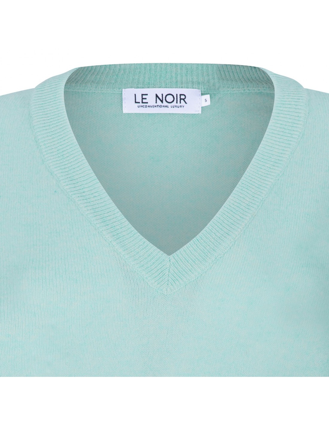 Mint cashmere Celia sweater from Le Noir featuring V-neck, long sleeves and ribbed knit edges.