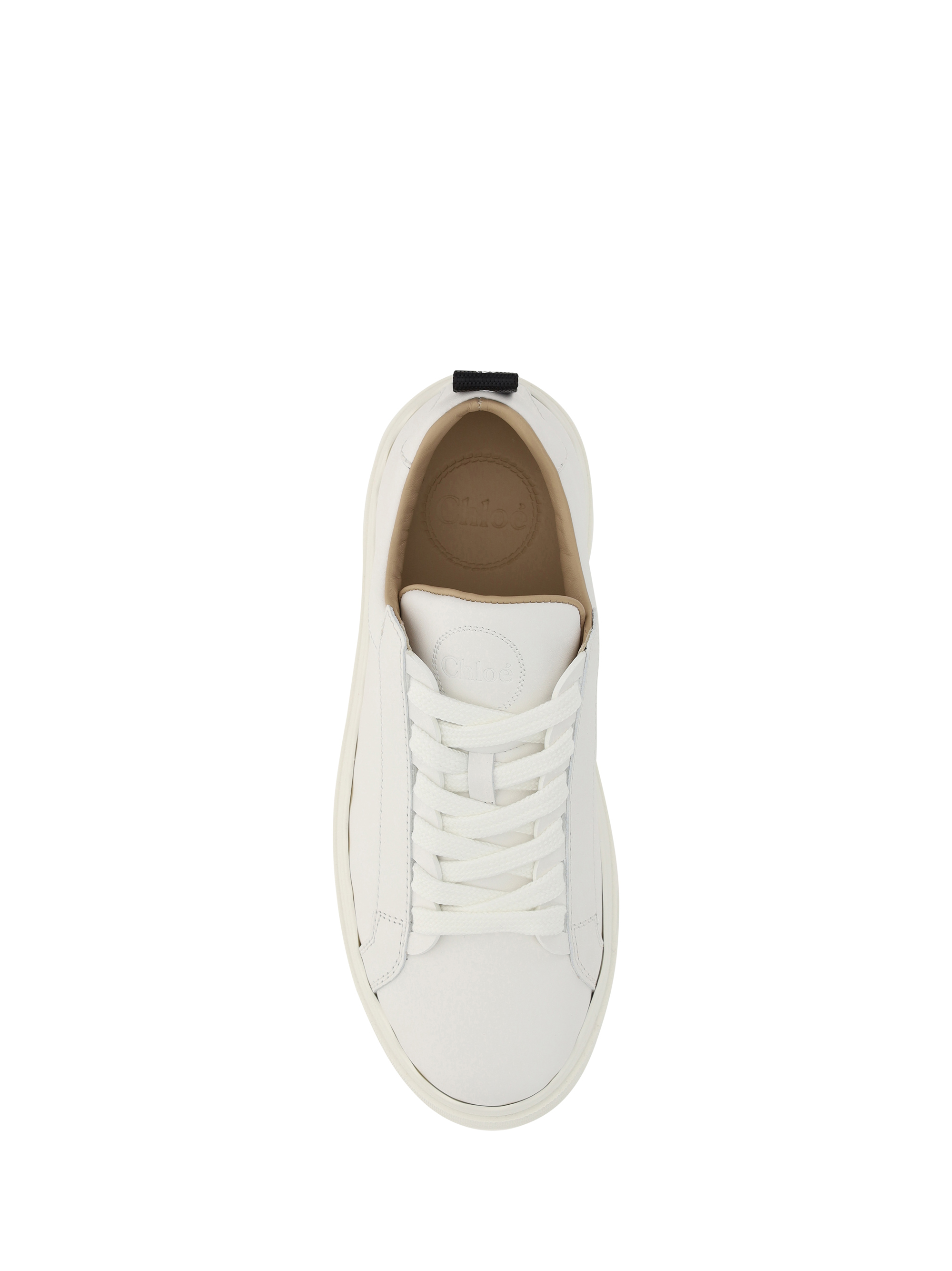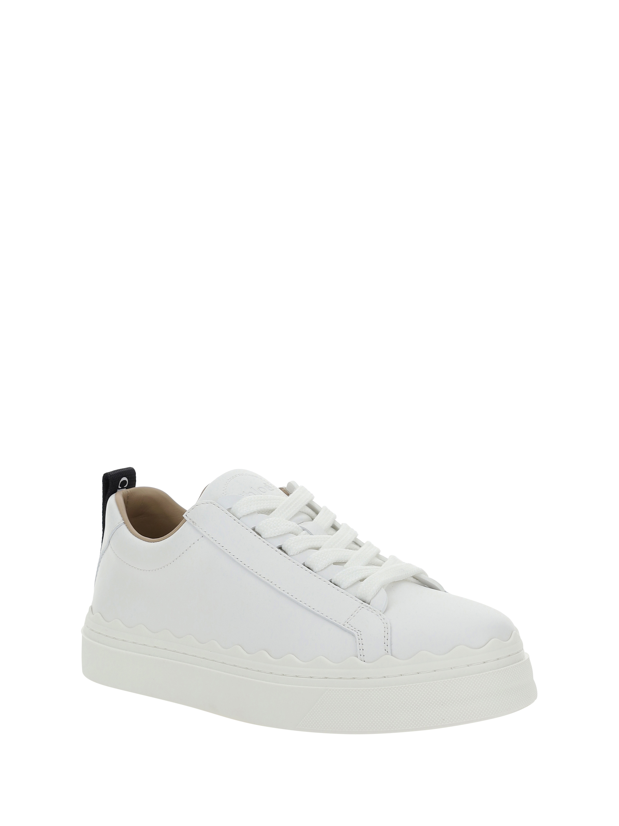 Calfskin Sneakers by Chloe, round toe, front lace-up closure, iconic brand logo press-stamped on tongue, contrasting logo-printed pull on back for easy on-and-off fit, and a sole with knurled edging.