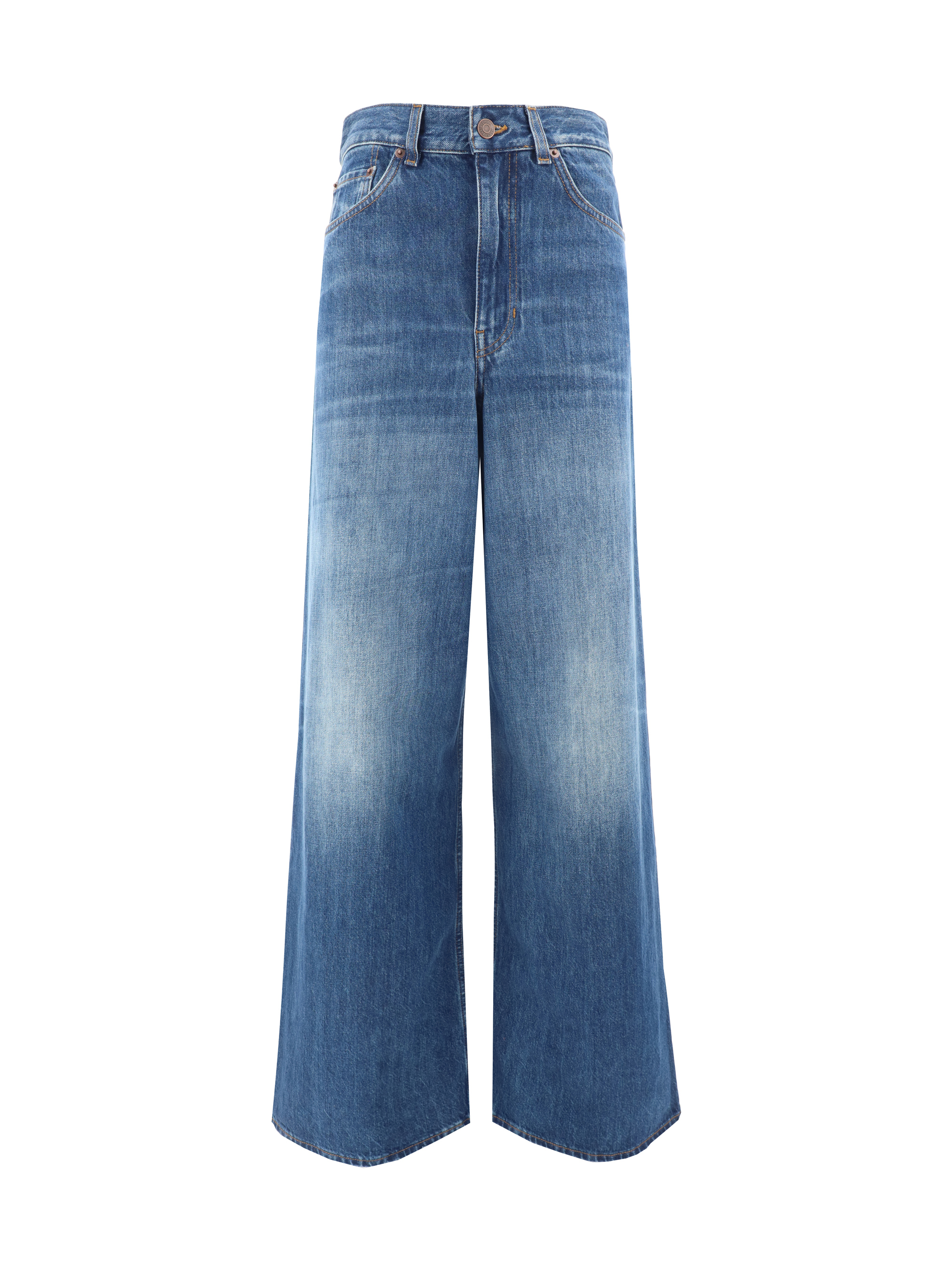 Cotton Jeans by Chloe, wide-leg five-pocket style, front button and zipper closure, belt loops for waistband, iconic branded signature leather pressure-printed patch applied at back.