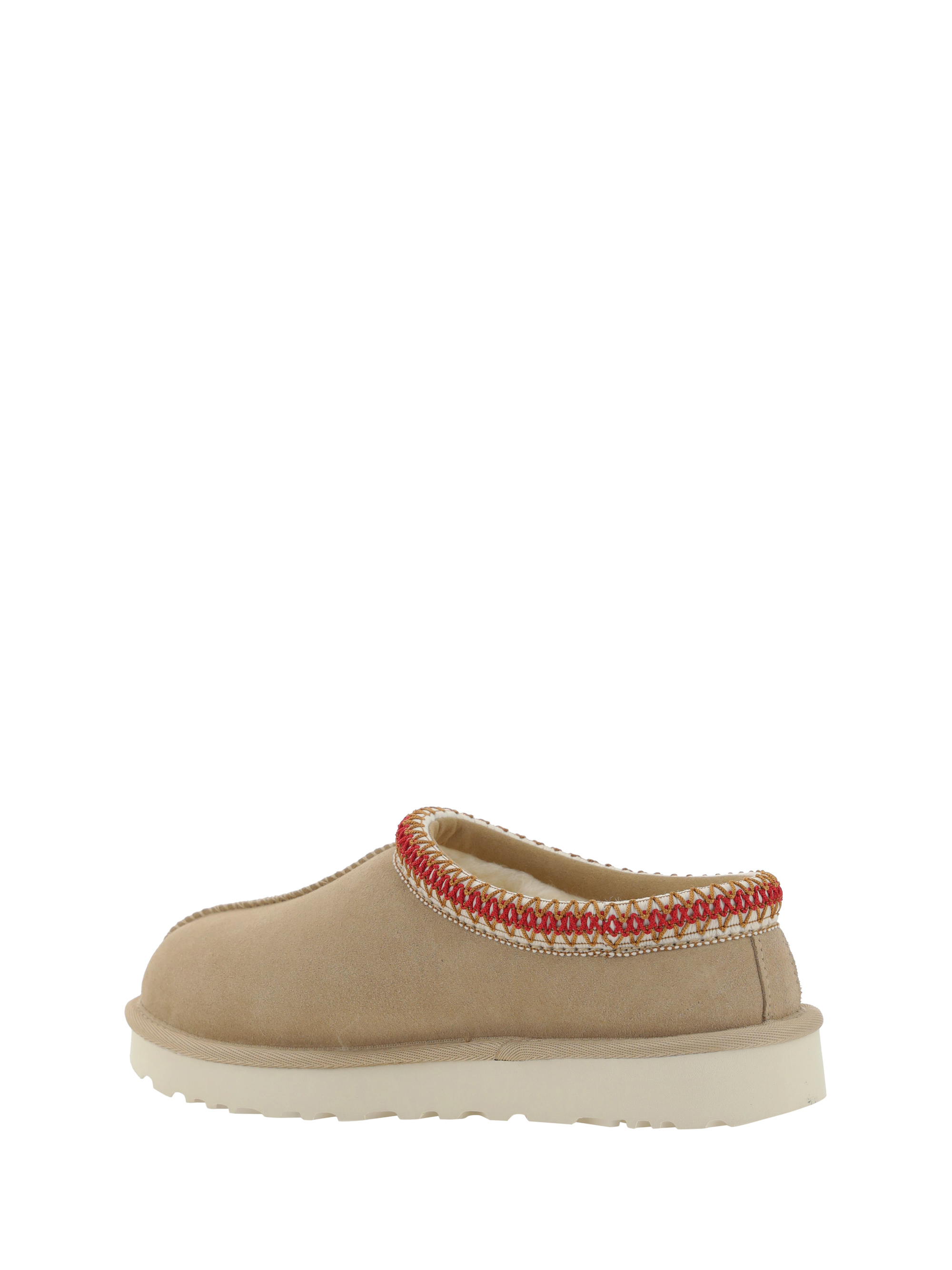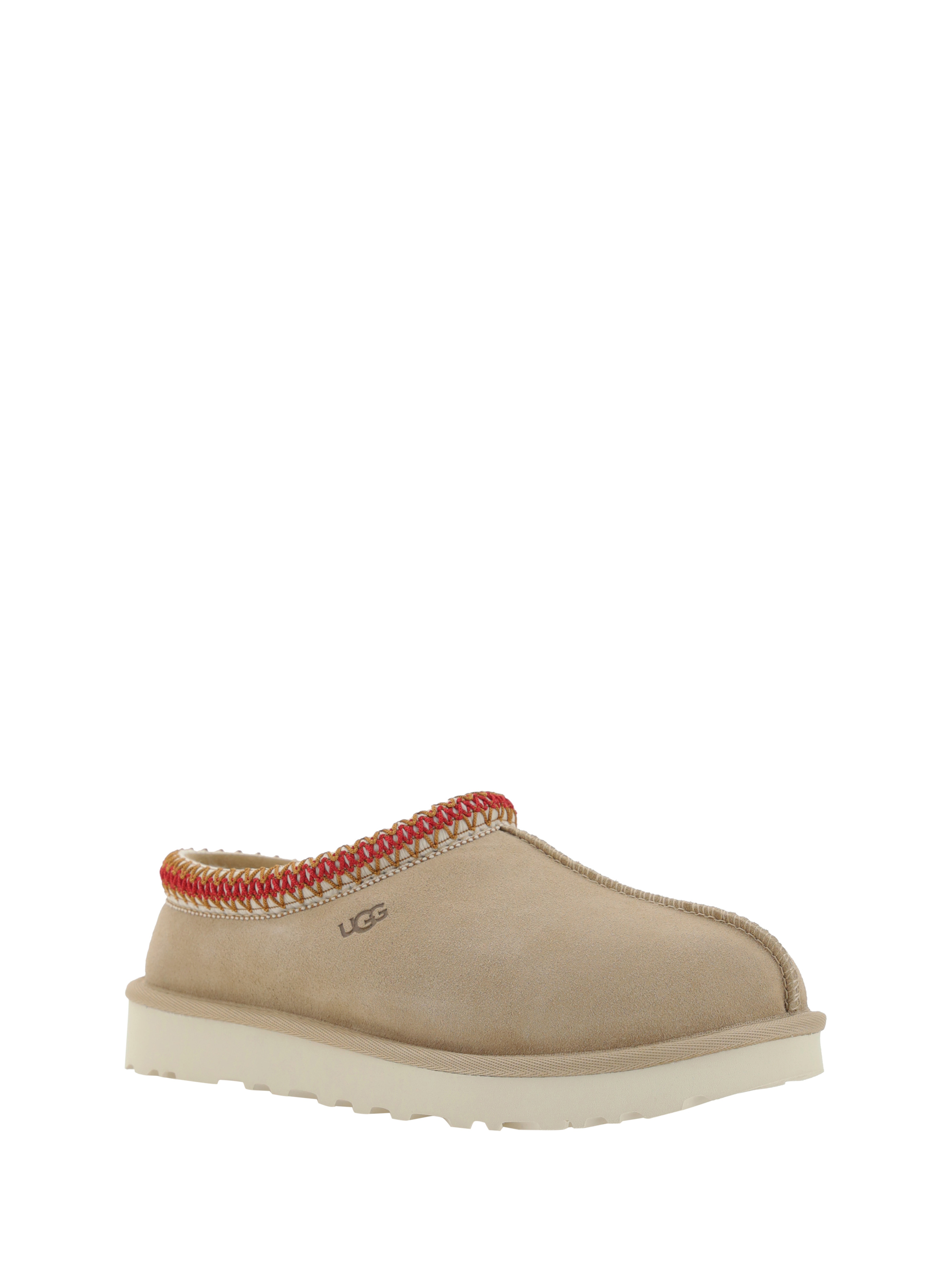 Goatskin Tasman Sabots by UGG, a knurled sole, round toe, suede effect design, soft shearling lining, iconic brand monogram embroidered on side panel, slip-on style.