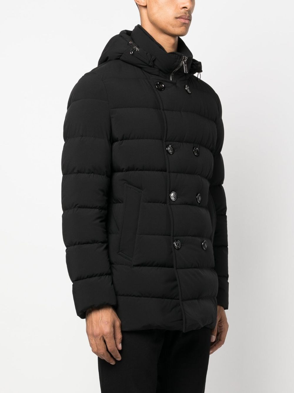 Double-breasted peacoat with a straight line, padded with goose down, quilted with boudin. Front zip fastening, double buttoning with buttonholes and horn buttons, side pockets. Adjustable and removable hood. Internally quilted on the back side, with double pocket.