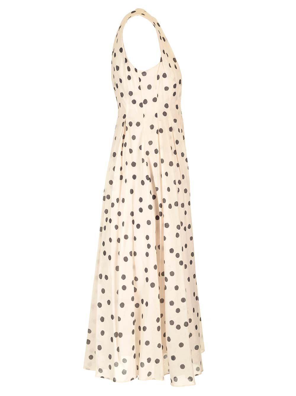 "Carol" midi dress from Max Mara' S in lightweight cotton voile with all-over printed motif, sleeveless silhouette, flared skirt with pleats, fitted bodice with plastron on the front. Lined model finished with round neckline and inset pockets on the sides, invisible back zip.