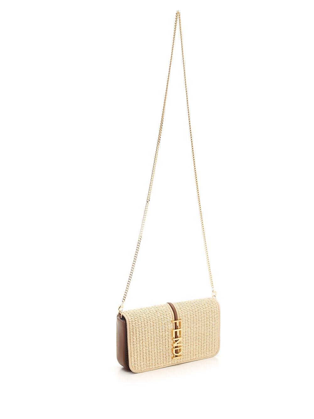 SKU B4504394 "Fendigraphy" wallet on chain from Fendi, in woven cotton fiber and tan brown leather, with golden metal finishes, with removable internal pouch with 8 card slots and zip pocket, removable thin chain shoulder strap. COD. 8BS076F1PLF