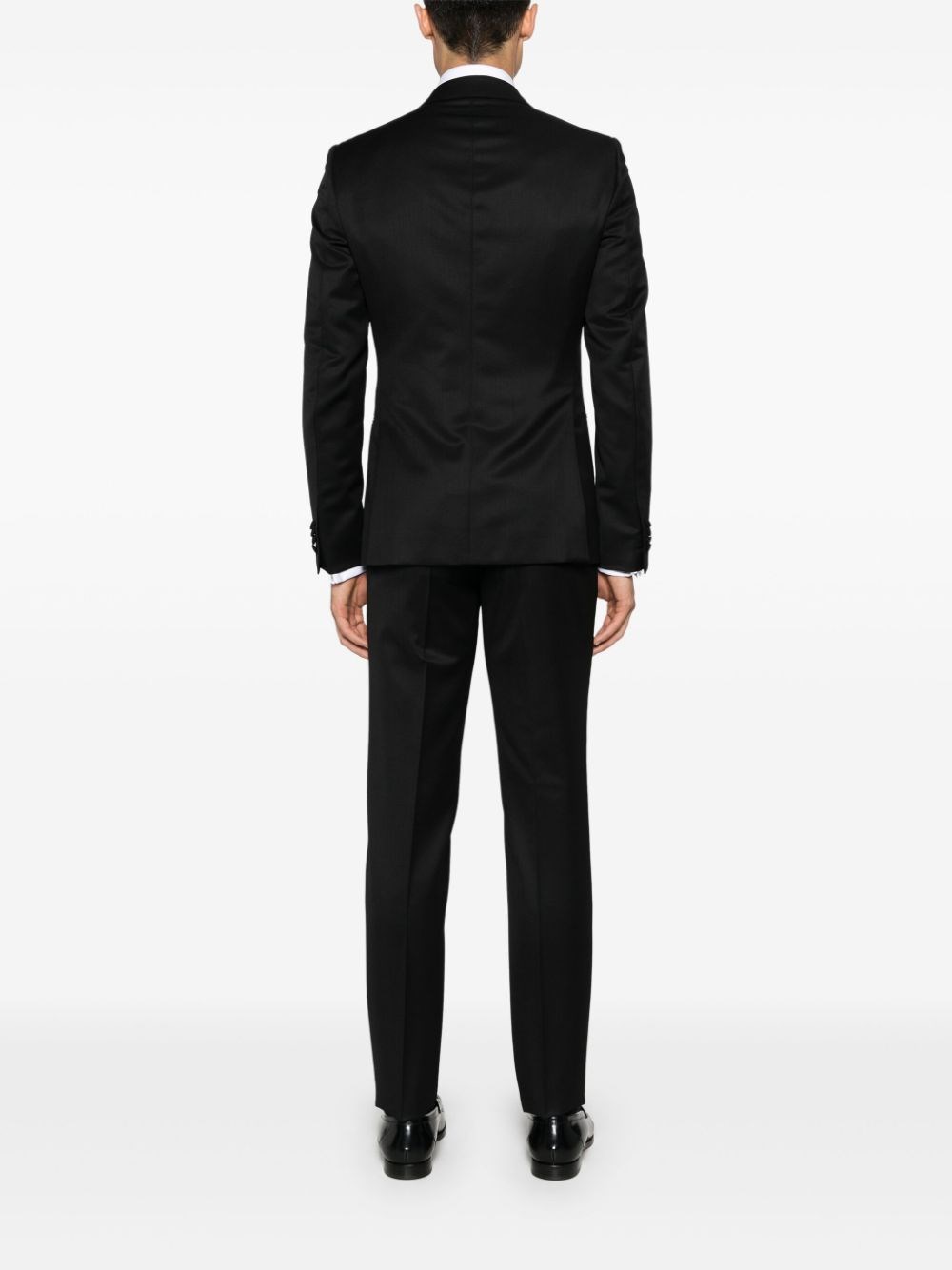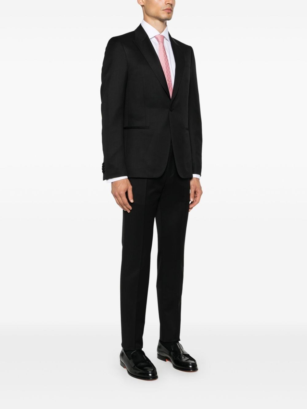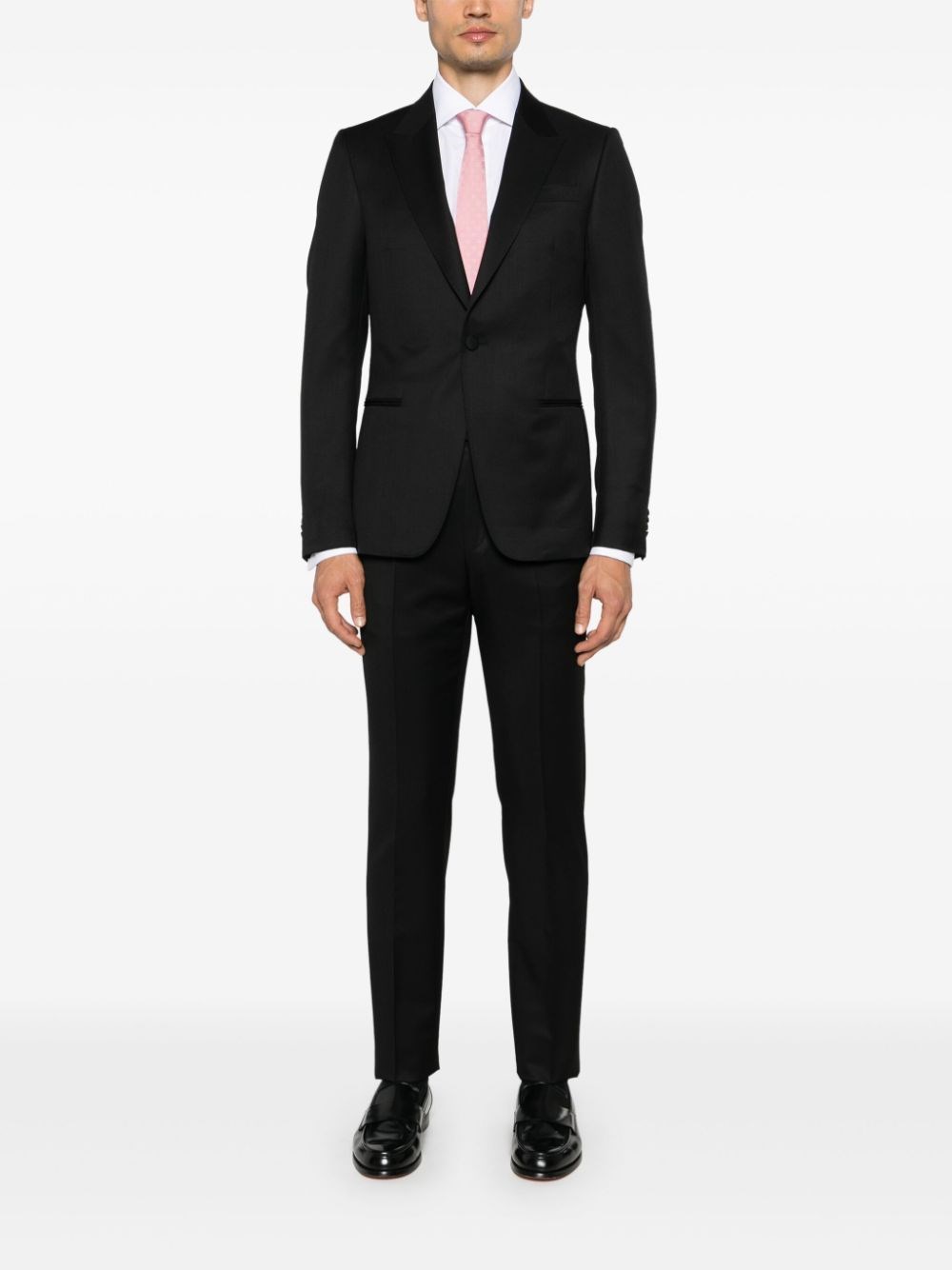 SKU B4501527 Black Solid Wool And Mohair Tailored Evening Suit, Drop 8, 260 Gr, Slim Fit, 72 Cm Length, Lined, Fused, Peak Lapel, Buttons Closure, Single Breast, Welt Pockets, Double Vent, Flat Front Trousers, 19 COD. 822776A8-283KGQ822776A8
