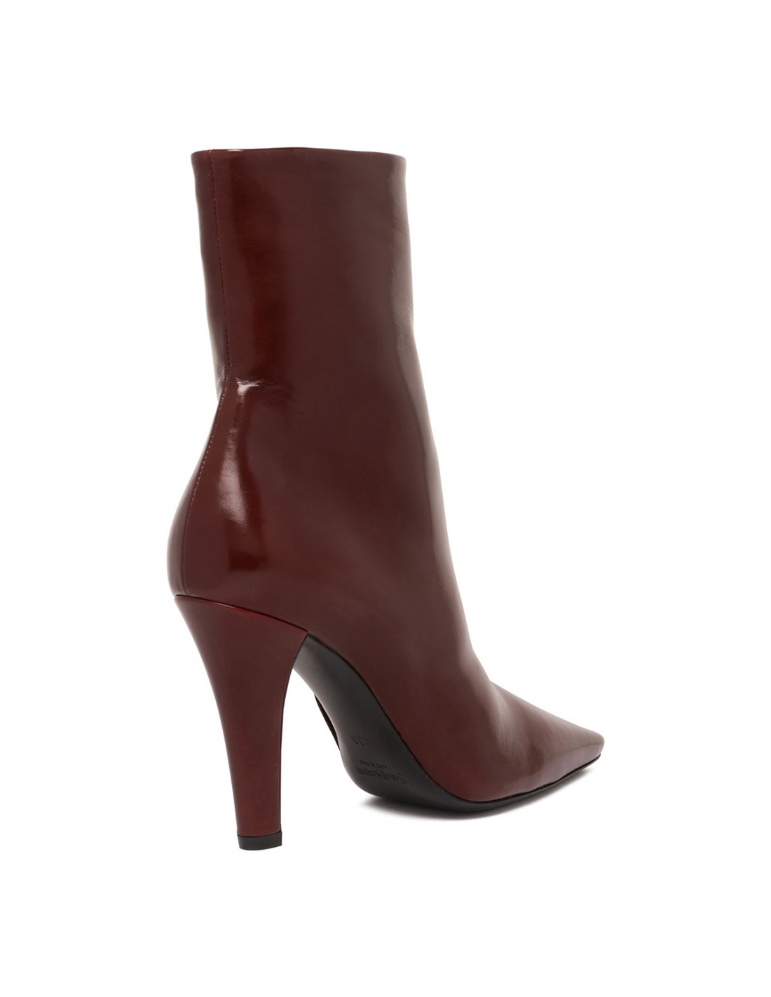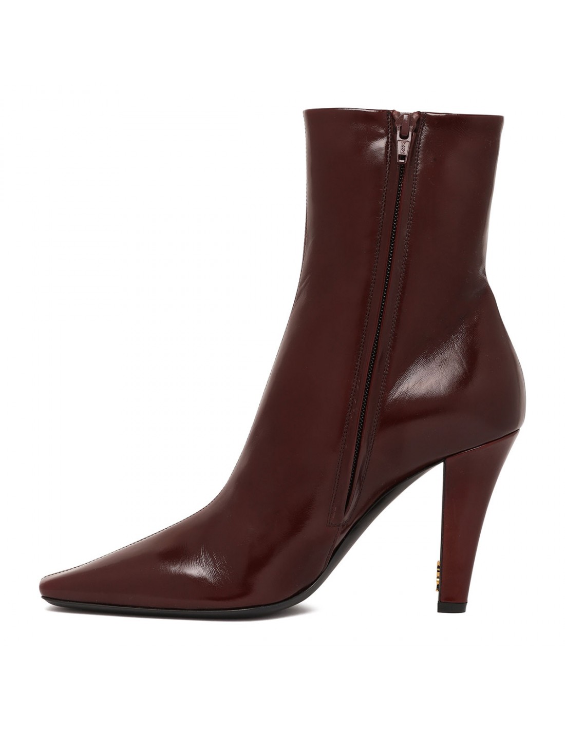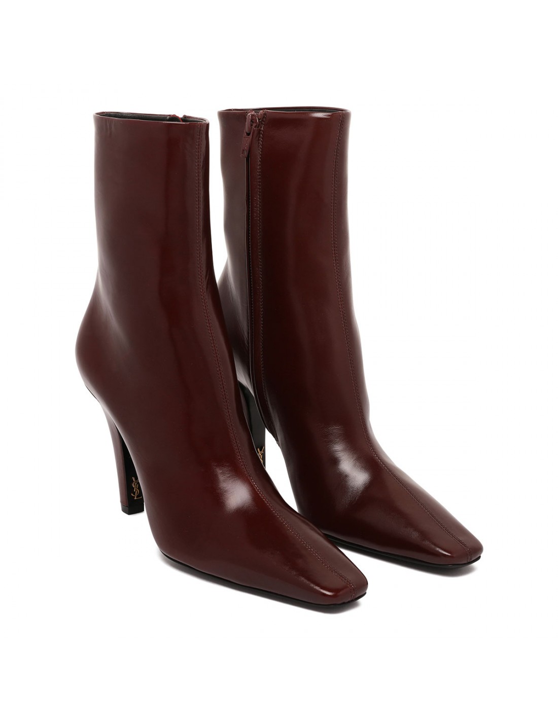 Bordeaux smooth leather Jill booties from Saint Laurent featuring square pointed toe, tapered block heel with inner bronze-tone metal Cassandre, zip fastening at side, leather insole and sole.