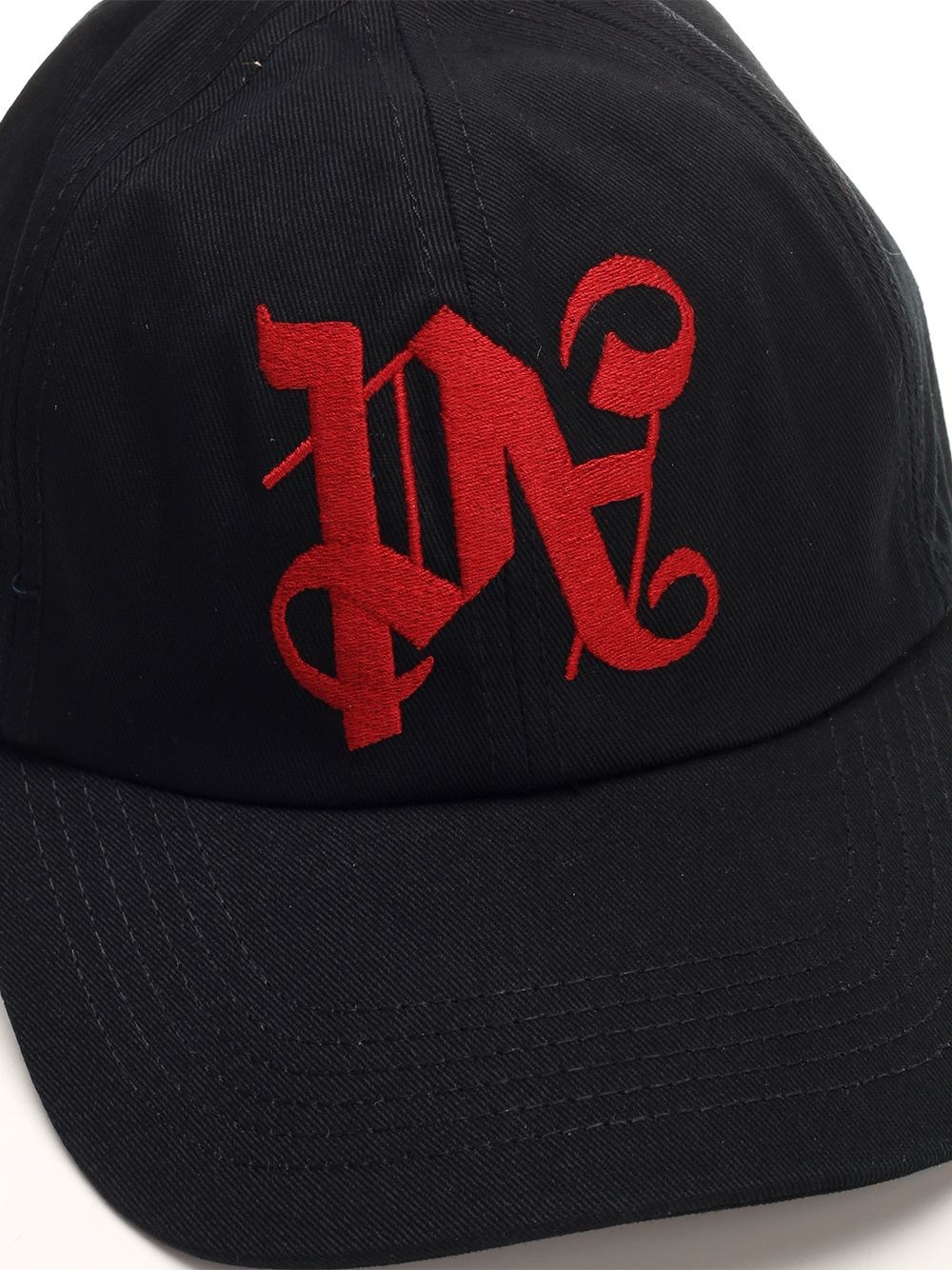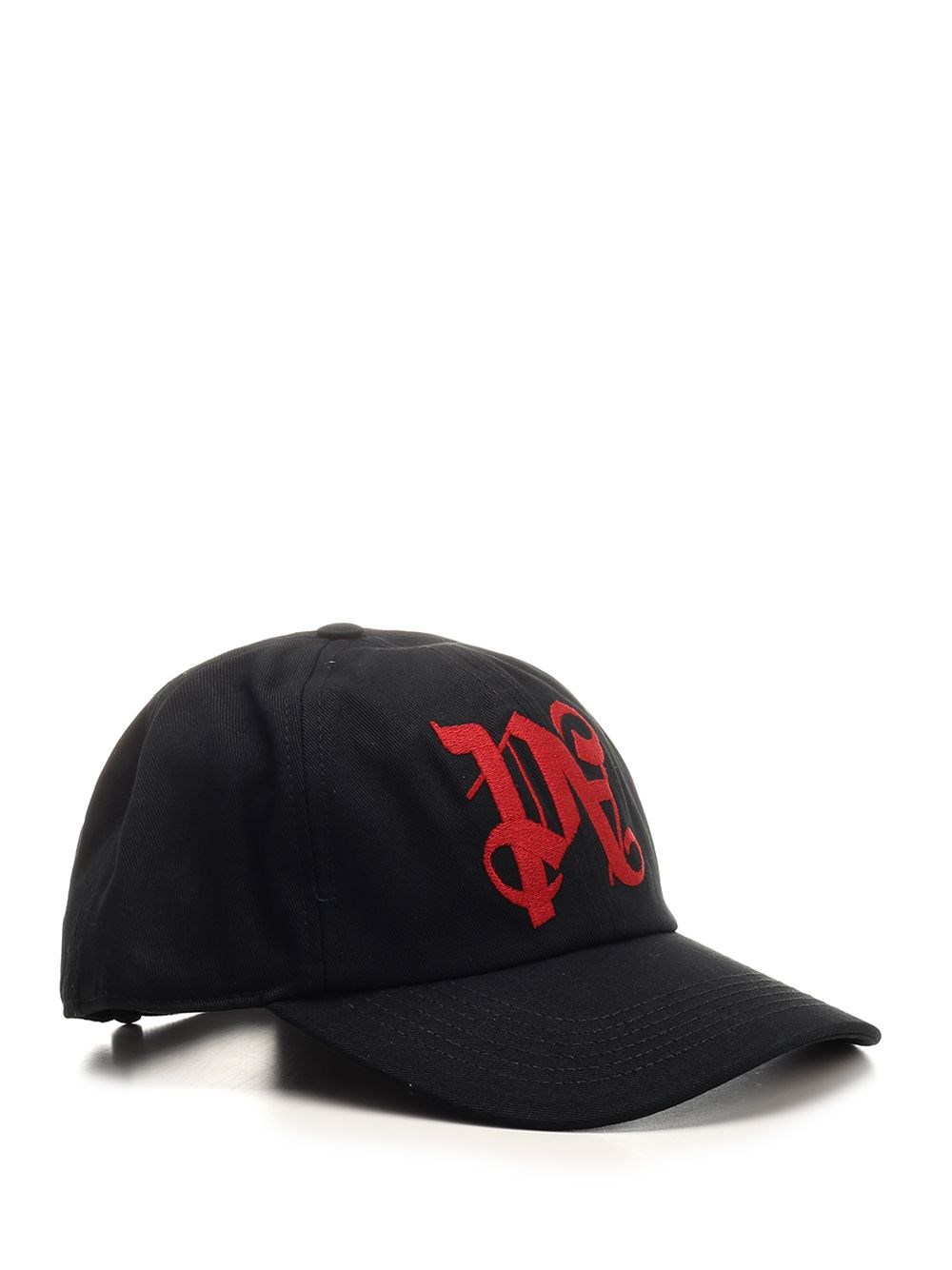 SKU B4504034 Black cotton monogram baseball hat from Palm Angels, with monogram embroidered on the front in red. COD. PMLB104F24FAB0041026