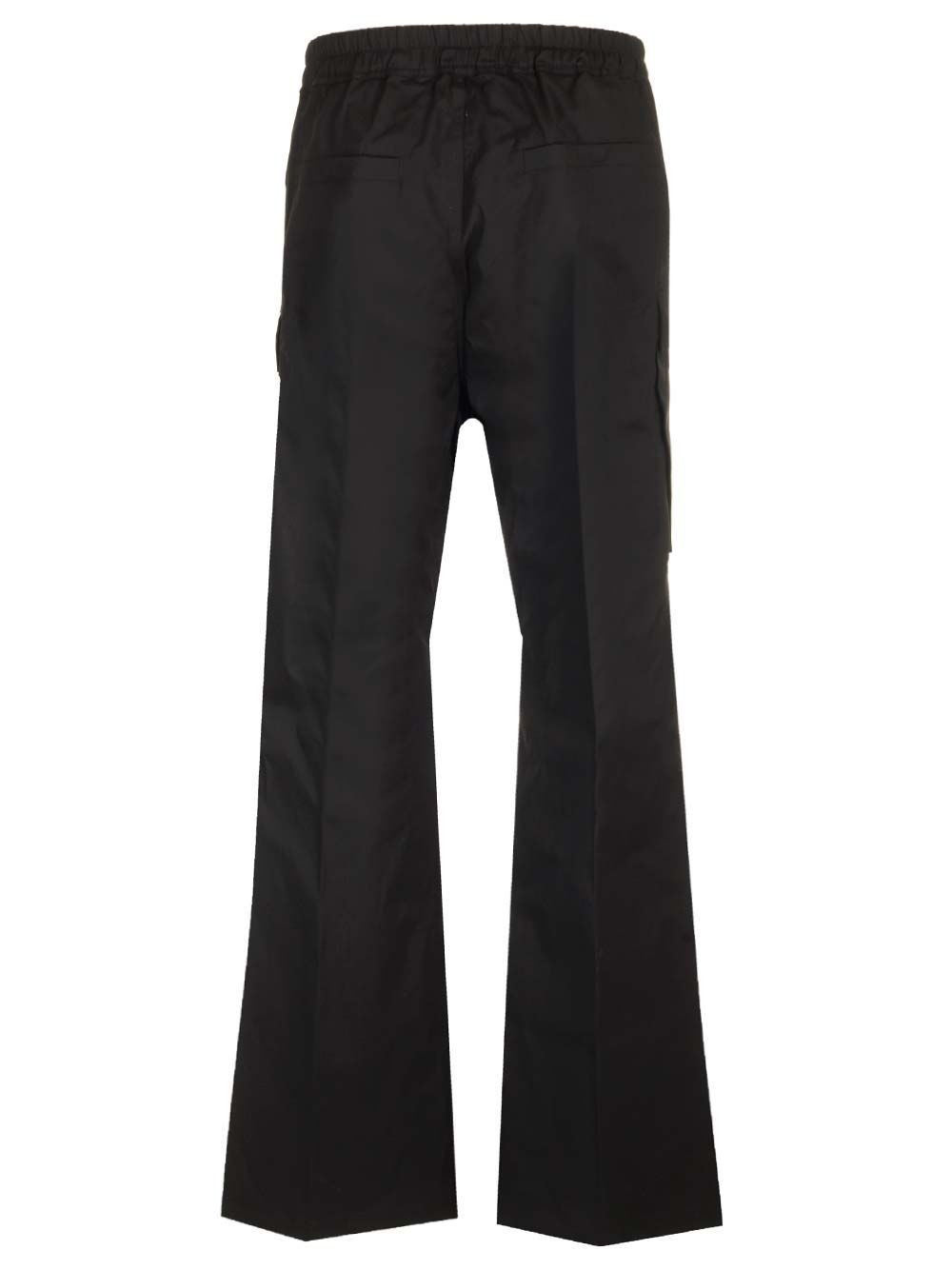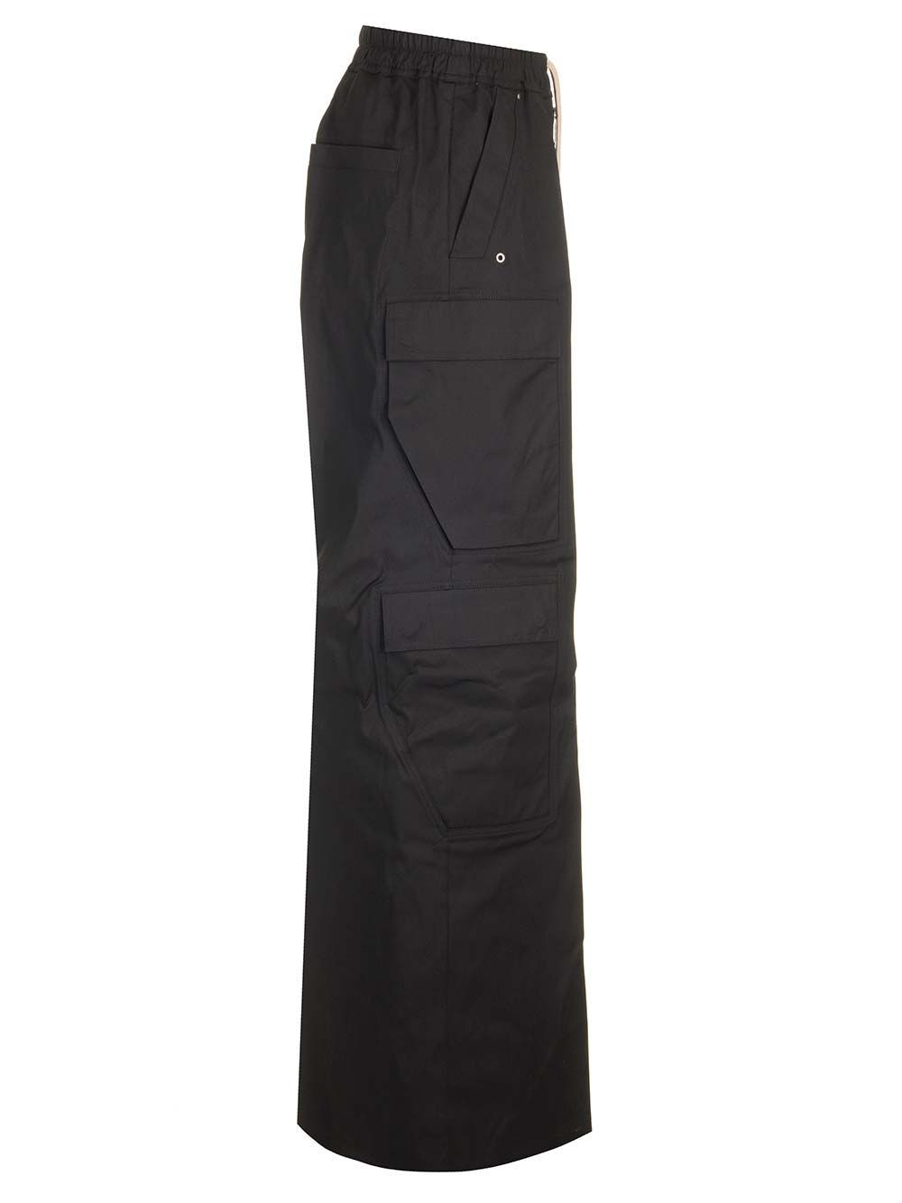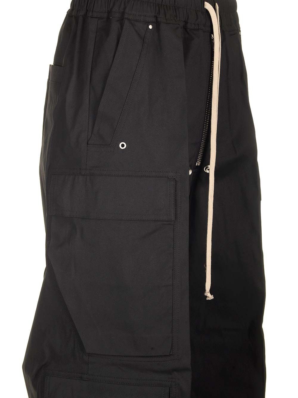 Black stretch cotton "Cargobelas" trousers from Rick Owens, with low crotch and wide leg, elasticated waistband with drawstring, visible central zip with two snap buttons at the bottom, side welt pockets, 4 slanted cargo pockets on the side of the leg and two back welt pockets with hidden snap buttons.