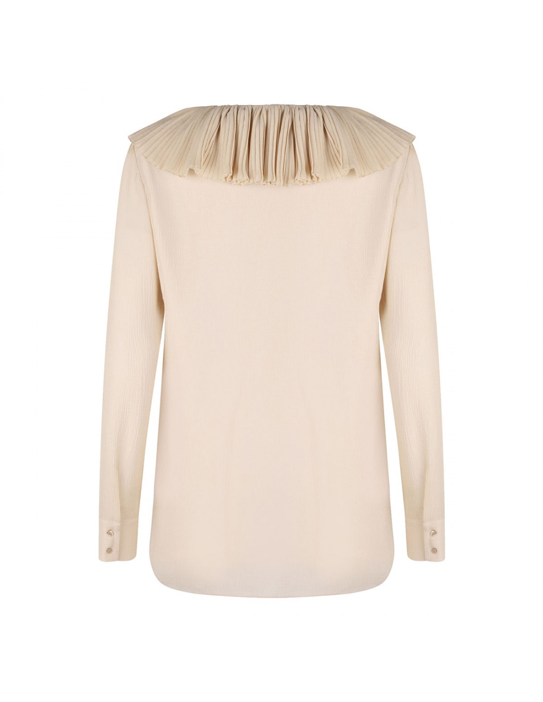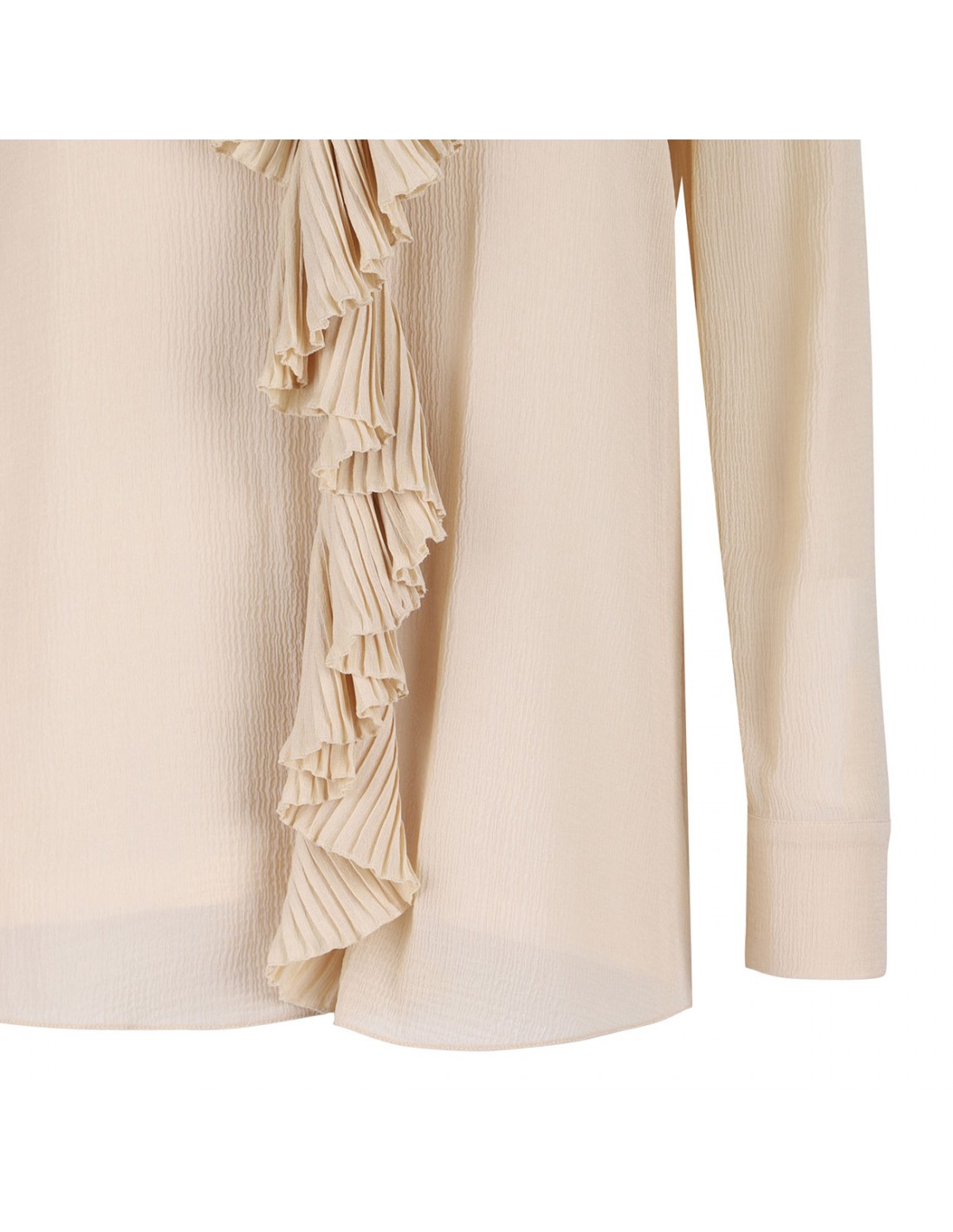 Beige semi-sheer silk crepon muslin blouse from Saint Laurent featuring plunging V-neck with ruffled plisse collar and front, button fastening along front, long sleeves with buttoned cuffs.