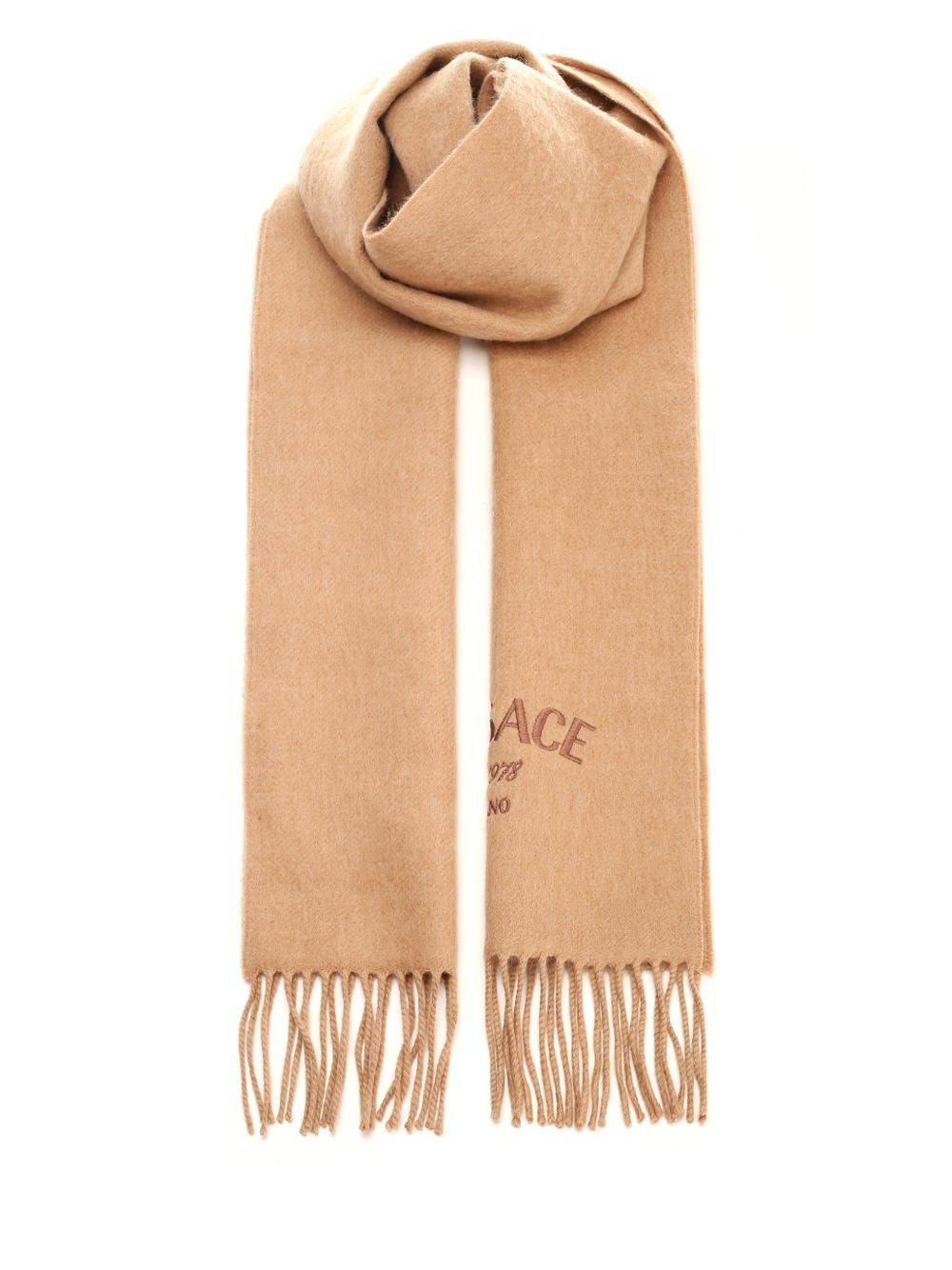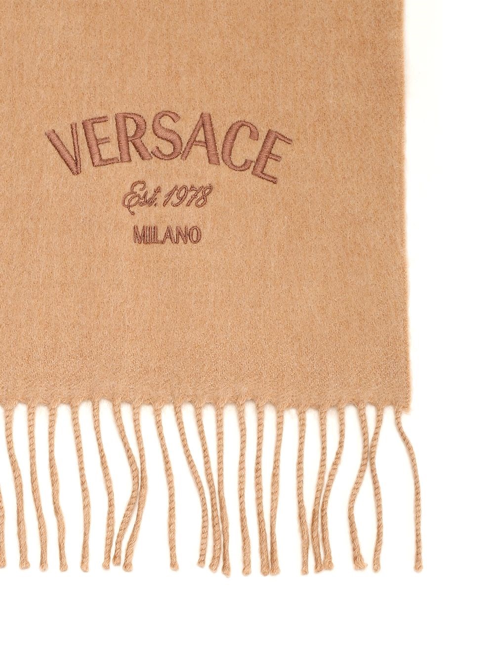 SKU B4507806 Wool scarf from Versace, with fringes at the ends and embossed Versace Milano Stamp logo. COD. 1013625_1A099931KF70