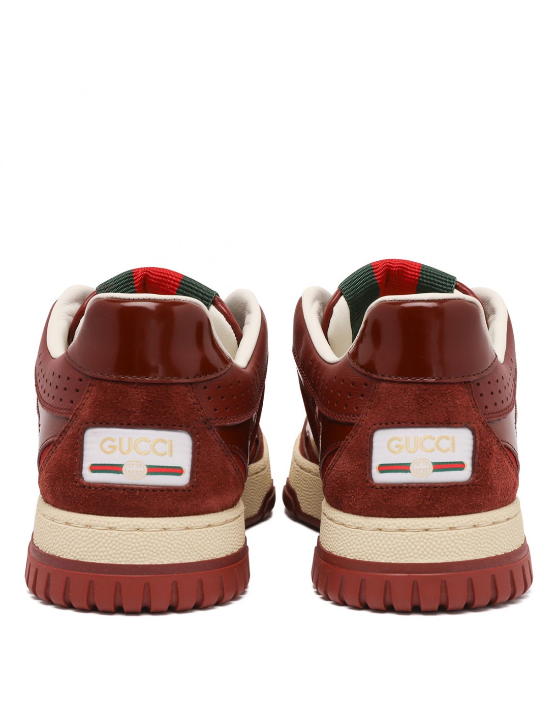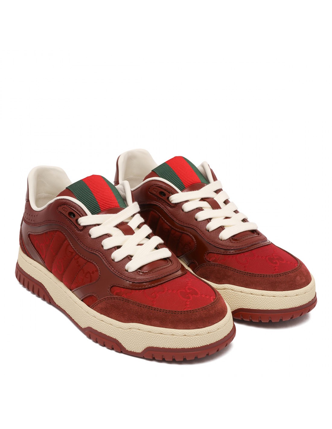Rosso Ancora red GG canvas Re-Web sneakers from Gucci featuring Rosso Ancora red leather trim, logo script and Interlocking G Web tag, interlocking G details on the eyelets, Web on tongue, round toe, lace-up fastening, low heel, leather lining, rubber outsole with Interlocking G and script logo.