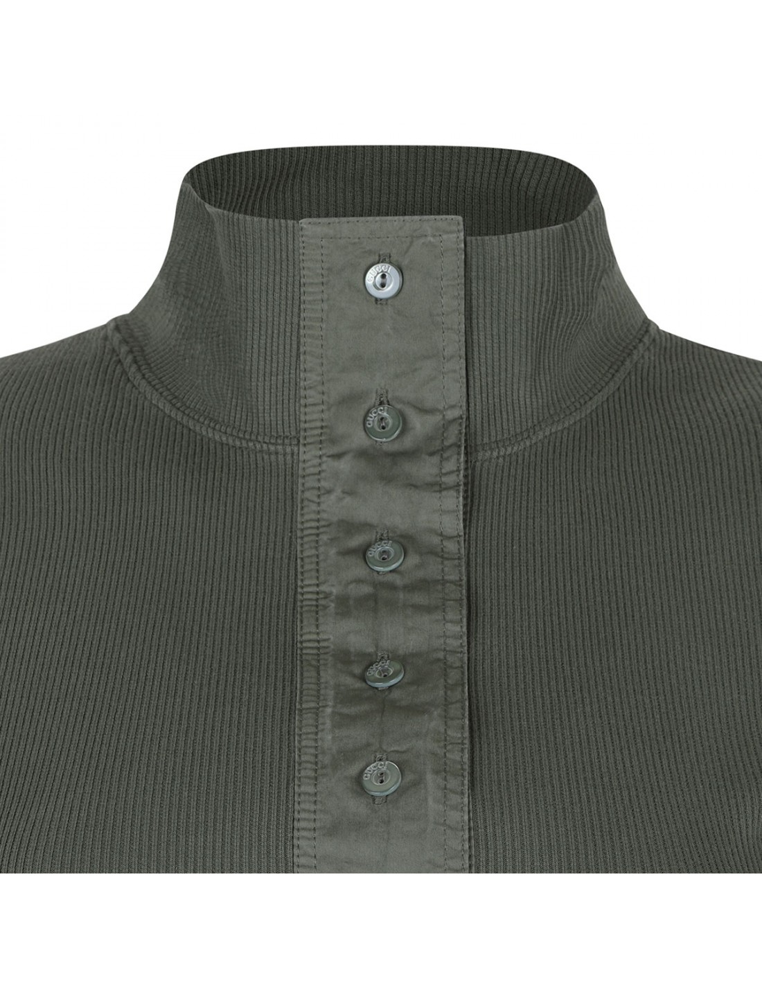 Forest green rib-knit heavy cotton top from Gucci featuring poplin trim on the neckline and sides, logo embroidery, standup collar, long sleeves and button closure.