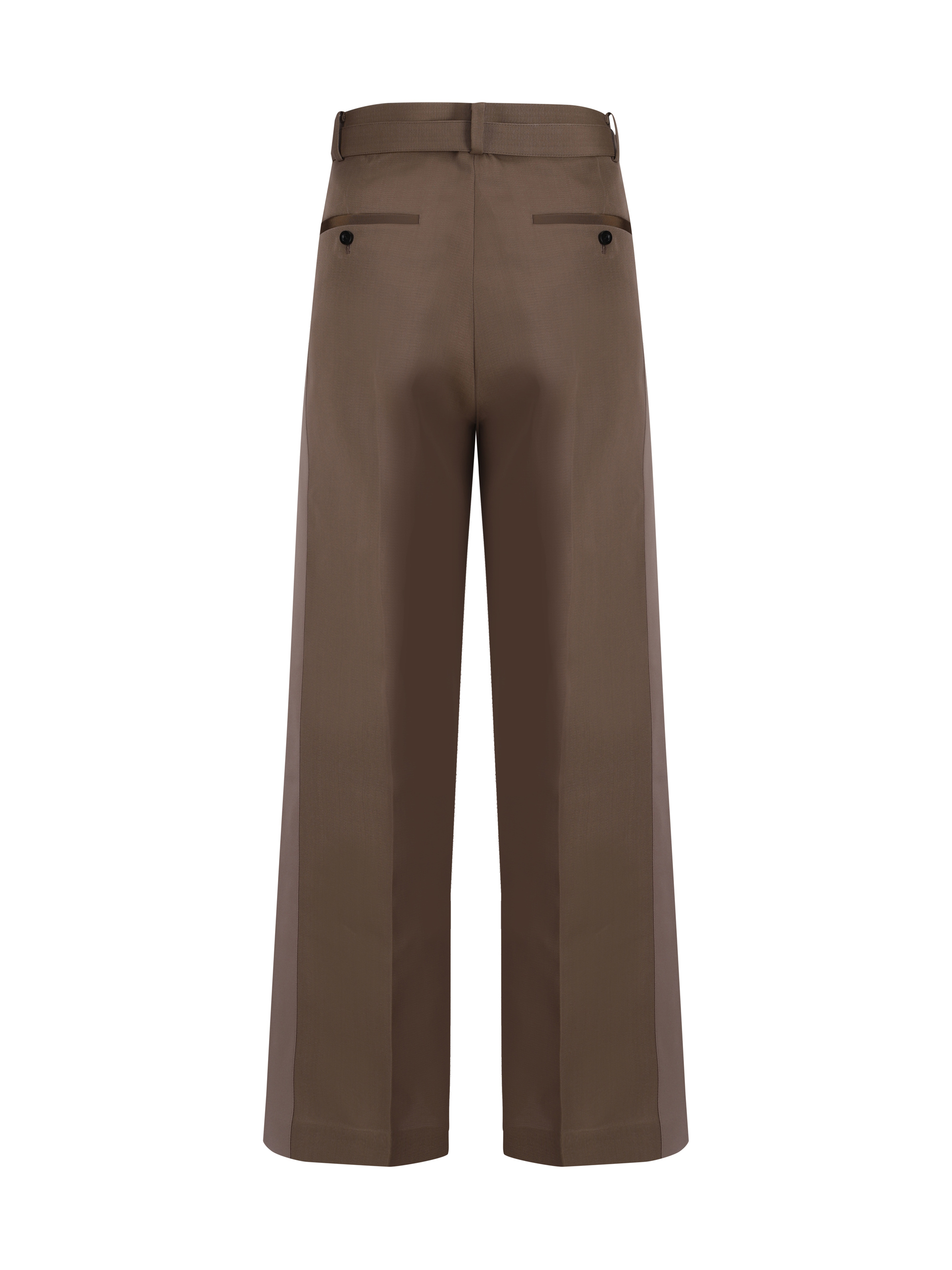 Silk Sacai pants, front zipper and hook-and-eye closure, two side welt pockets, two buttoned welt pockets on back, waistband loops, built-in and matching adjustable and removable belt, two contrasting side bands, regular fit.