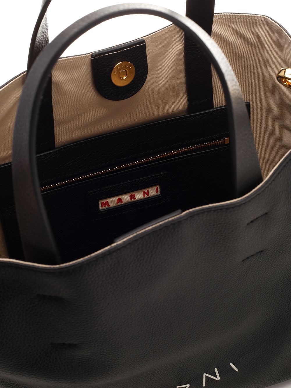 SKU B4502688 "Museo Soft" tote bag by Marni in black grained leather, with detachable shoulder strap with side hooks and adjustable with buckle, cotton drill interior, internal zip pocket. COD. SHMP0069L300N99