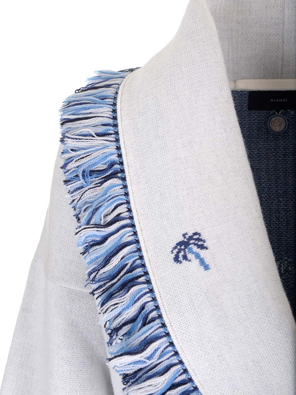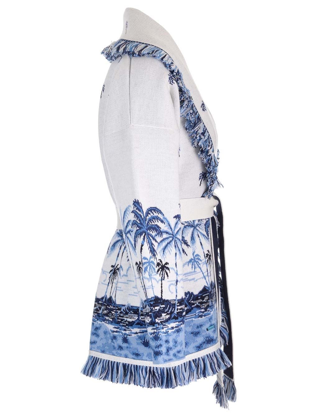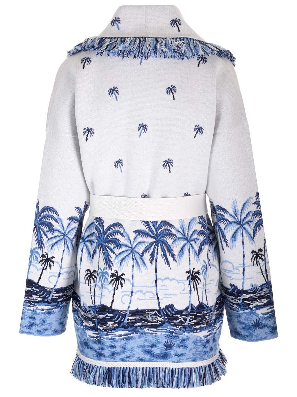 SKU B4506155 "The Tale of a Hawaiian" Merino wool cardigan with all-over palm tree dotted double jacquard landscape design from Alanui, featuring a two-tone self-tie belt and multi-coloured fringed edges. COD. LWHB064E24KNI00B0147