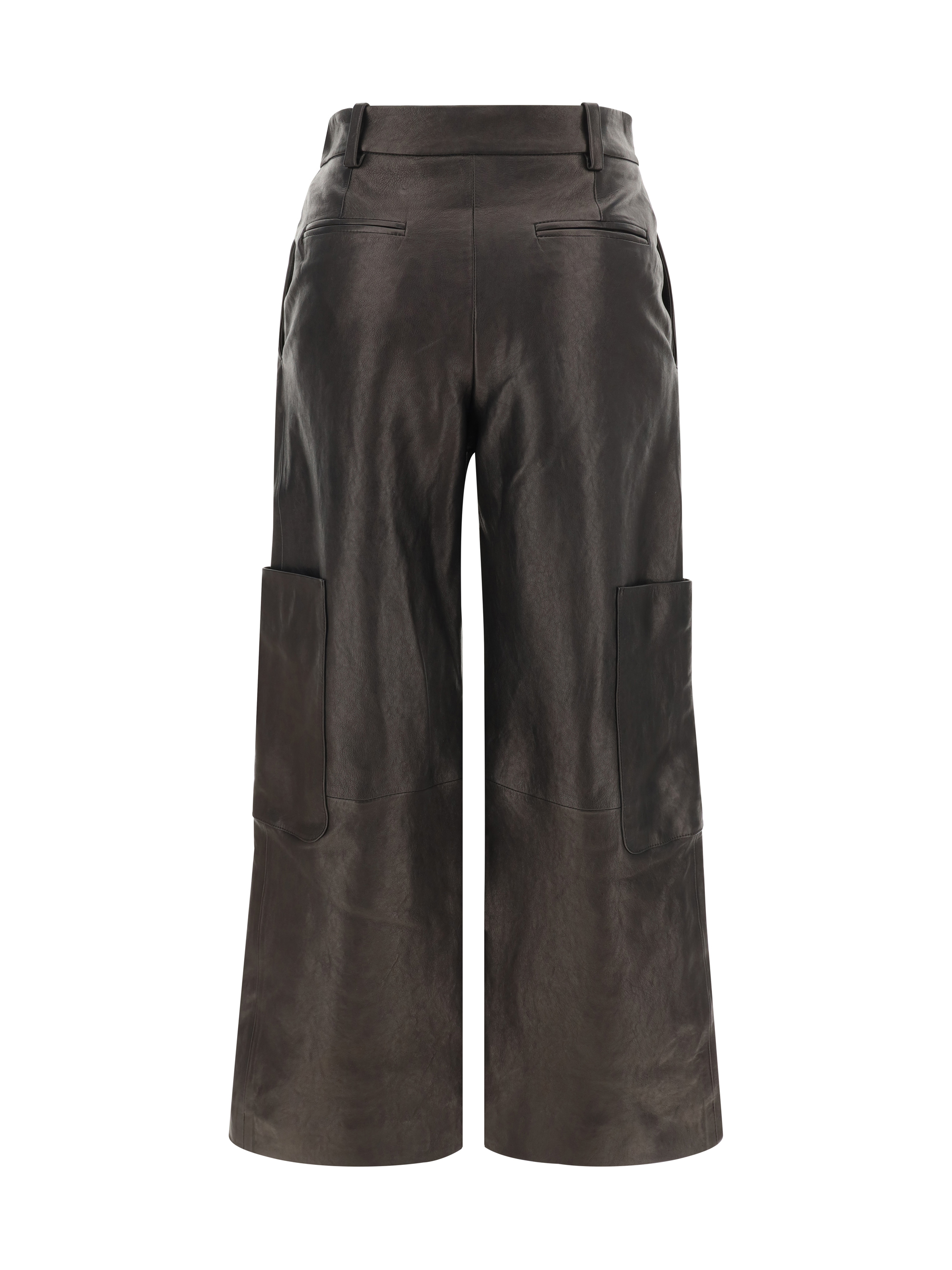 Leather Caiton Pants by Khaite, wide-leg style, zipper and button front closure, paneled design, two side slash pockets, two welt patch pockets on side panels, two back slit pockets, belt loops waistband, regular fit.