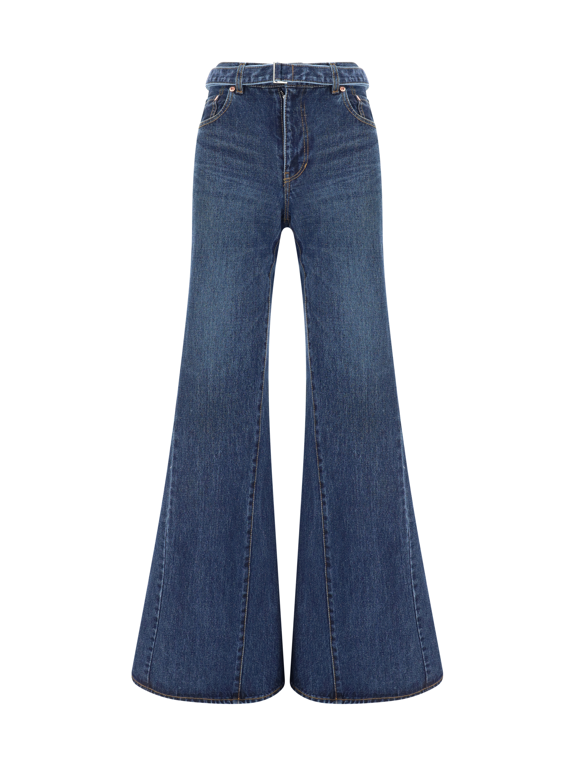 Cotton Jeans by Sacai, wide-leg five-pocket style, front button and zipper closure, belt loops for waistband, adjustable and removable matching belt, regular fit.