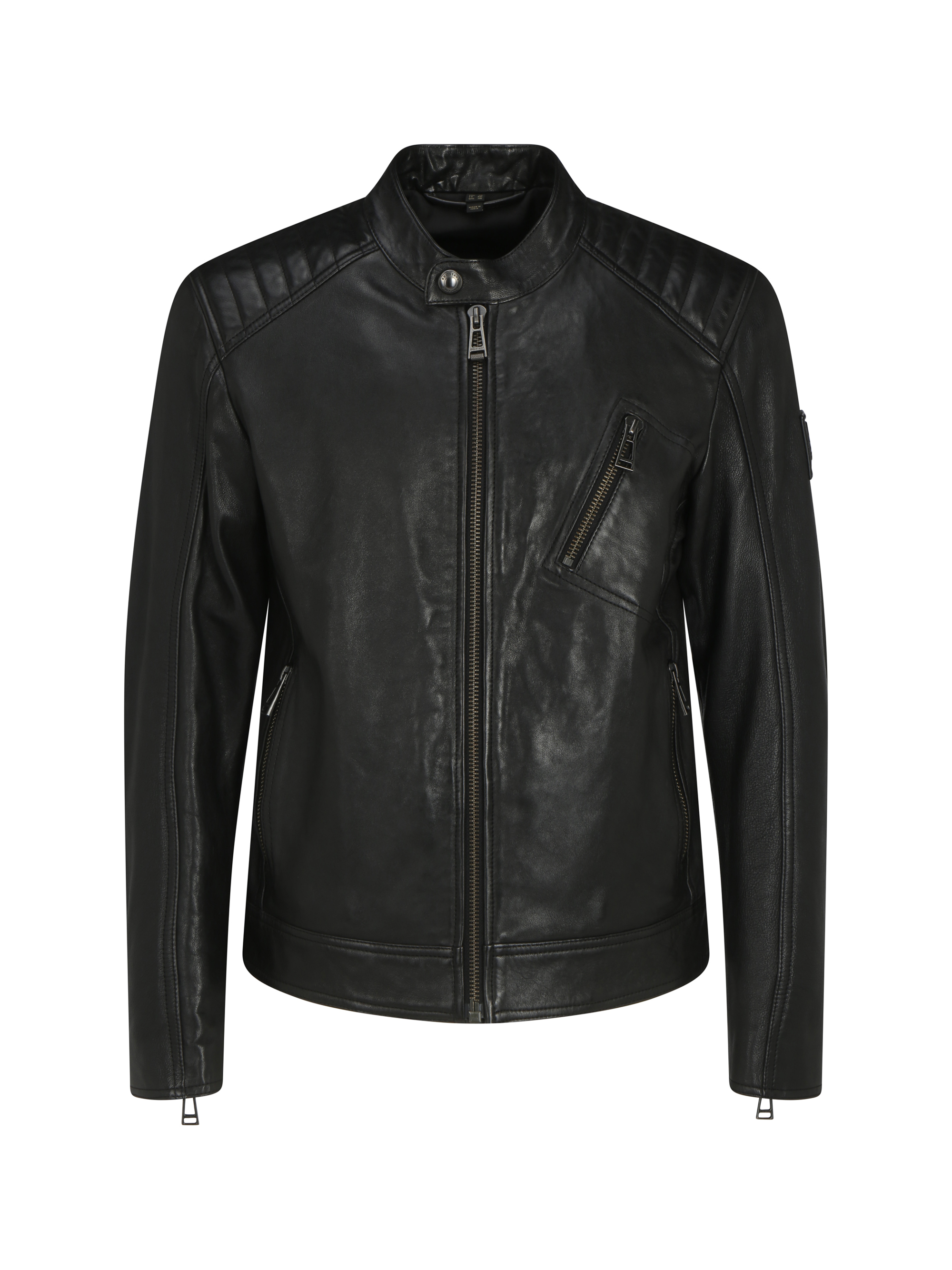 Lambskin V Racer Jacket by Belstaff, front zip closure, snap button on the crew neck, zippers applied on the sleeves, oblique welt pocket on the front, iconic patch with brand logo applied in relief on the left sleeve.