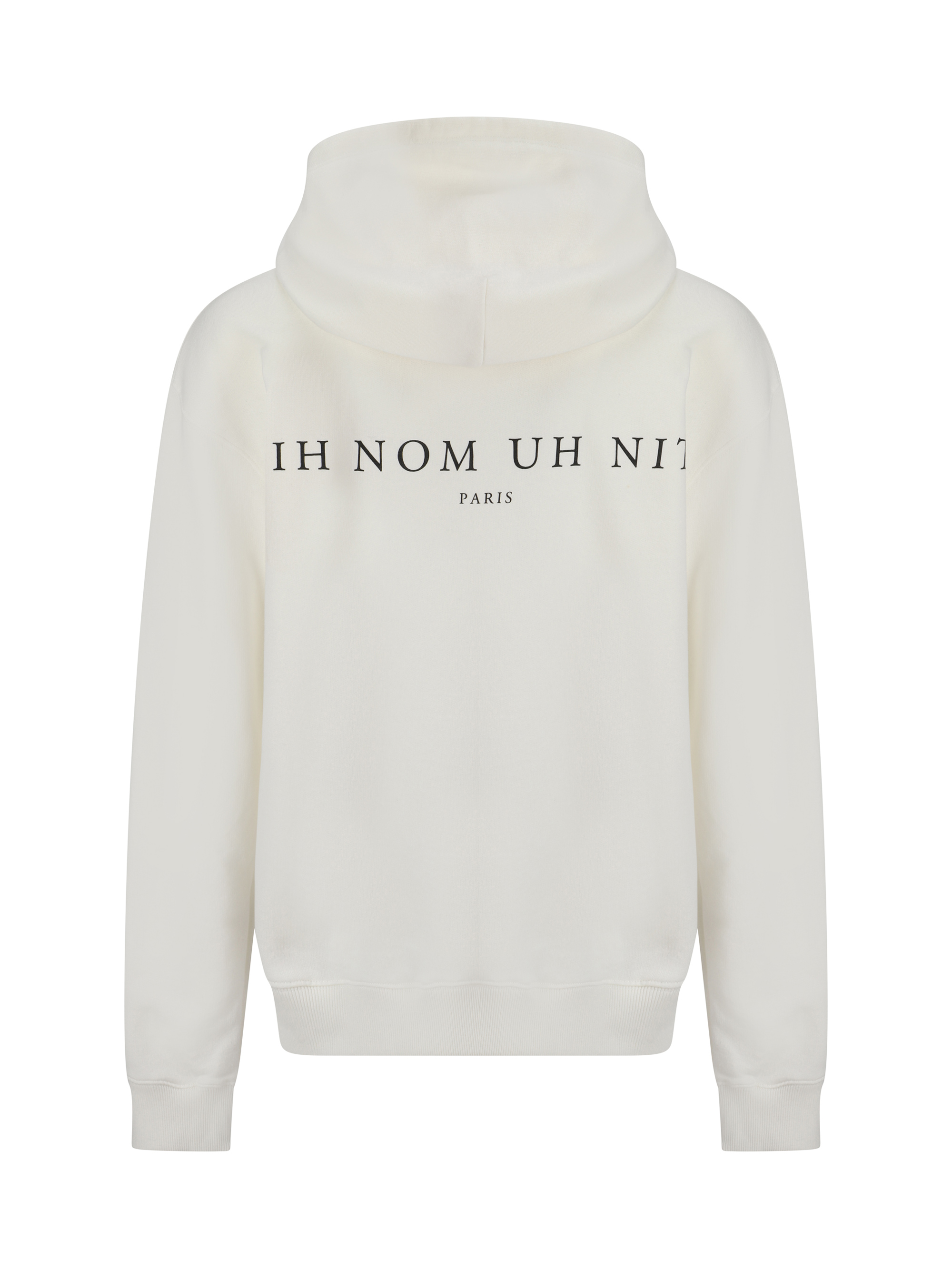 Cotton Mask Future Hoodie by Ih Nom Uh Nit features hood with adjustable drawstring, maxi print on front, front kangaroo pocket, contrasting iconic brand monogram on back, ribbed cuffs, ribbed hem, monochrome design, regular fit.
