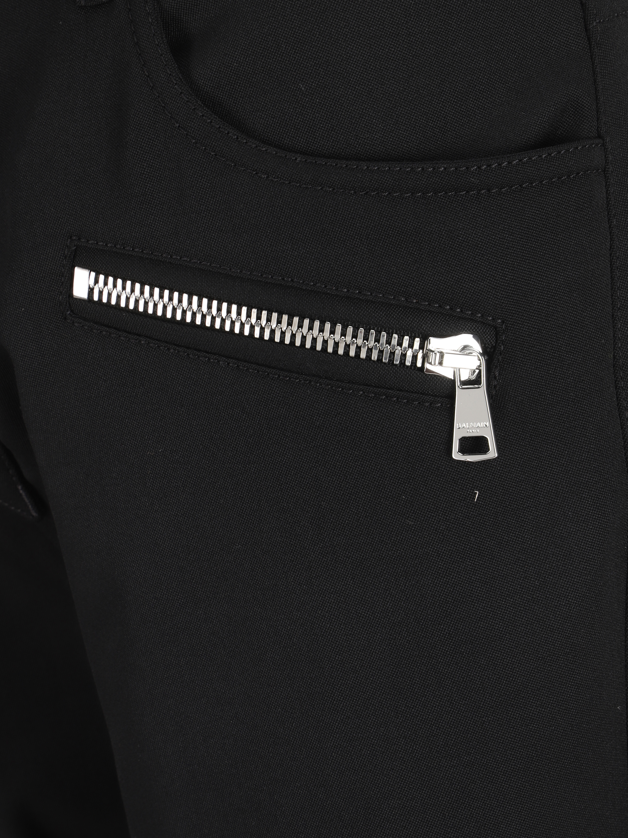 Biker Pants in Lana Vergine by Balmain, five-pocket style, two front welt pockets with zipper, embossed stripe detail at knees, monochrome pattern, close fit.